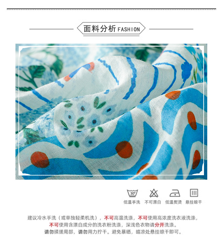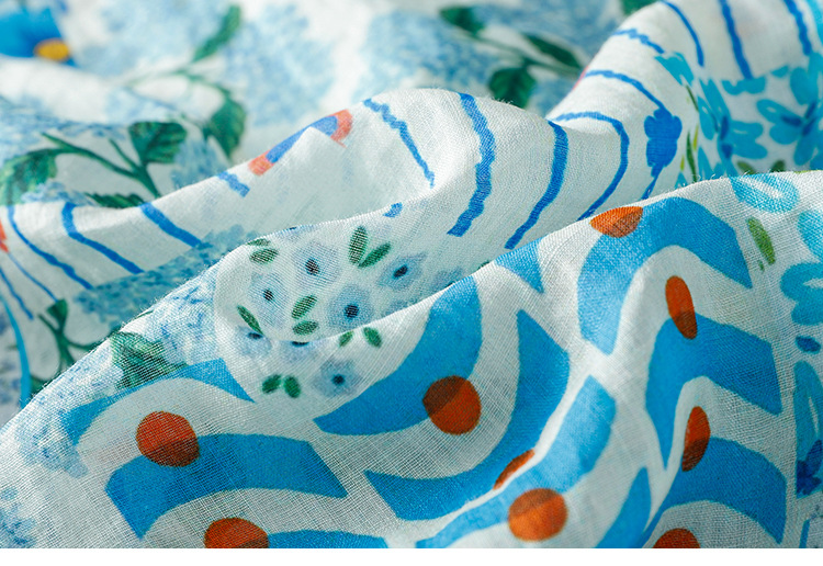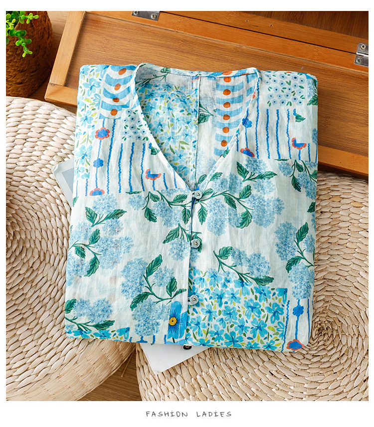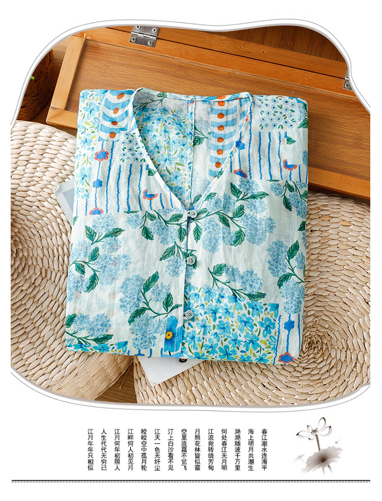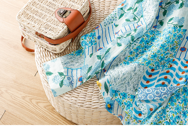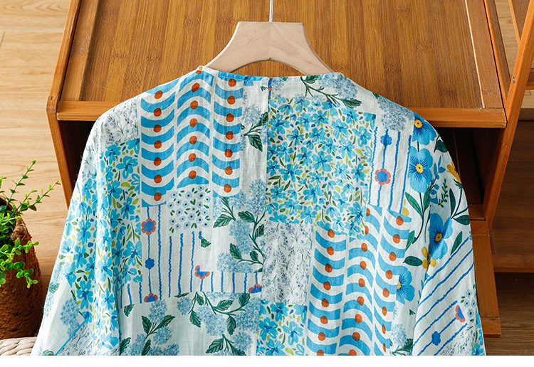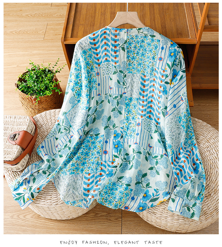 雀说文艺度假风宽松大码女装显瘦v领蓝色碎花长袖衬衫AL9358