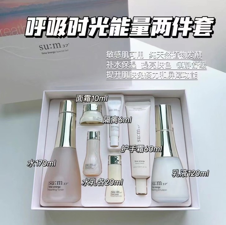 👑呼吸时光水乳两件套 👍新款企划套盒 💎有效:改善肌肤问题、收缩毛孔、补水保湿、提亮肤色、深层修复、美白祛黄 ✨纯天然植物发酵而成,配方温和,孕妇敏感肌都可用! ⭐适合皮肤干燥缺水、皮肤不光滑、暗淡无光的人群使用 【套盒包括】:水170ml+乳120ml+水乳各20ml+护手霜60ml+面霜10ml+隔离6ml