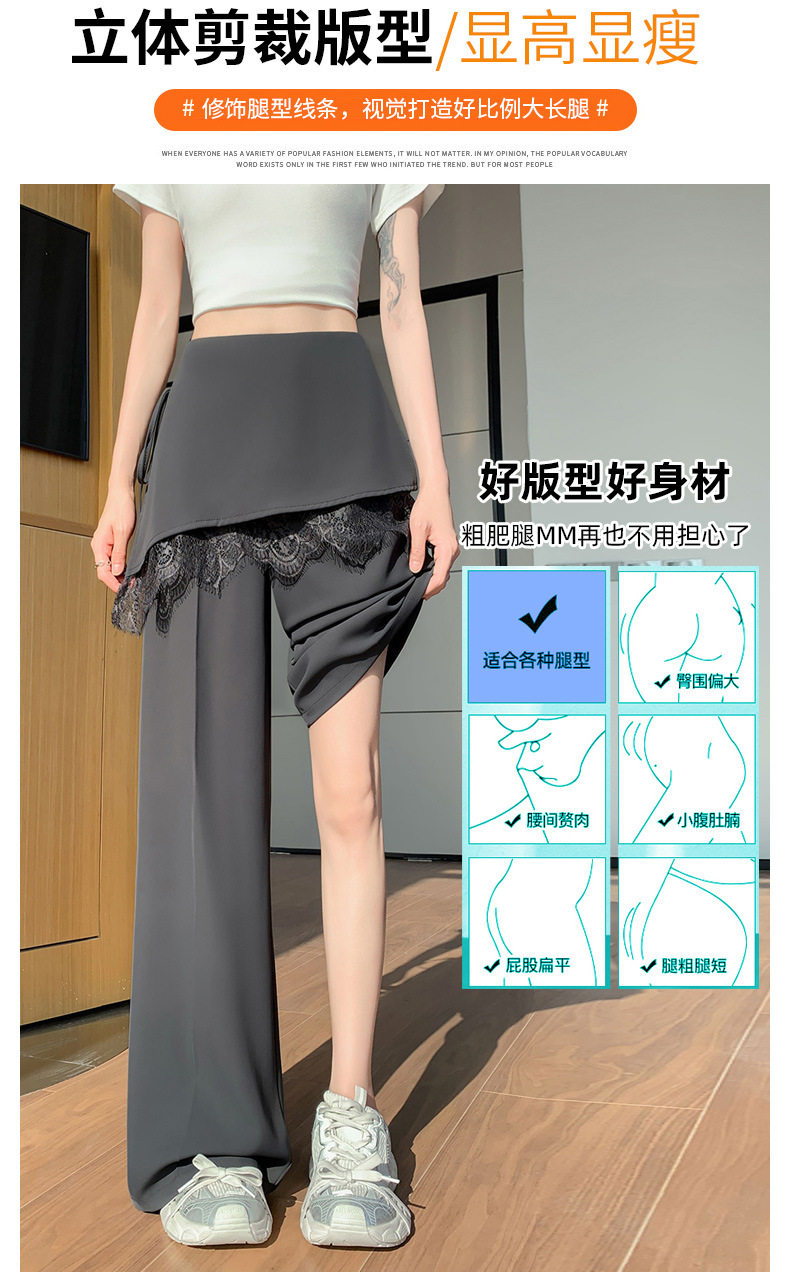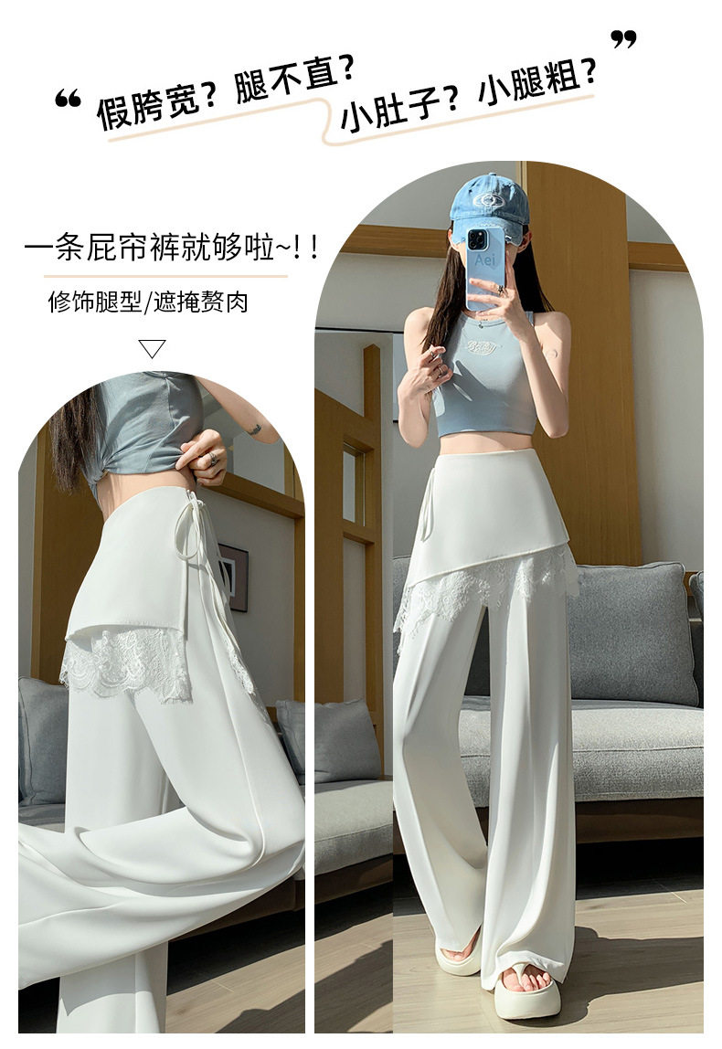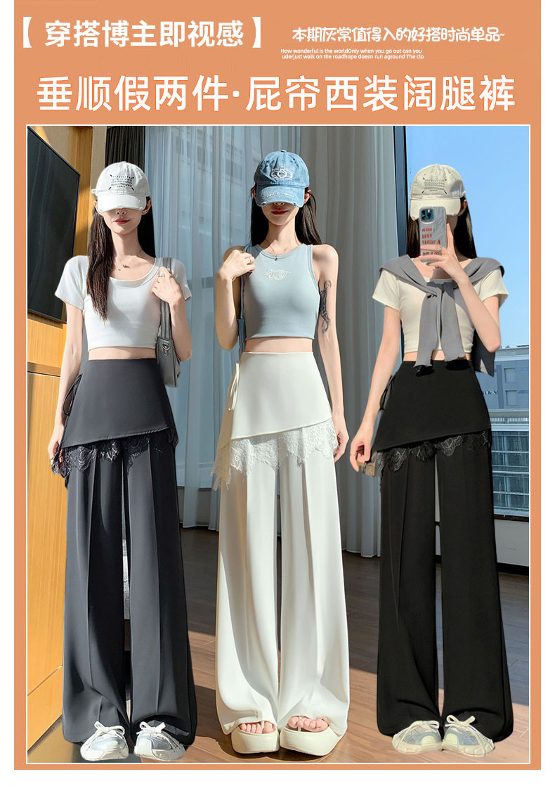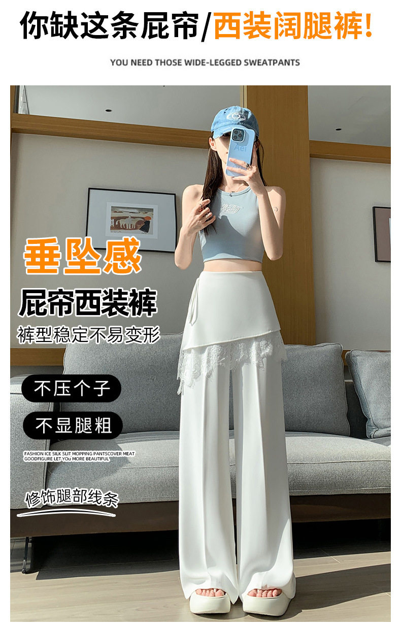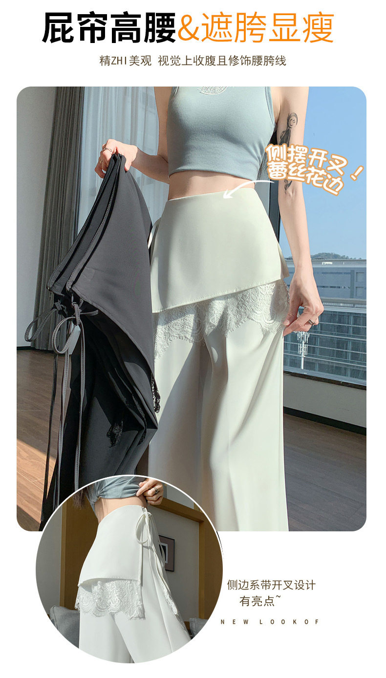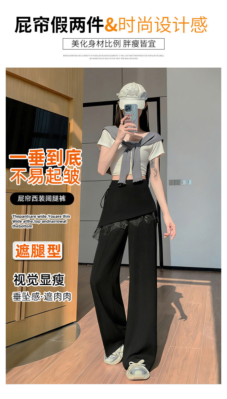 假两件蕾丝拼接屁帘阔腿裤女夏季高腰显瘦西装休闲直筒拖地裤 NDK-B2028