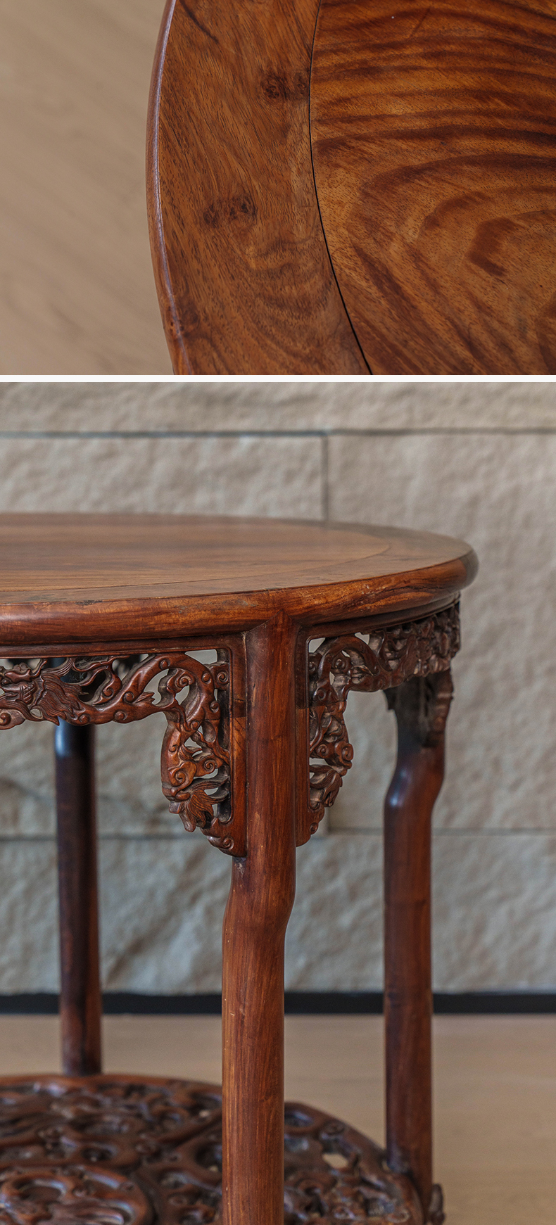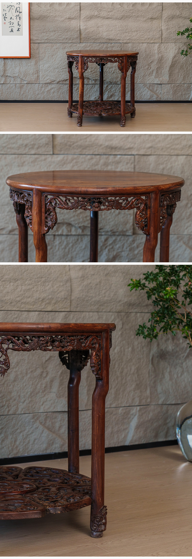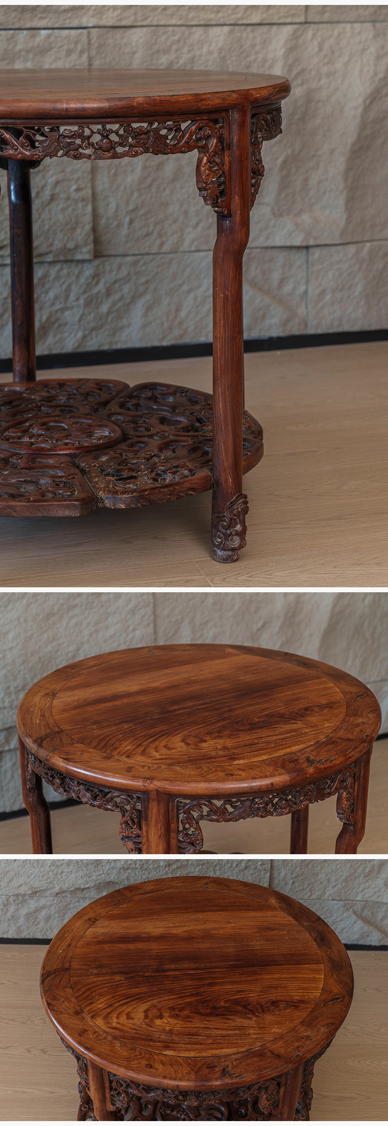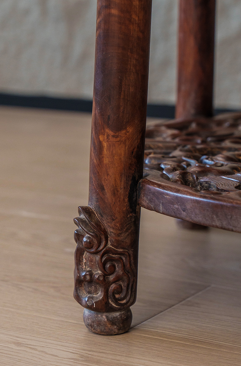 清 红木透雕龙纹五足圆桌