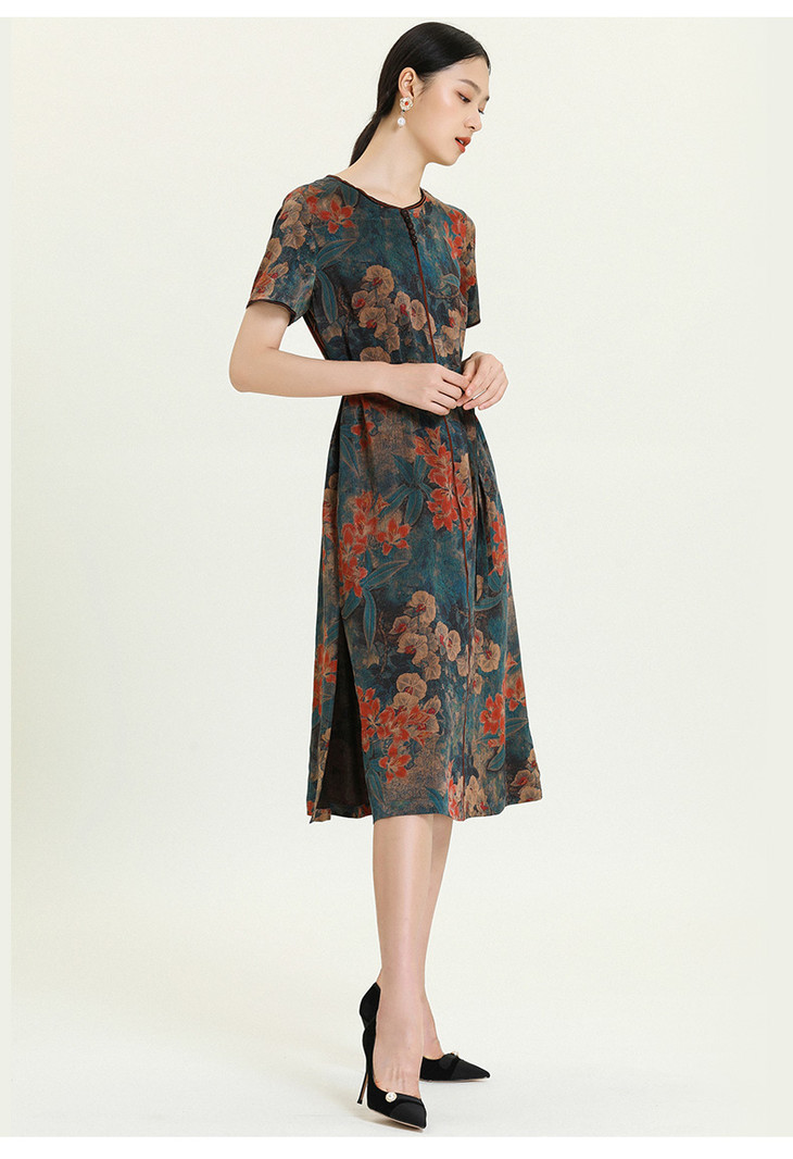 【香云纱】乔万尼真丝连衣裙女夏季复古印花气质显瘦桑蚕丝长裙ES2E102