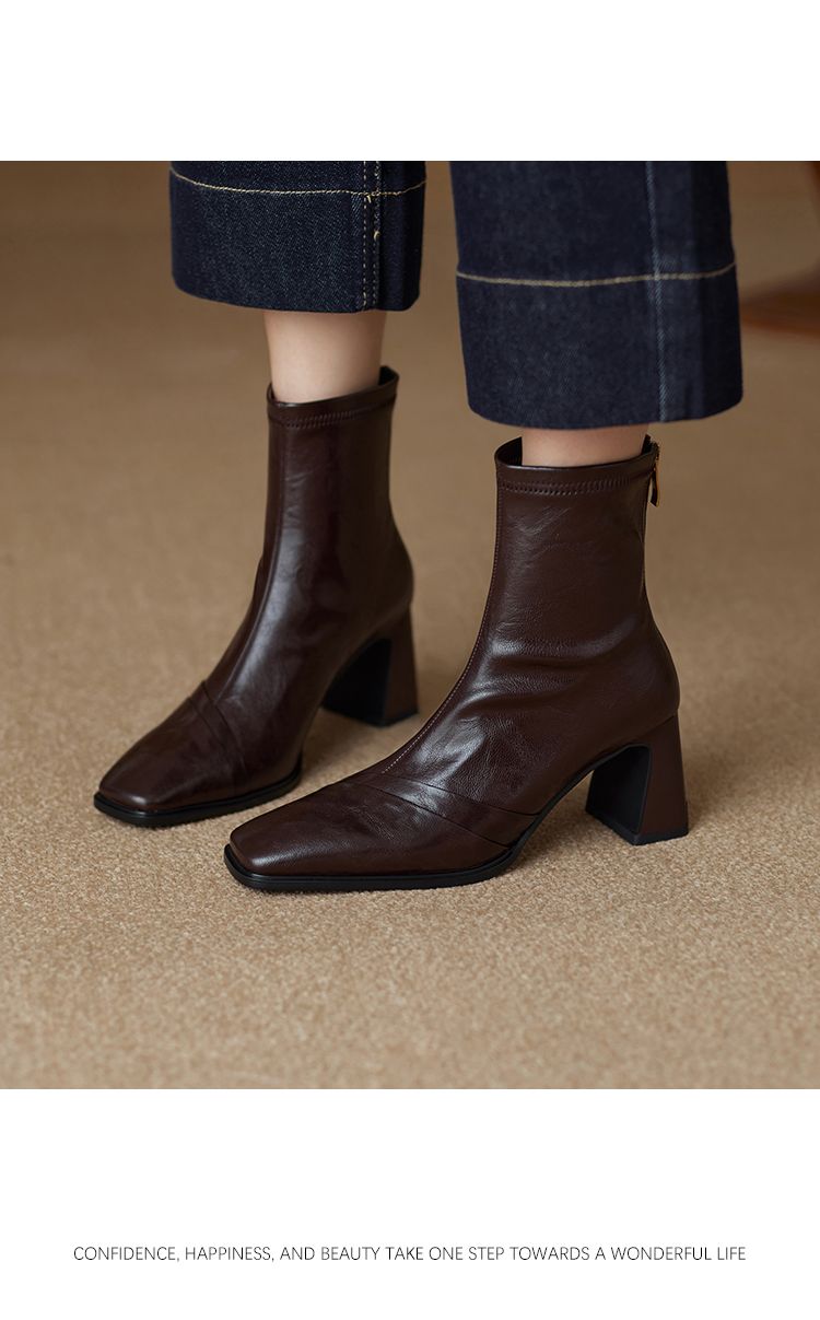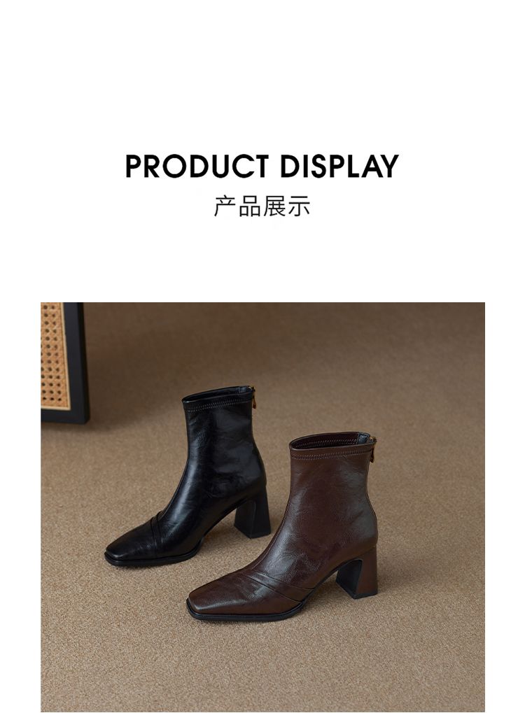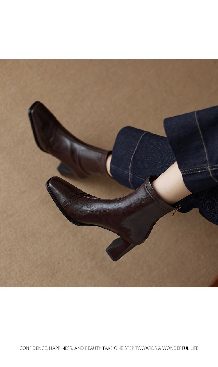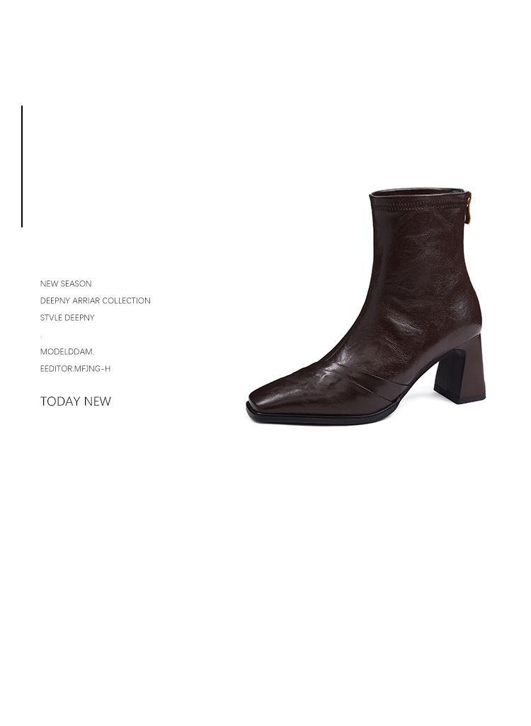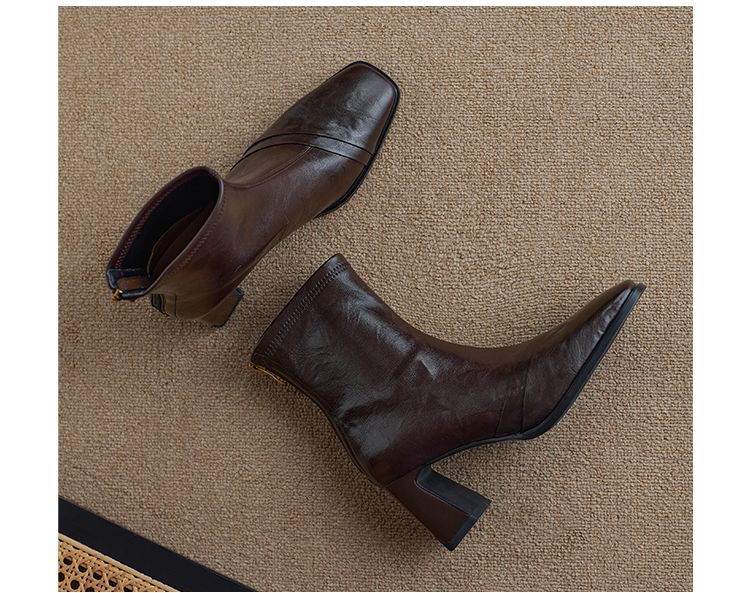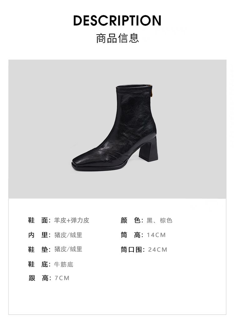 【预售5天】法式复古美拉德棕色弹力瘦瘦短靴秋冬新款时尚方头粗跟高跟单靴b7296