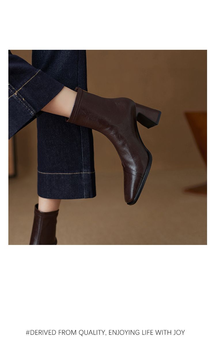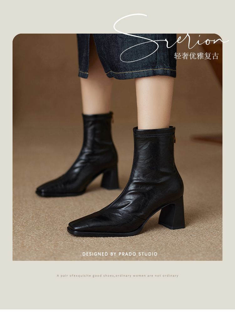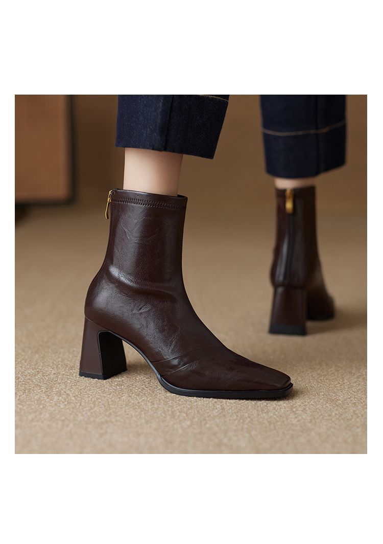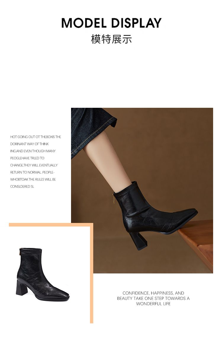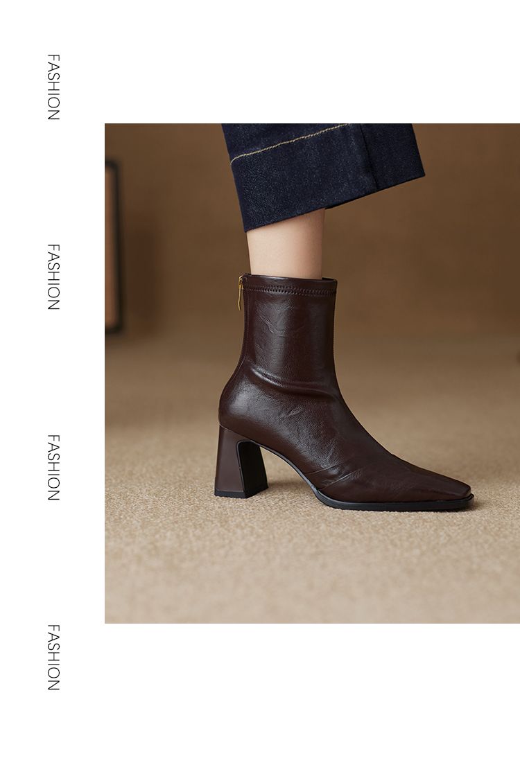 【预售5天】法式复古美拉德棕色弹力瘦瘦短靴秋冬新款时尚方头粗跟高跟单靴b7296
