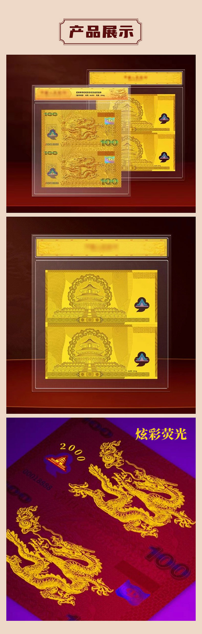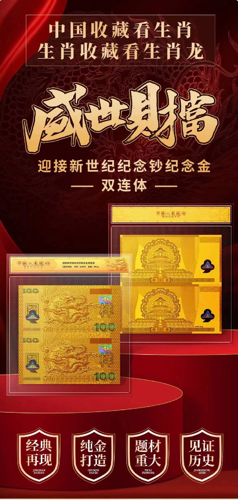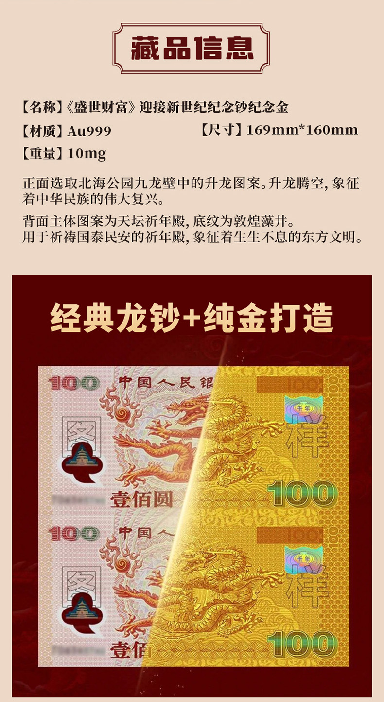 《盛世财富》2000年迎接新世纪纪念钞纪念金双连体 千禧龙钞双连体纯金版