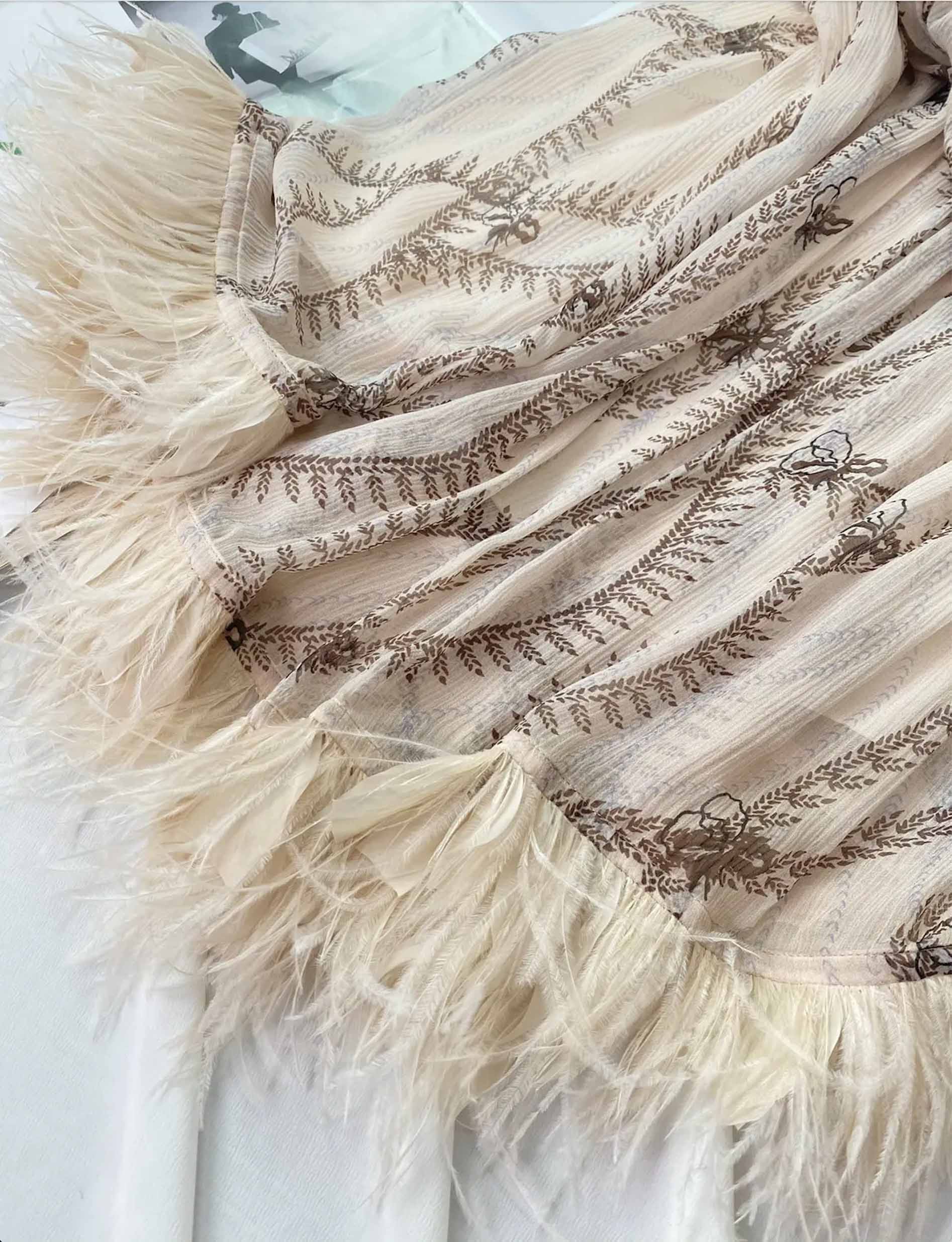 下摆缀满法式驼鸟毛,柔软轻盈,上身飘逸灵动,满满都是法式浪漫de高级感,时尚感up up up!整体贵气外泄,走起路来,带风飘逸,浪漫又仙气~