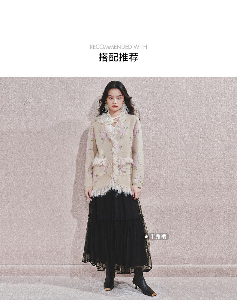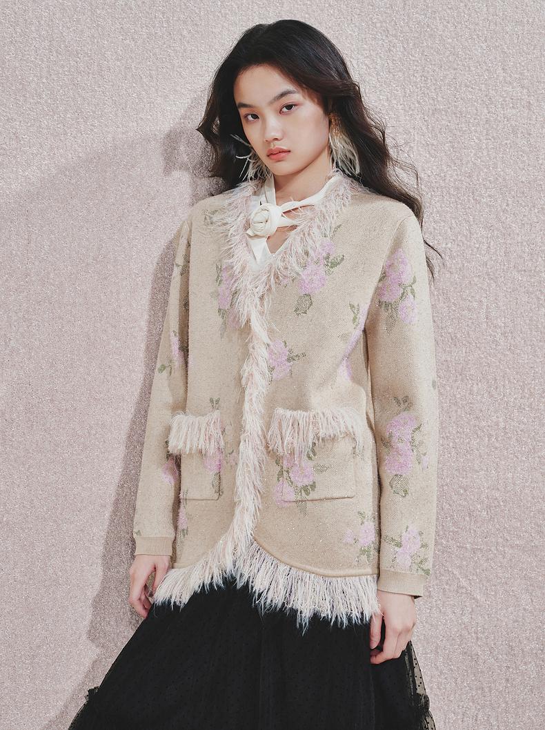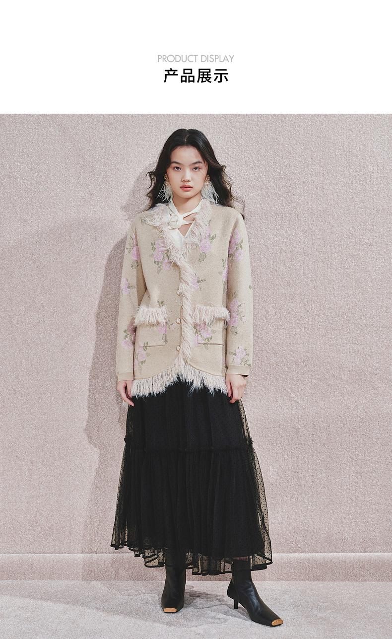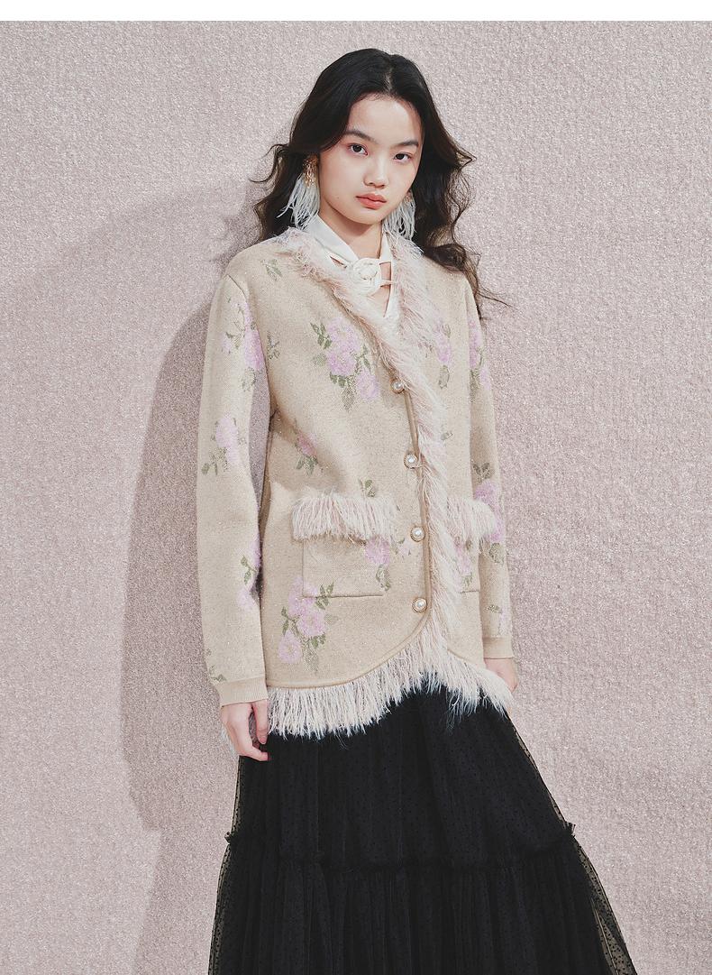 MAXRIENY 浪漫印花复古针织外套女慵懒感气质毛条珍珠扣24冬(货号:MF85JA751)