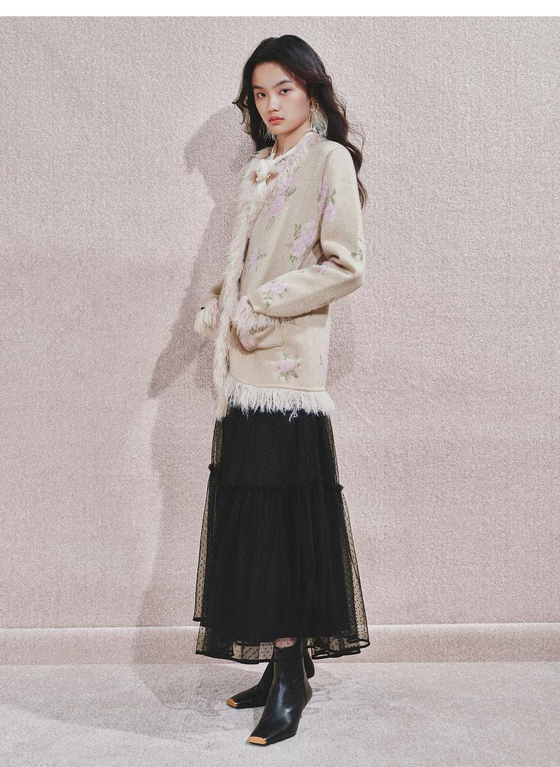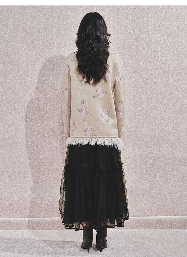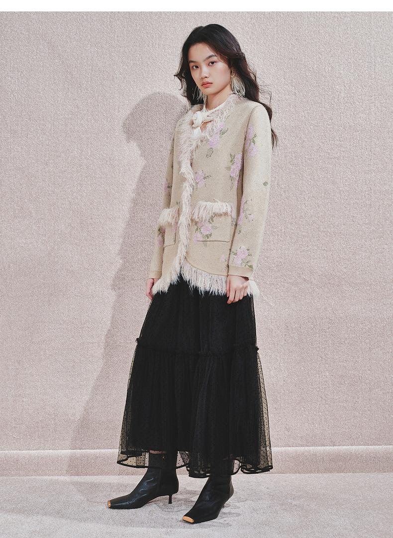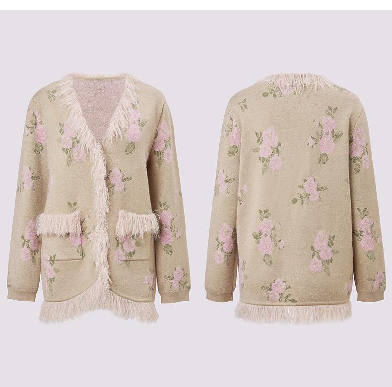 MAXRIENY 浪漫印花复古针织外套女慵懒感气质毛条珍珠扣24冬(货号:MF85JA751)