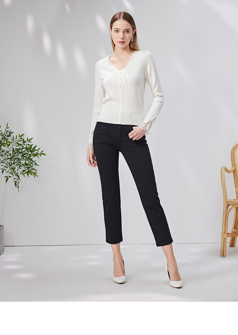 EITIE爱特爱网纱拼接半高领气质黑色针织衫灯笼袖修身秋新款C2201022
