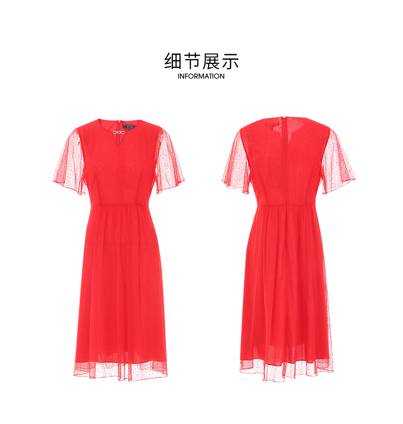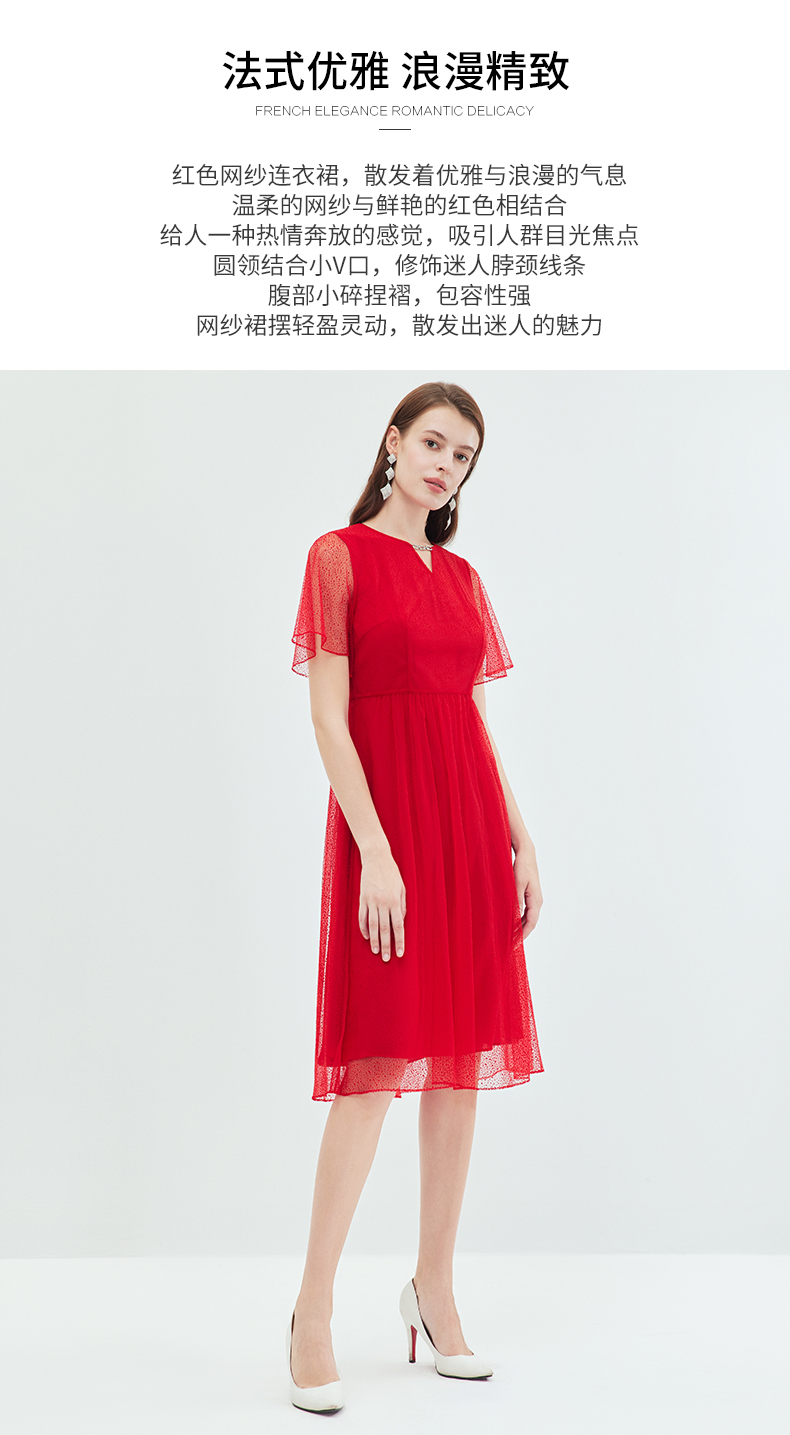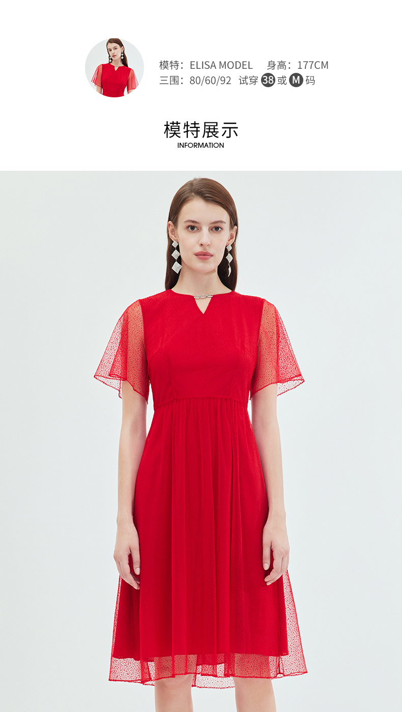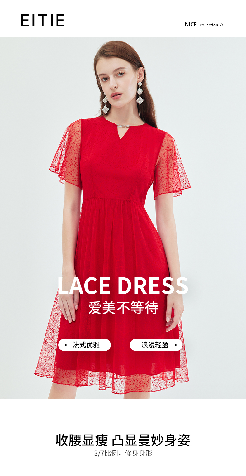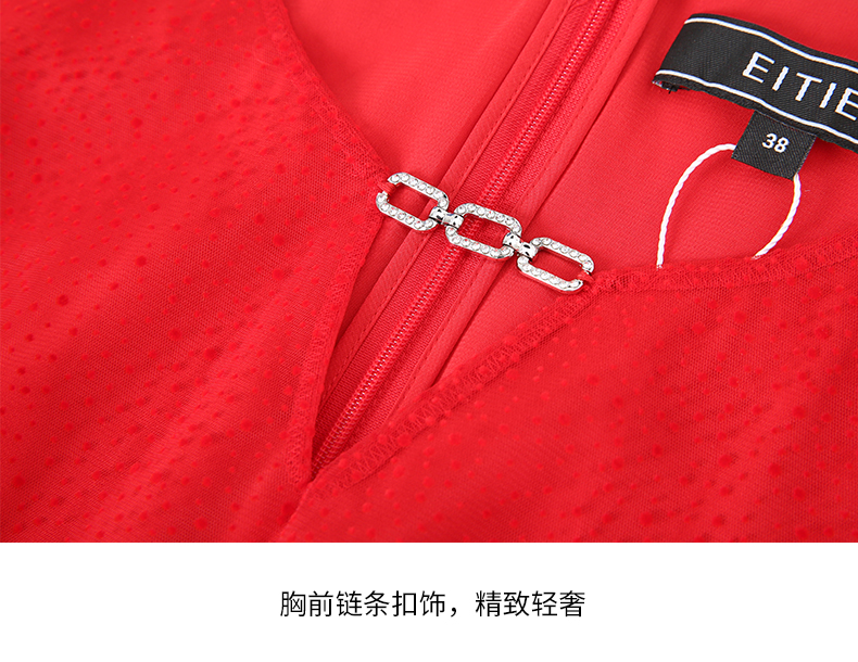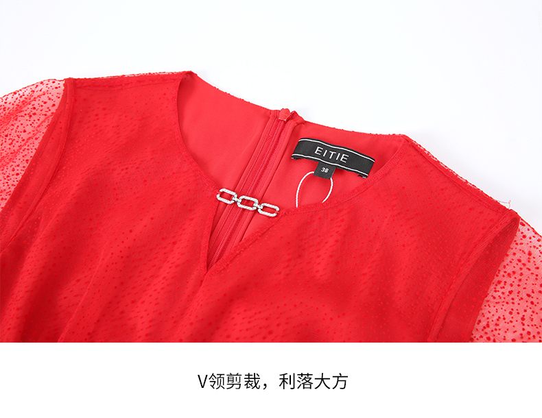 EITIE爱特爱法式优雅精致收腰绣花V领红色连衣裙夏季新款B07182