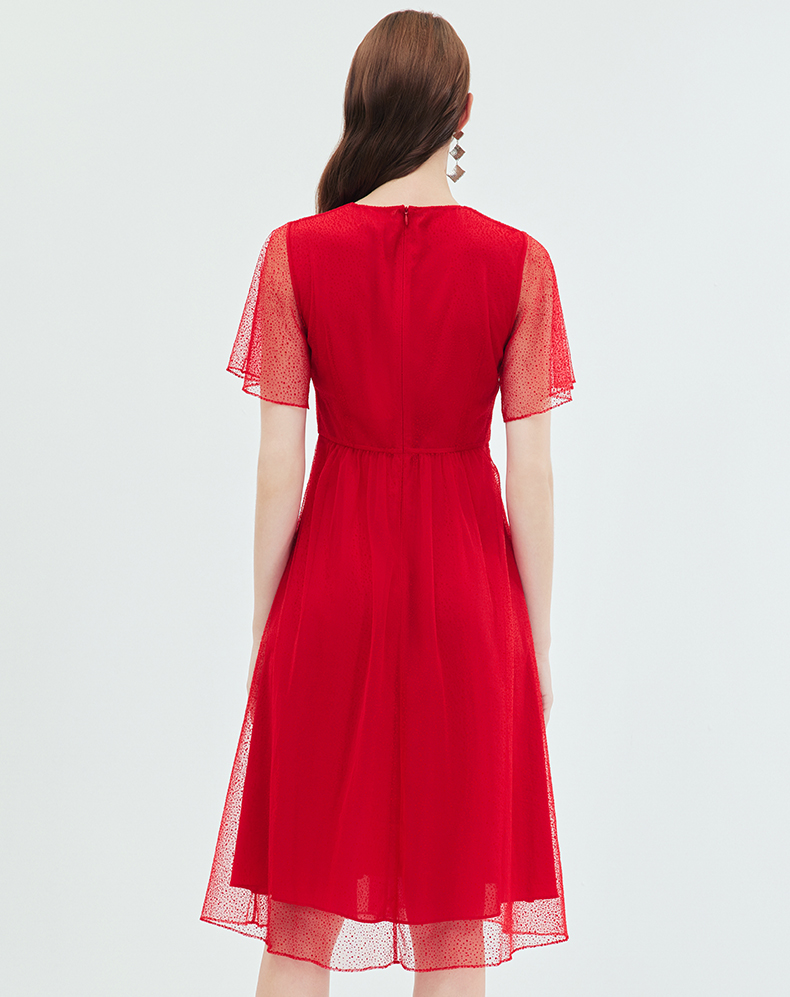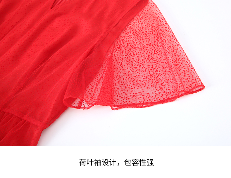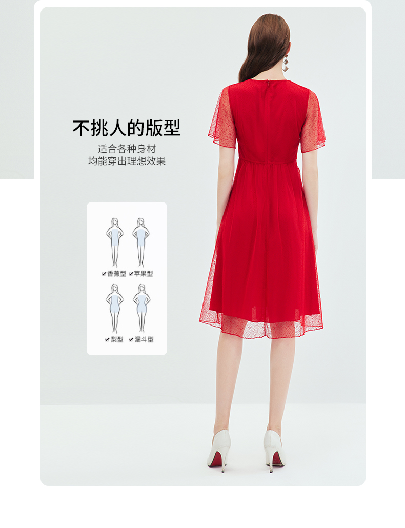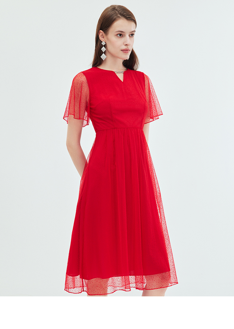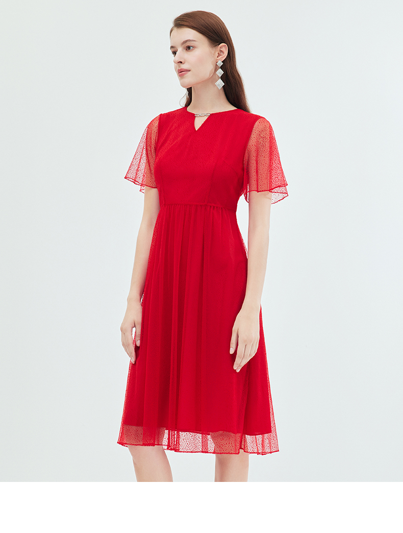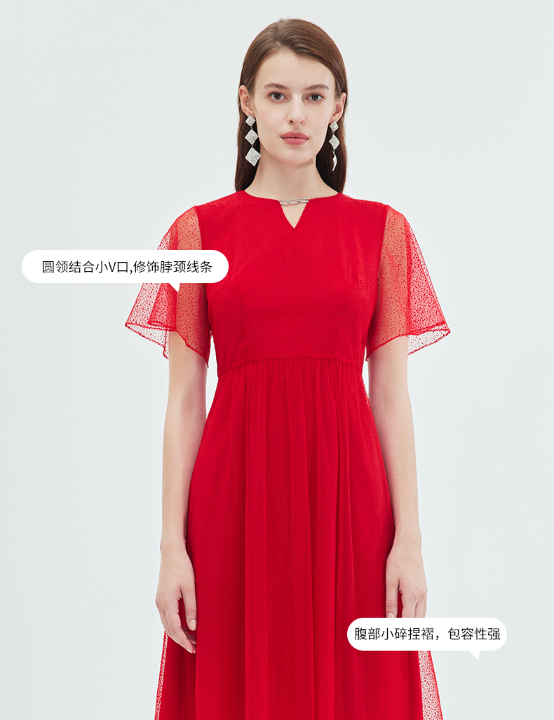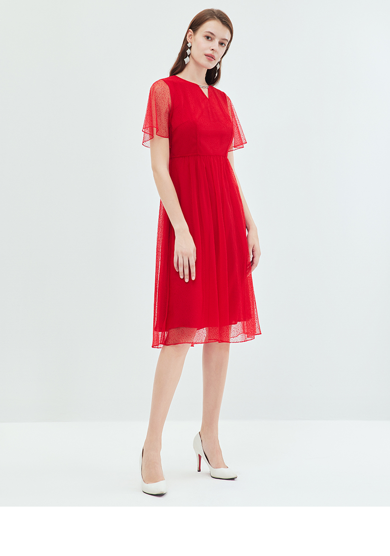 EITIE爱特爱法式优雅精致收腰绣花V领红色连衣裙夏季新款B07182