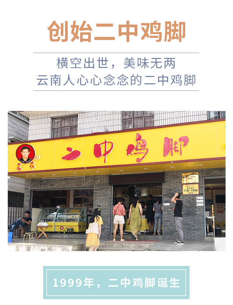- “二中鸡脚’’是云南普洱的苏建云&金建华夫妇于1999年在思茅二中(现普洱一中)门口售卖自家精心制作的私房鸡脚,因为美味独特让人食指大动而名声大噪,从而得名“二中鸡脚”(意为二中门口售卖的鸡脚)