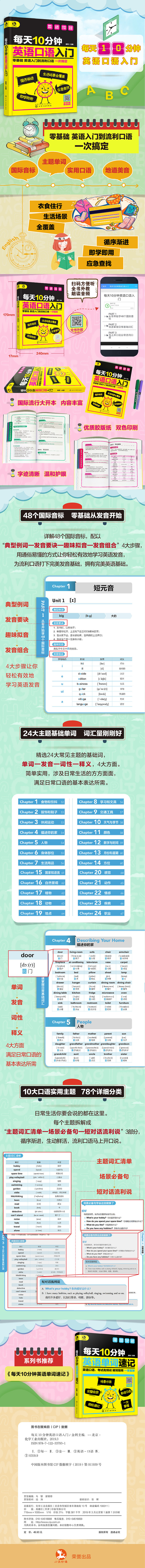 【48个国际音标,零基础从发音开始】 详解48个国际音标,配以“典型例词——发音要诀——趣味拟音——发音组合”4大步骤,用通俗易懂的方式让你轻松有效地学习英语发音,为流利口语打下完美发音基础,拥有完美英语基础。 【24大主题基础单词,词汇量刚刚好】 精选24大常见主题的基础词,简单实用,涉及日常生活的方方面面,满足日常口语的基本表达所需。 【10大口语实用主题,78个详细分类】 日常生活你要会说的都在这里。每个主题拆解成“主题词汇清单——场景必备句——短对话流利说”3部分,循序渐进,生动鲜活,流利口语马上开口说。