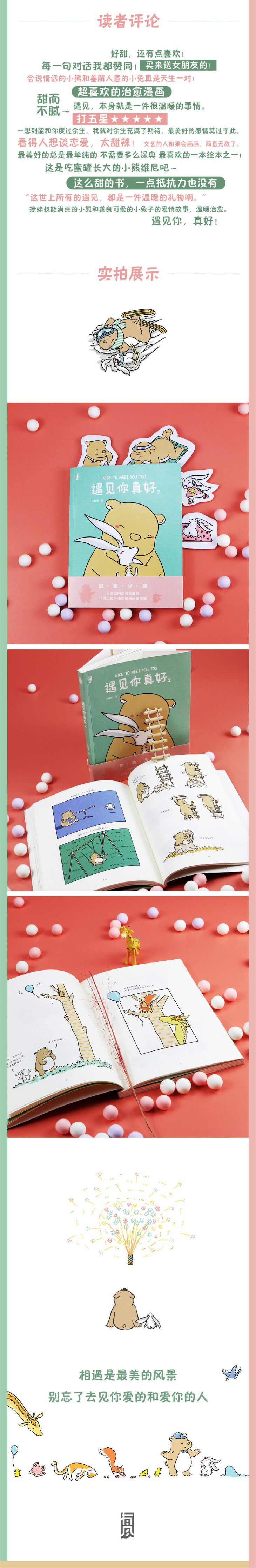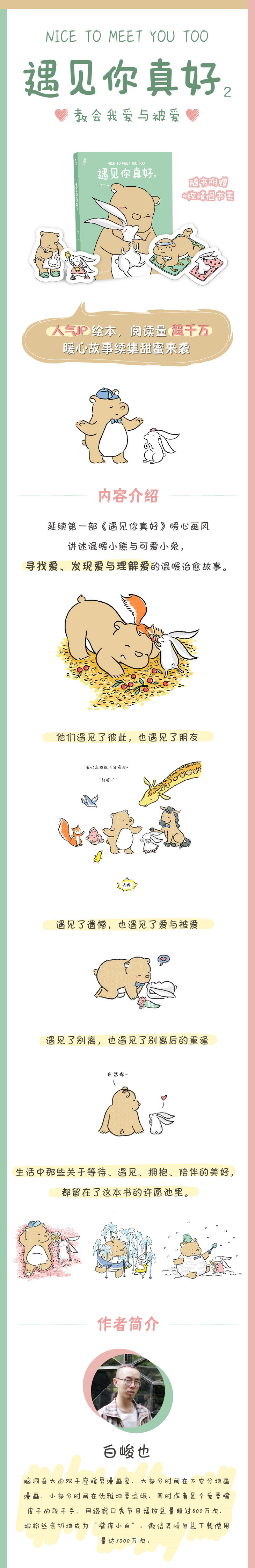 本书延续了《遇见你真好》第一部的暖心画风,讲述温暖的小熊与可爱的小兔,寻找爱、发现爱与理解爱的温暖治愈故事。
