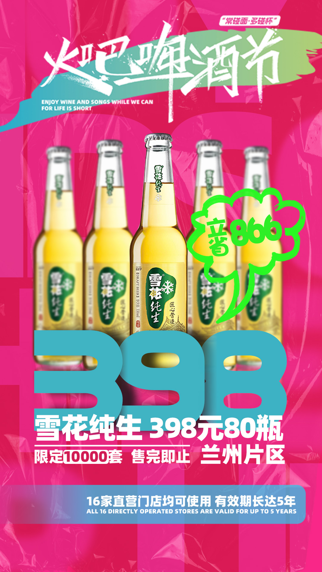 兰州片区-8月18日火吧啤酒节—超值存酒卡来了—398元80瓶雪花纯生啤酒