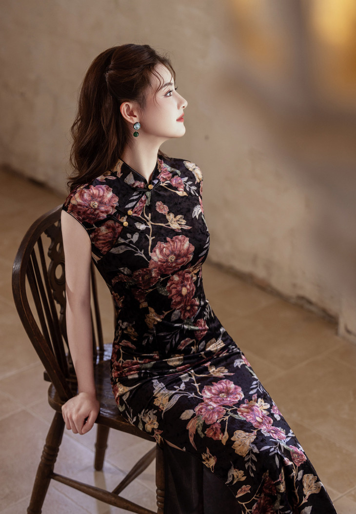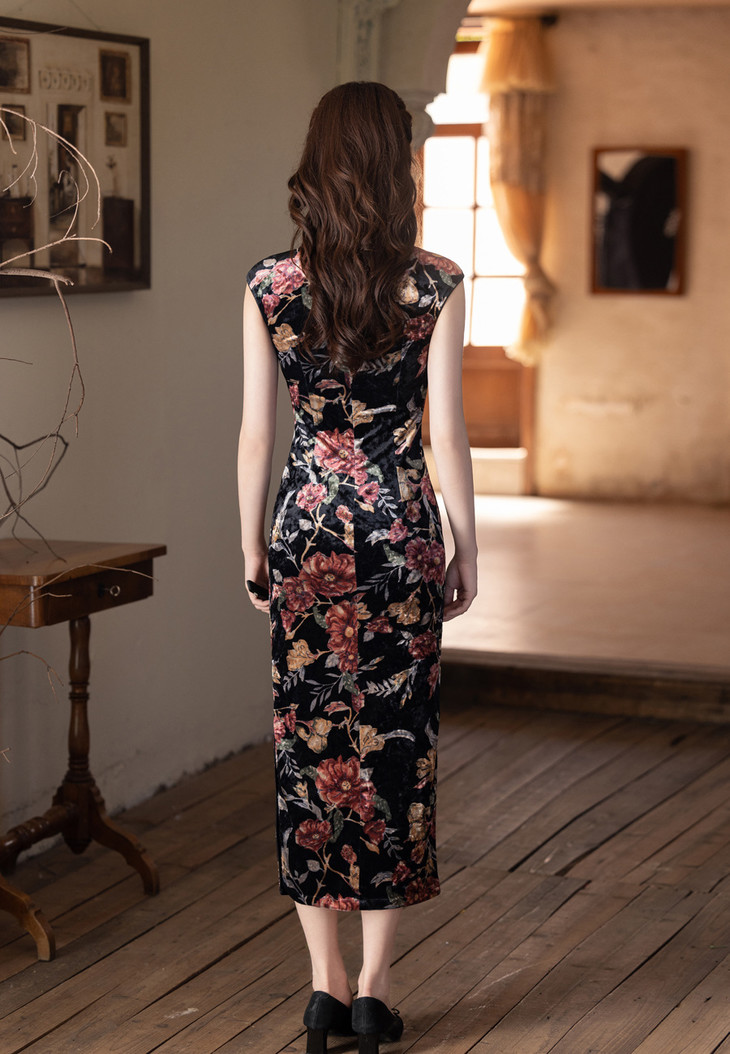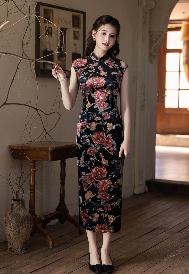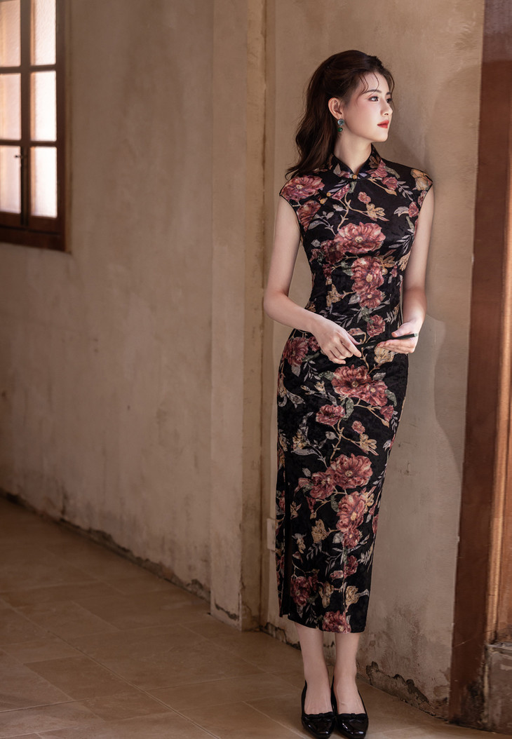 复古港风无袖旗袍,钻石绒印花长款连衣裙MYJ-257