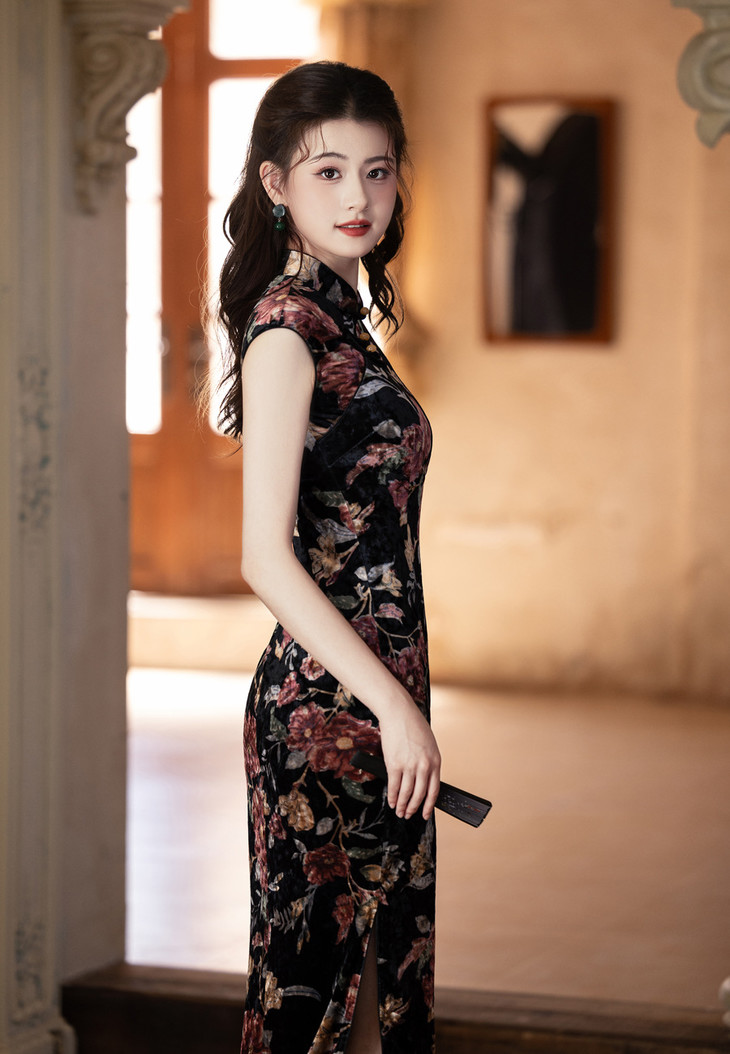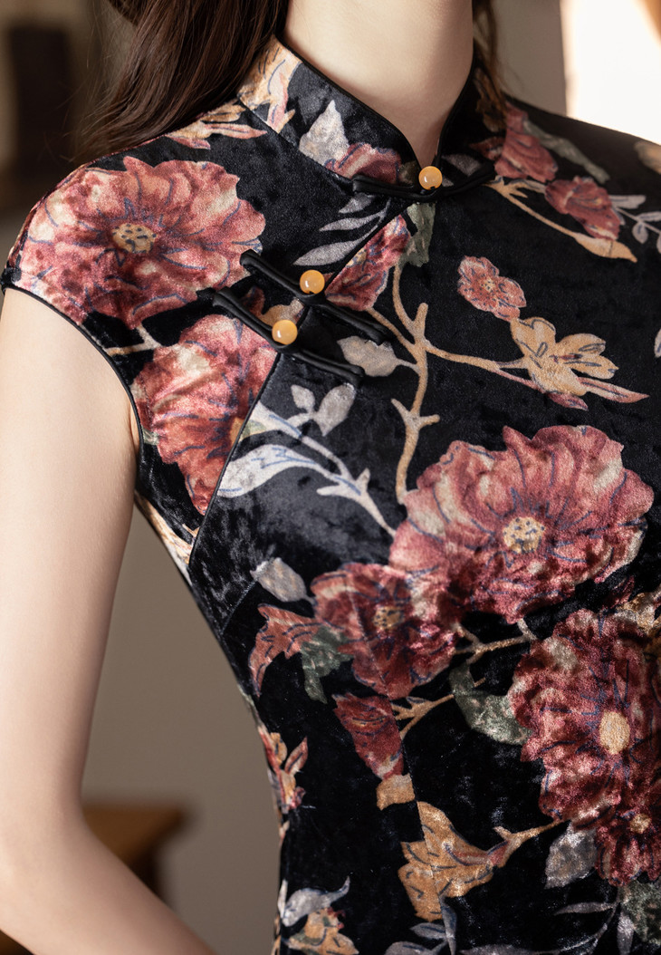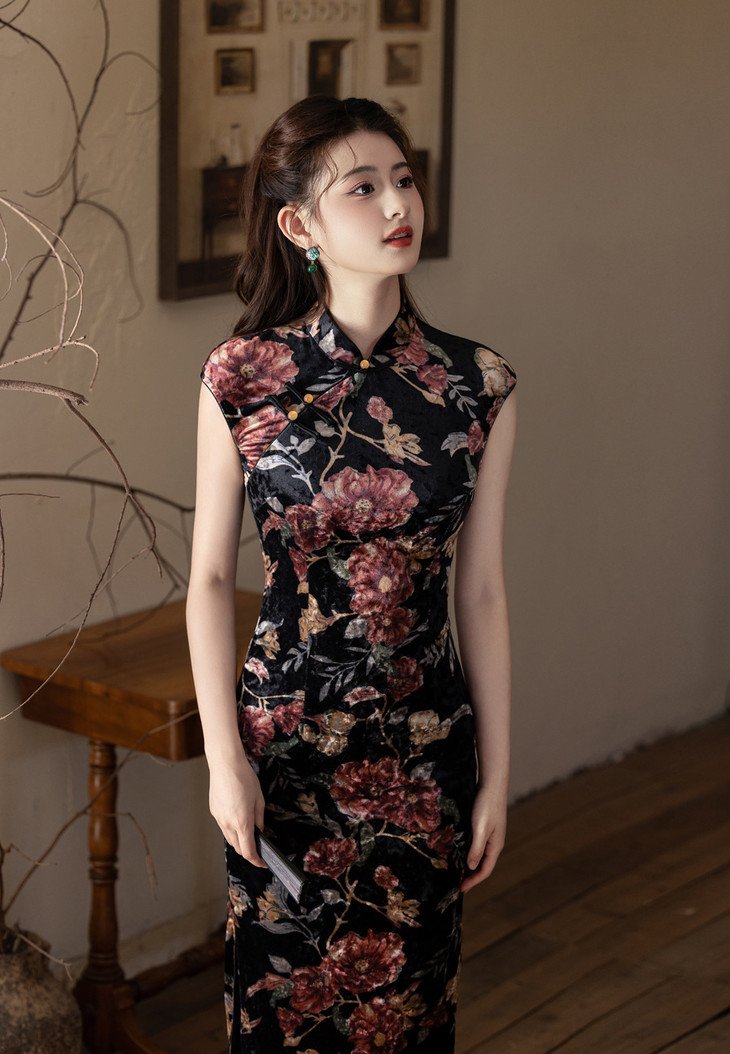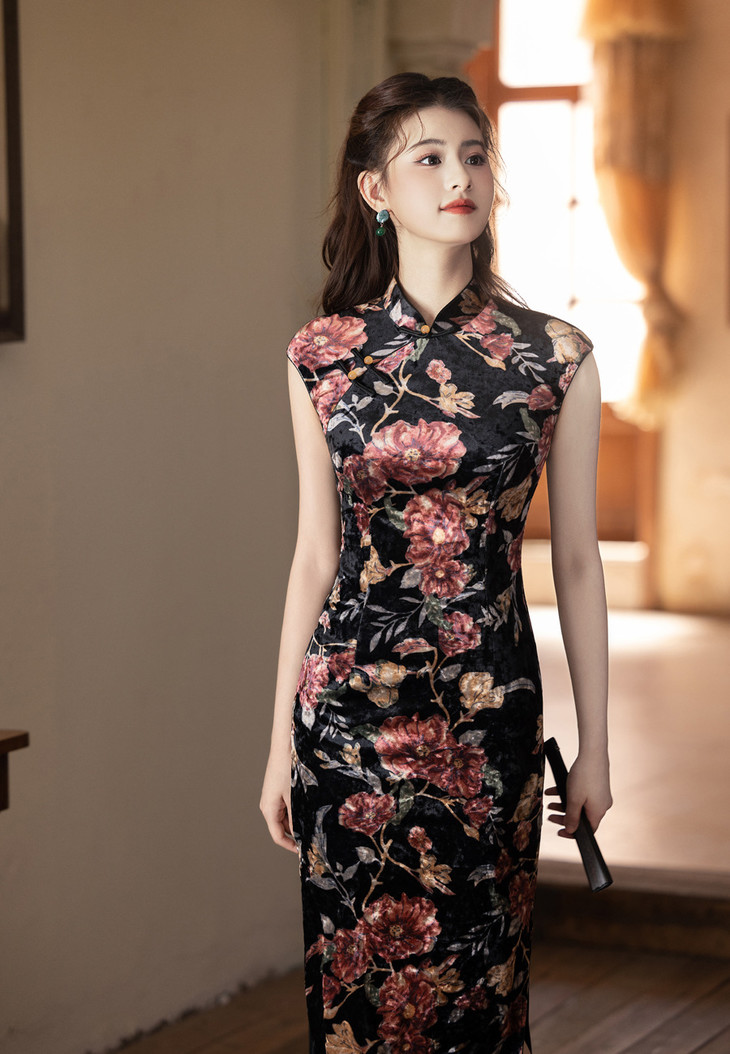 复古港风无袖旗袍,钻石绒印花长款连衣裙MYJ-257