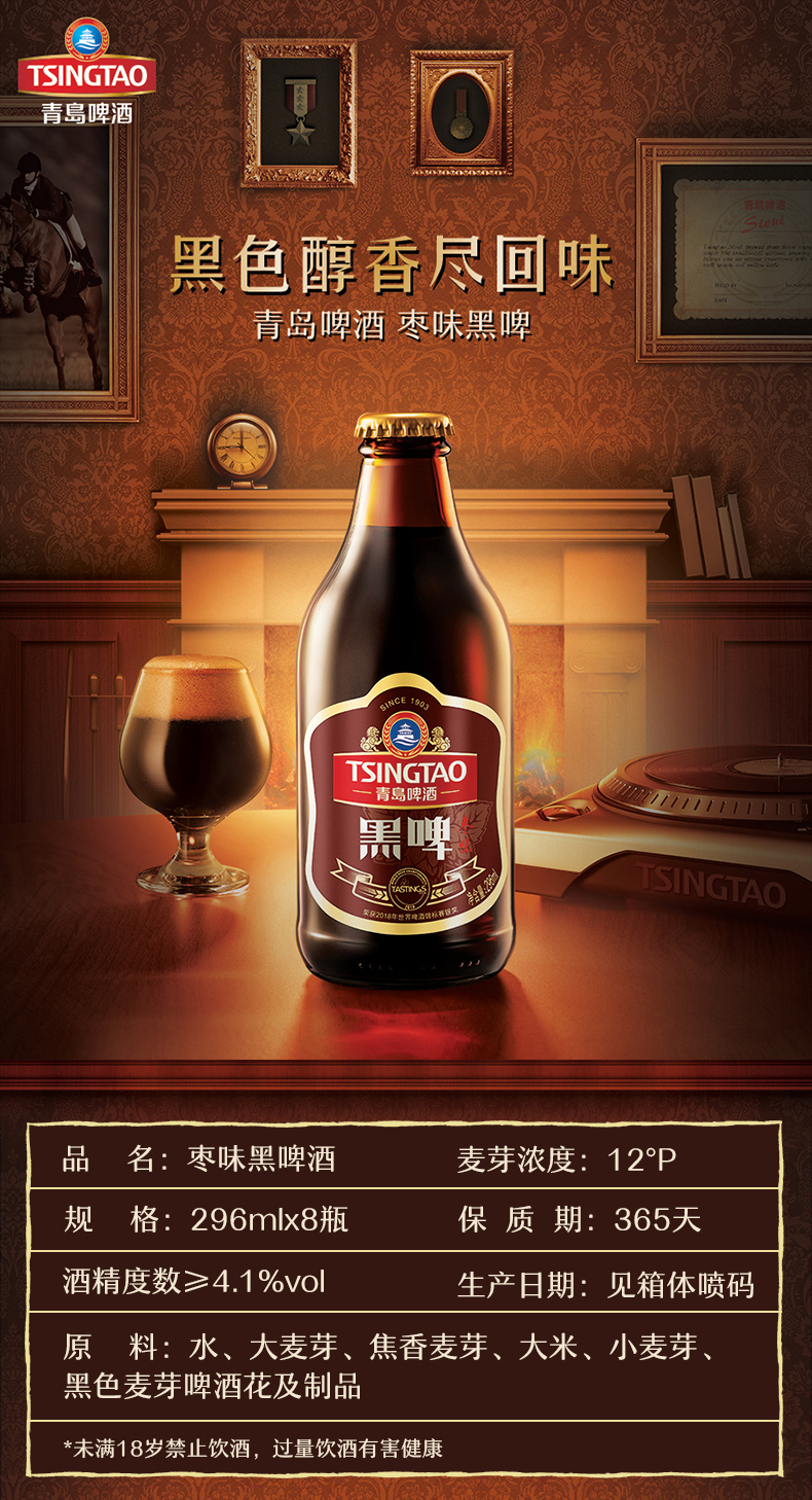 【青岛啤酒】黑啤枣味 12度 296ml*8瓶