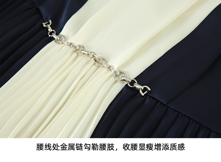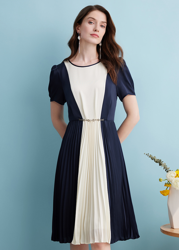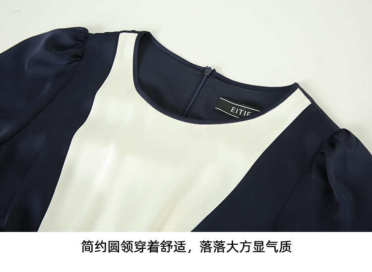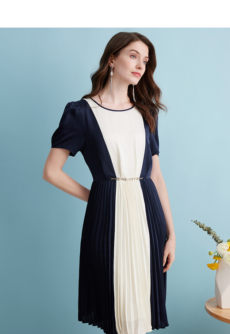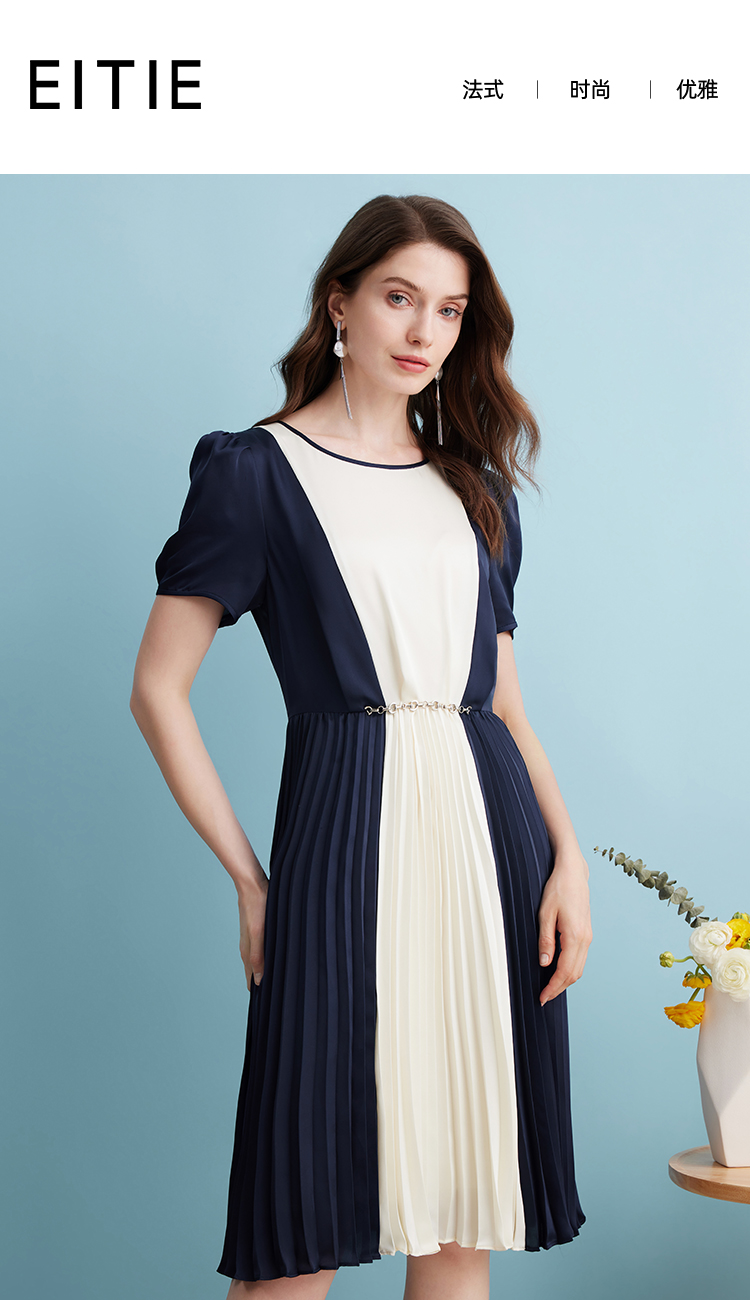 EITIE爱特爱夏季新款气质通勤时尚百搭撞色收腰显瘦裙摆褶皱连衣裙女7407127