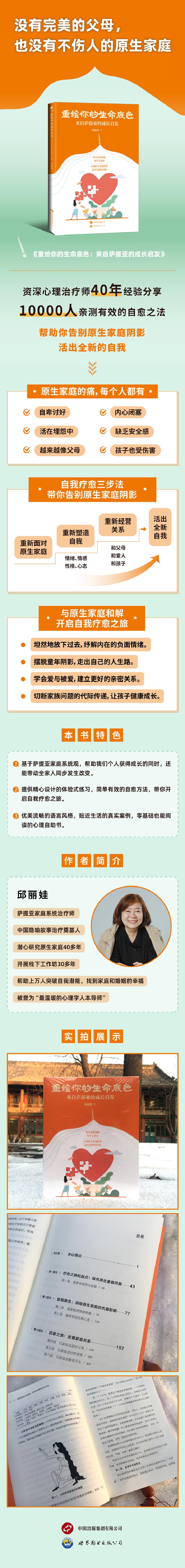 邱丽娃,萨提亚家庭系统治疗师、中国隐喻故事治疗奠基人,出版作品《美好生活方法论:改善亲密、家庭和人际关系的21堂萨提亚课》(合著)。潜心研究原生家庭40多年,开展线下工作坊30多年,帮助上万人突破自我潜能,找到家庭和婚姻的幸福,被誉为“温暖的心理学人本导师”。- 中信书店 (微信公众号认证)