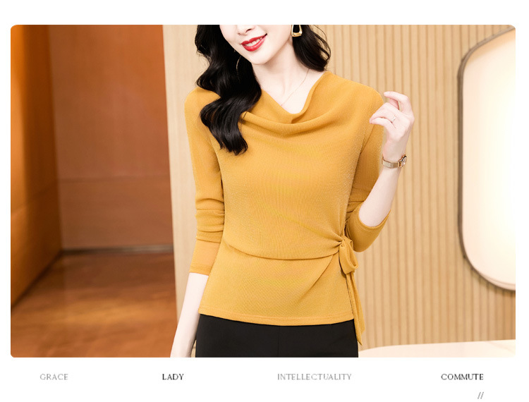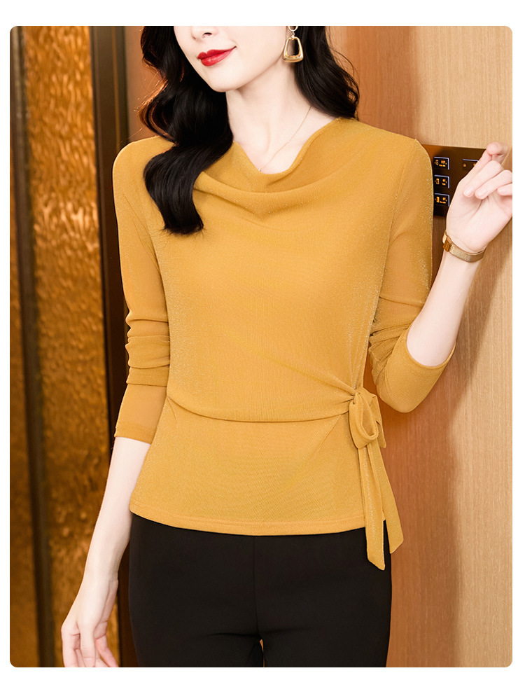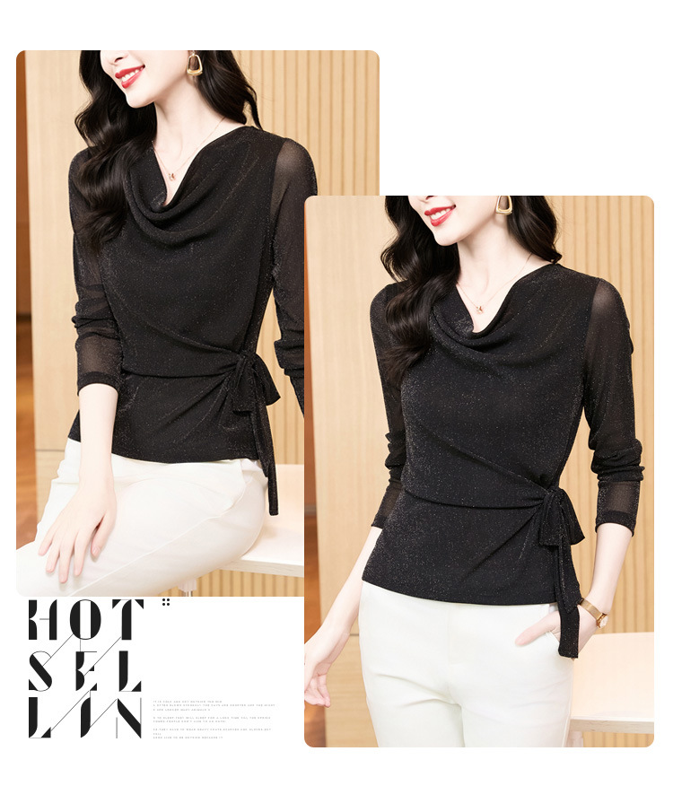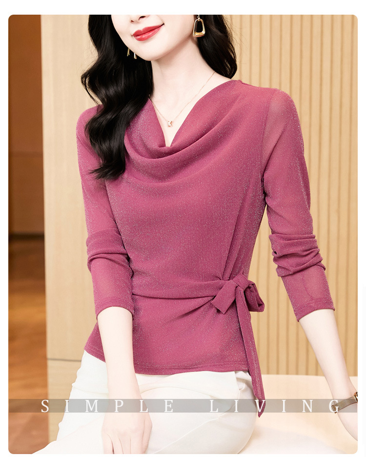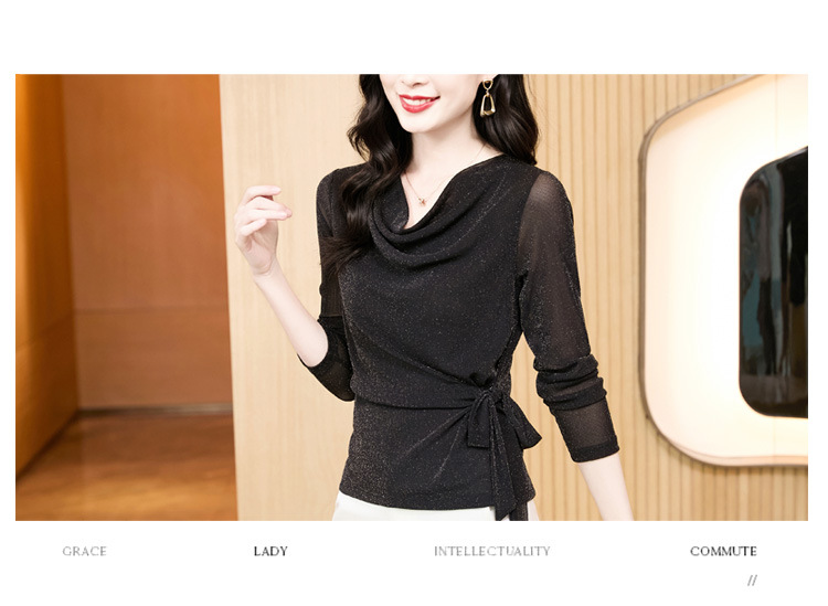 KQL E37M2966时尚纯色亮丝荡领长袖系带网纱打底衫修身T恤