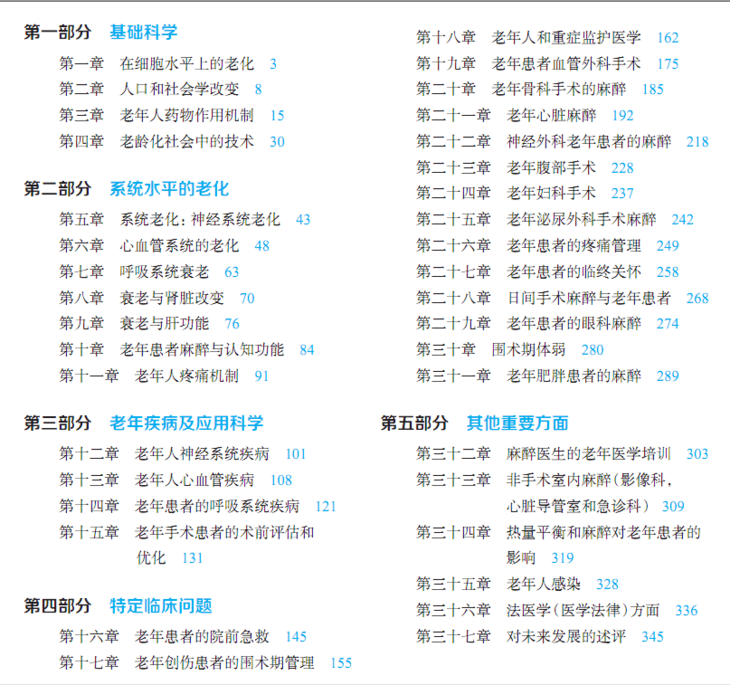 随着全球人口老龄化,如何给这些虚弱和脆弱的老年患者更恰当的麻醉、疼痛管理与护理,这已成为全世界都在关注、开发、研究的重要问题。本书提供了老年患者麻醉全面和详细的概述,分析了老化对身体系统的影响,以及年龄对药物机制的影响。本书专为医疗、看护老年患者医生、护士、医学生等设计,分章节介绍了老年患者在疼痛、创伤、重症监护以及麻醉手术等方面的临床管理。