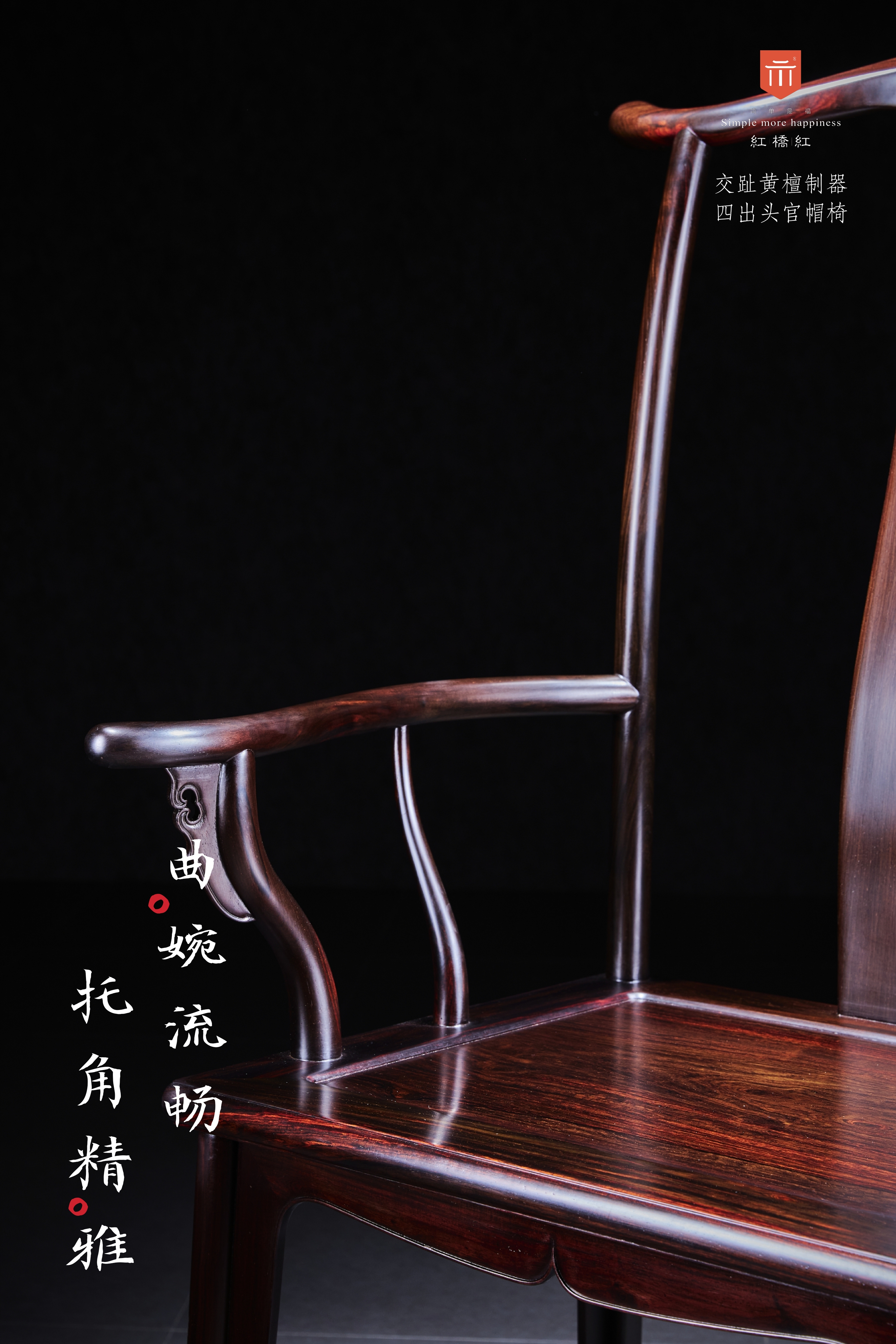 搭脑弧度大如绷弓,用料颇奢,两端上翘如幞头,三弯靠背与后腿上段的后弯体现曲线之美,充分贴合人体脊椎,提升舒适感。