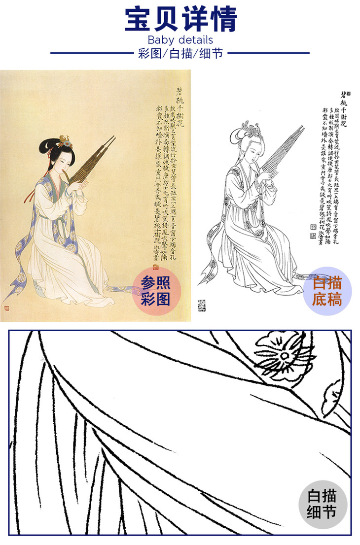 杨淑涛工笔传统仕女人物白描底稿-古乐仕女图-斗方小品册页-B055