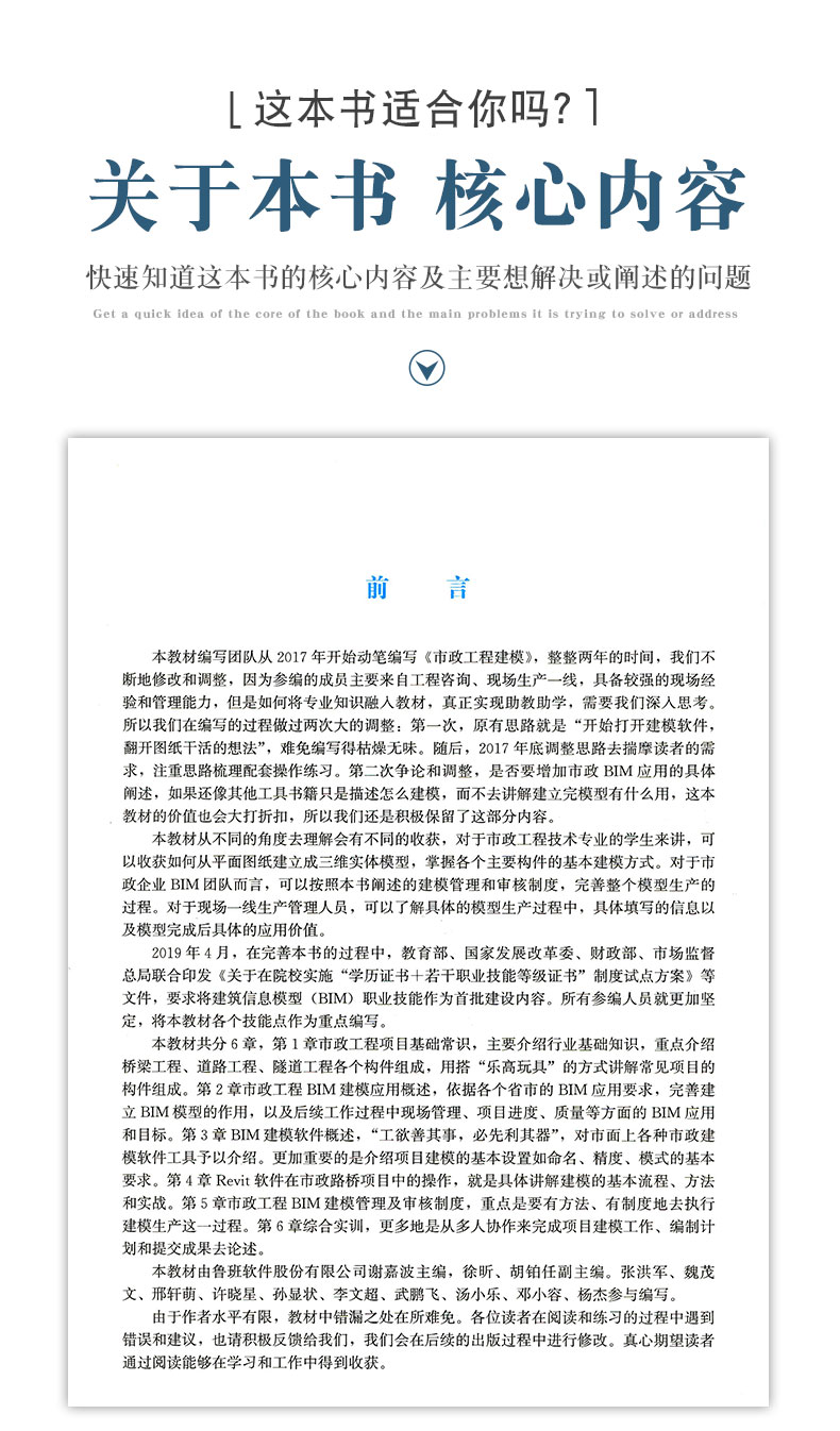 本书共6个章节,第一章市政项目基础常识,主要介绍行业基础知识,重点介绍桥梁工程、道路工程、隧道工程各个构件组成,用搭“乐高玩具”的方式讲解常见项目的构件组成。第二章市政BIM建模的应用,依据各个省市的BIM应用要求,完善建立BIM模型的作用,以及后续工作过程中现场管理、项目进度、质量等方面的BIM应用和目标。第三章BIM建模软件介绍,“工欲善其事必先利其器”,对市面上各种市政建模软件工具予以介绍。更加重要的是介绍项目建模的基本设置如命名、精度、模式的基本要求。第四章Revit软件在市政路桥项目中的操作,就是具体讲解建模的基本流程、方法和实战。第五章市政BIM建模管理及审核制度,重点是要有方法、有制度的去执行建模生产这一过程。第六章项目实训,更多的是从多人协作来完成项目建模工作、编制计划和提交成果去论述。