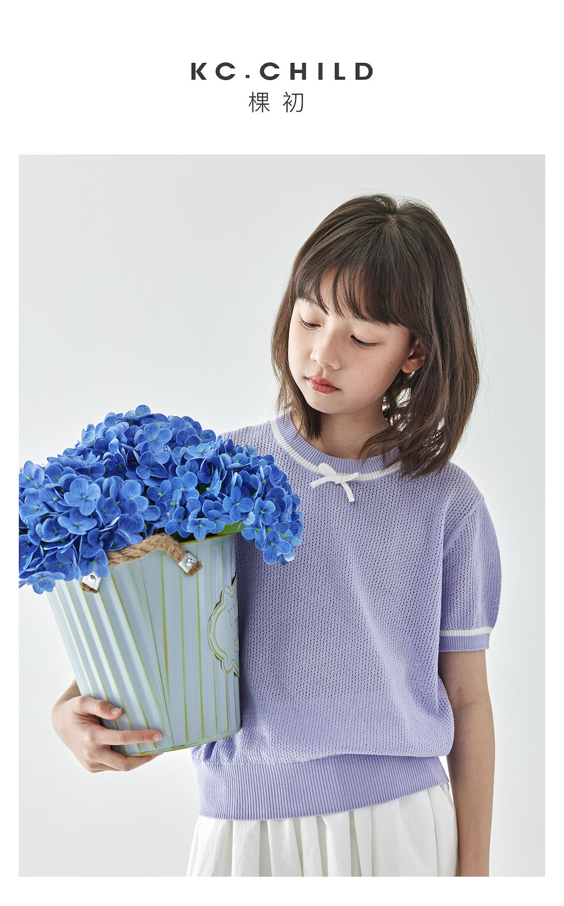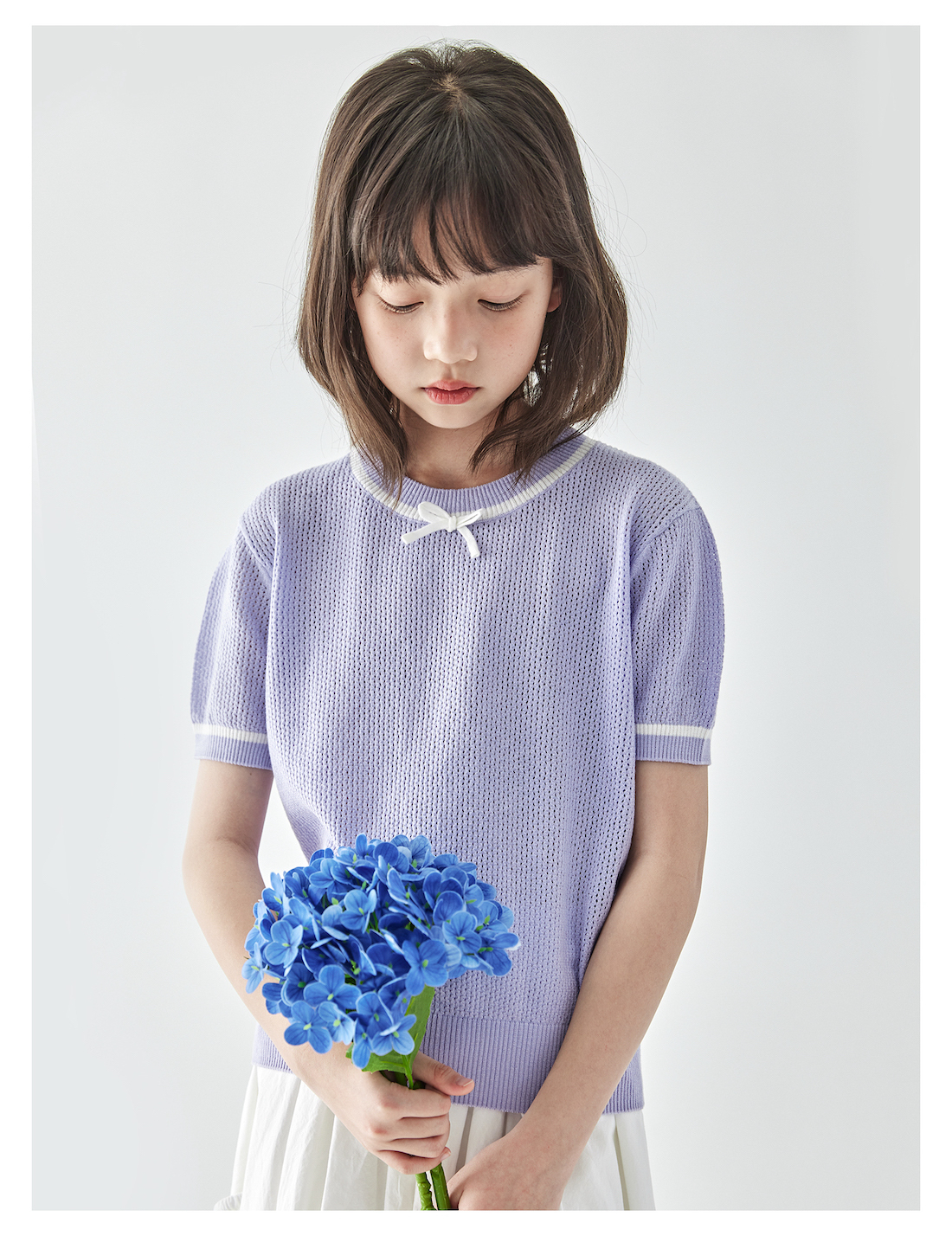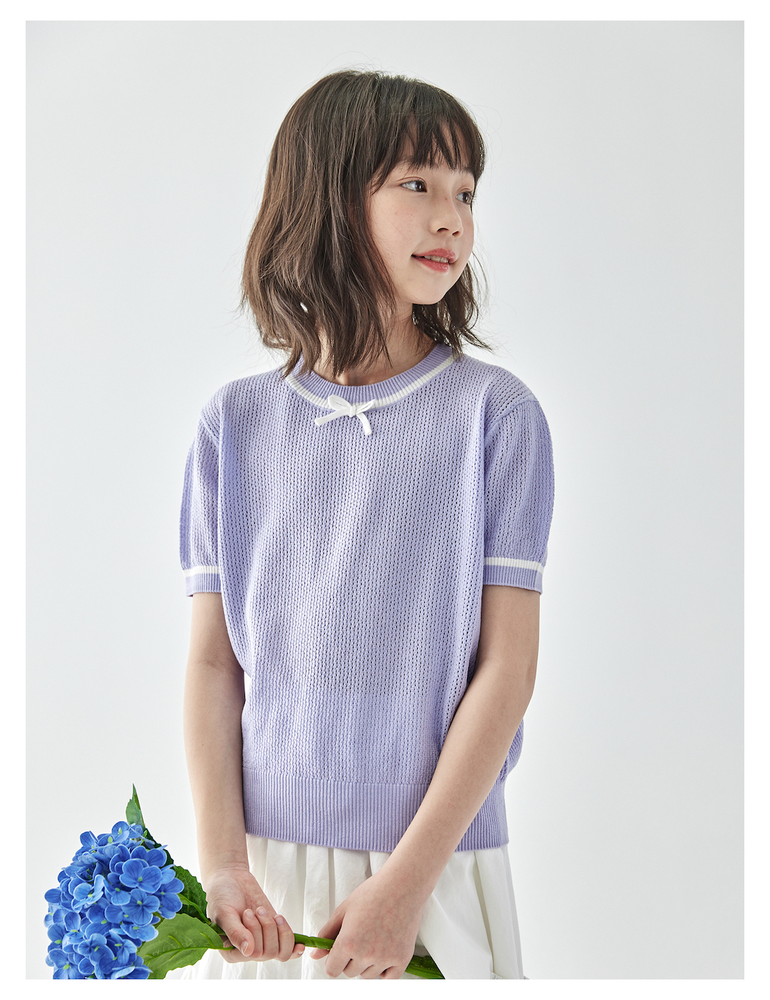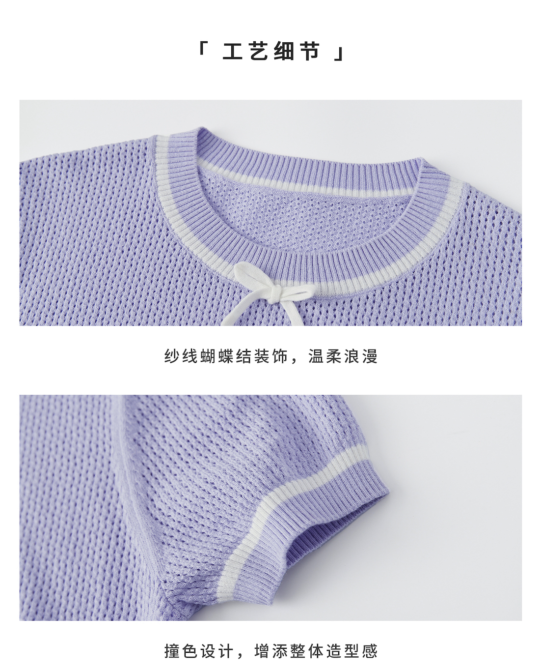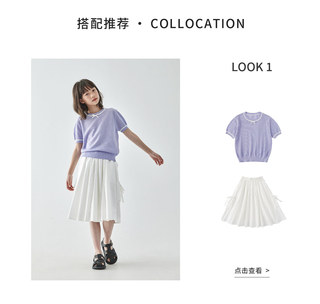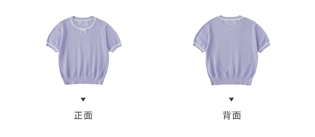 棵初2025年新款夏日氧气感镂空针织小衫儿童蝴蝶结撞色领短袖上衣