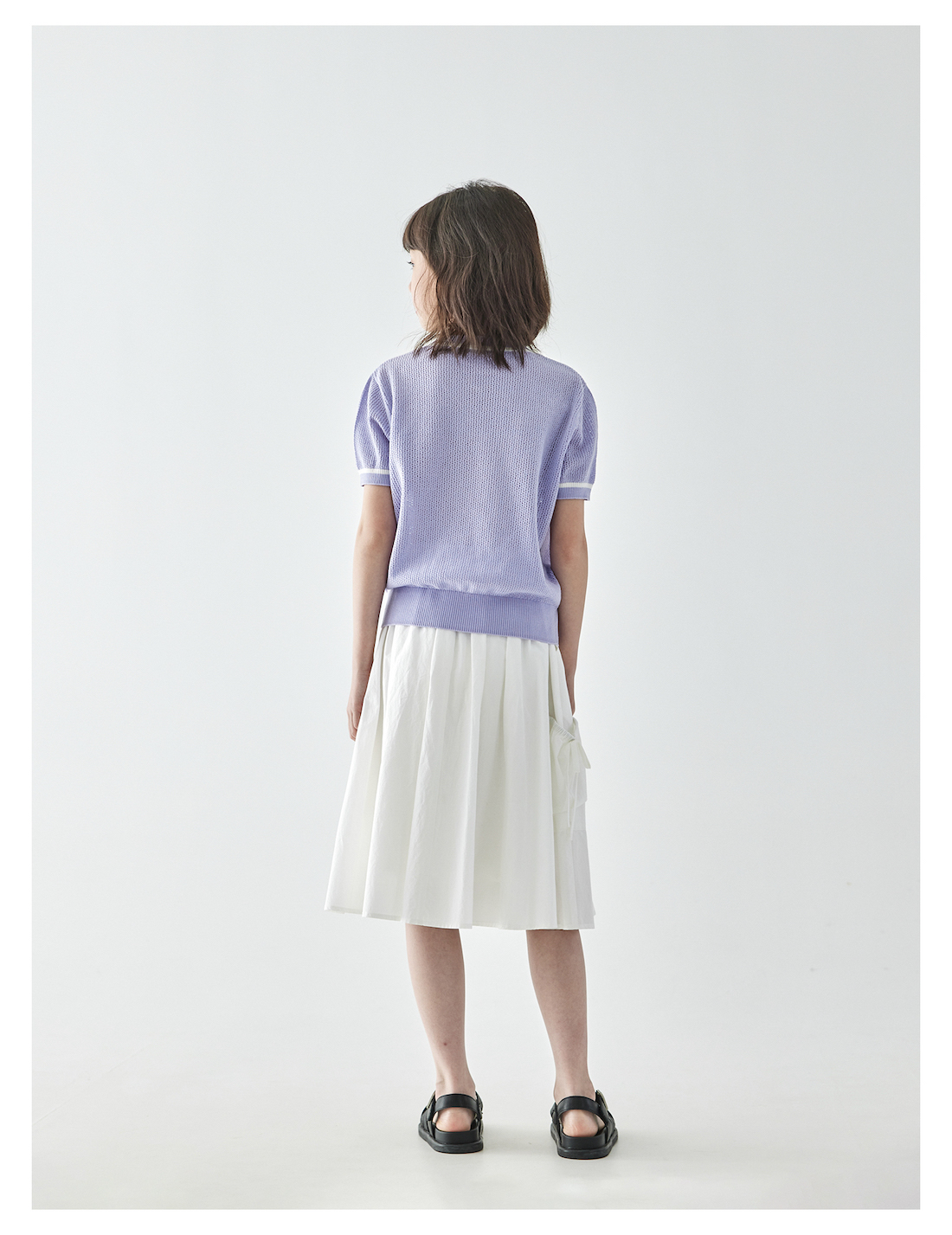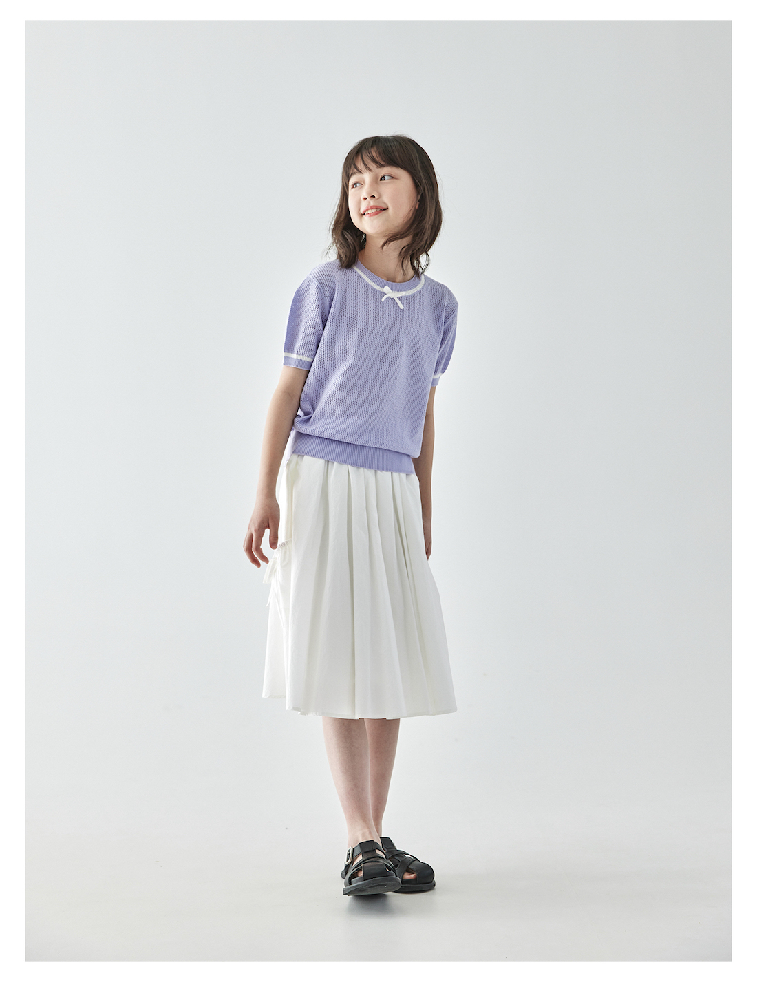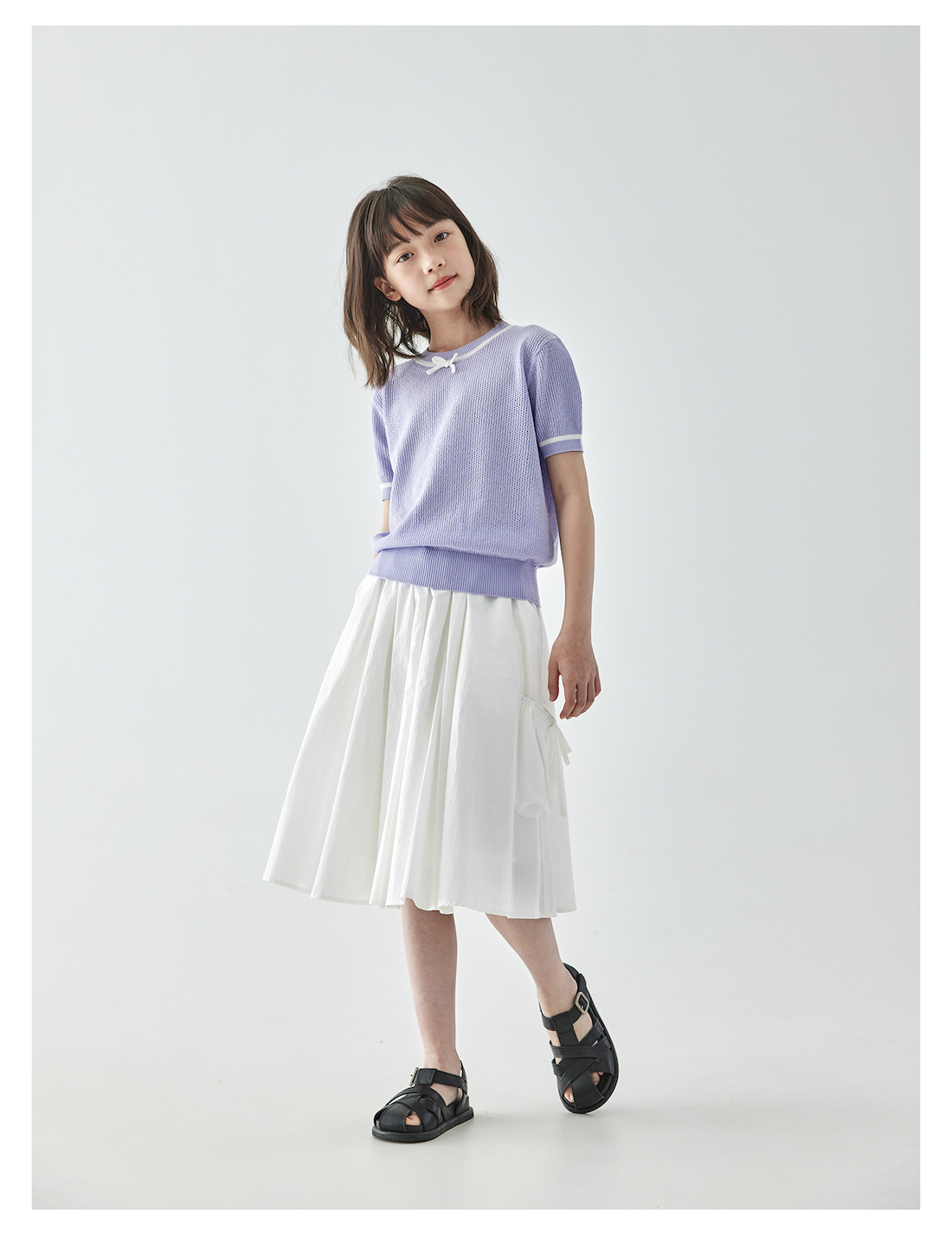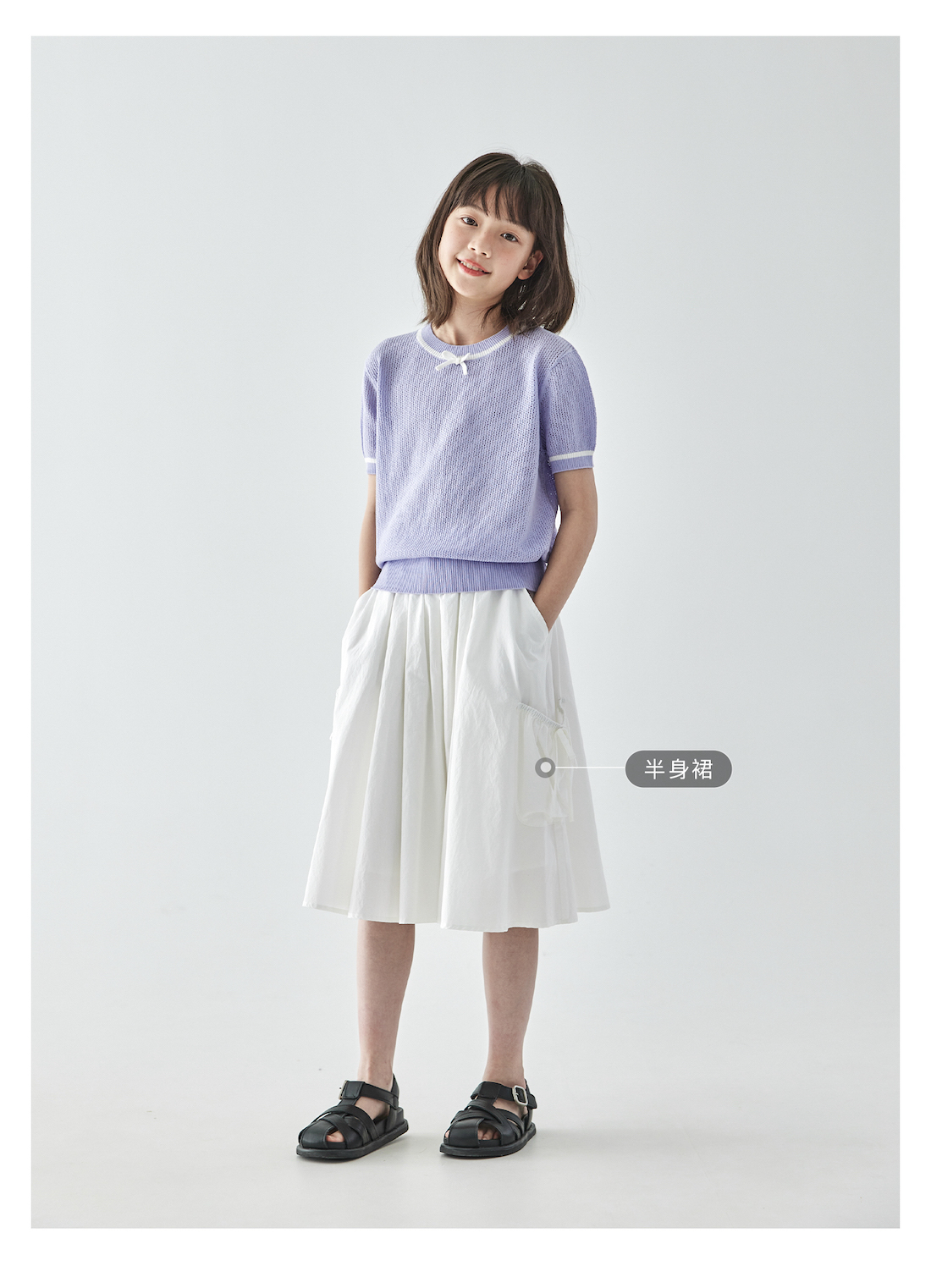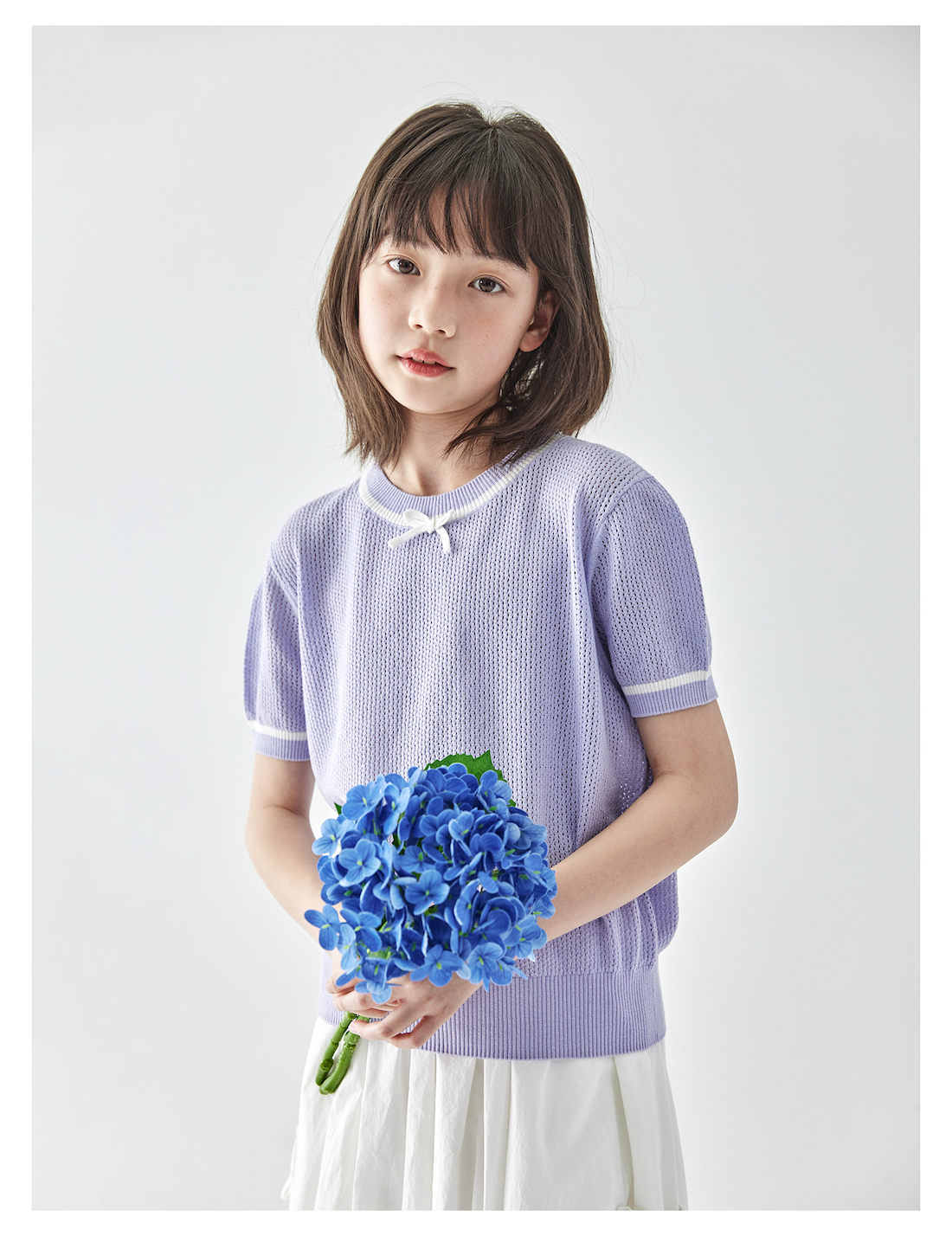 棵初2025年新款夏日氧气感镂空针织小衫儿童蝴蝶结撞色领短袖上衣