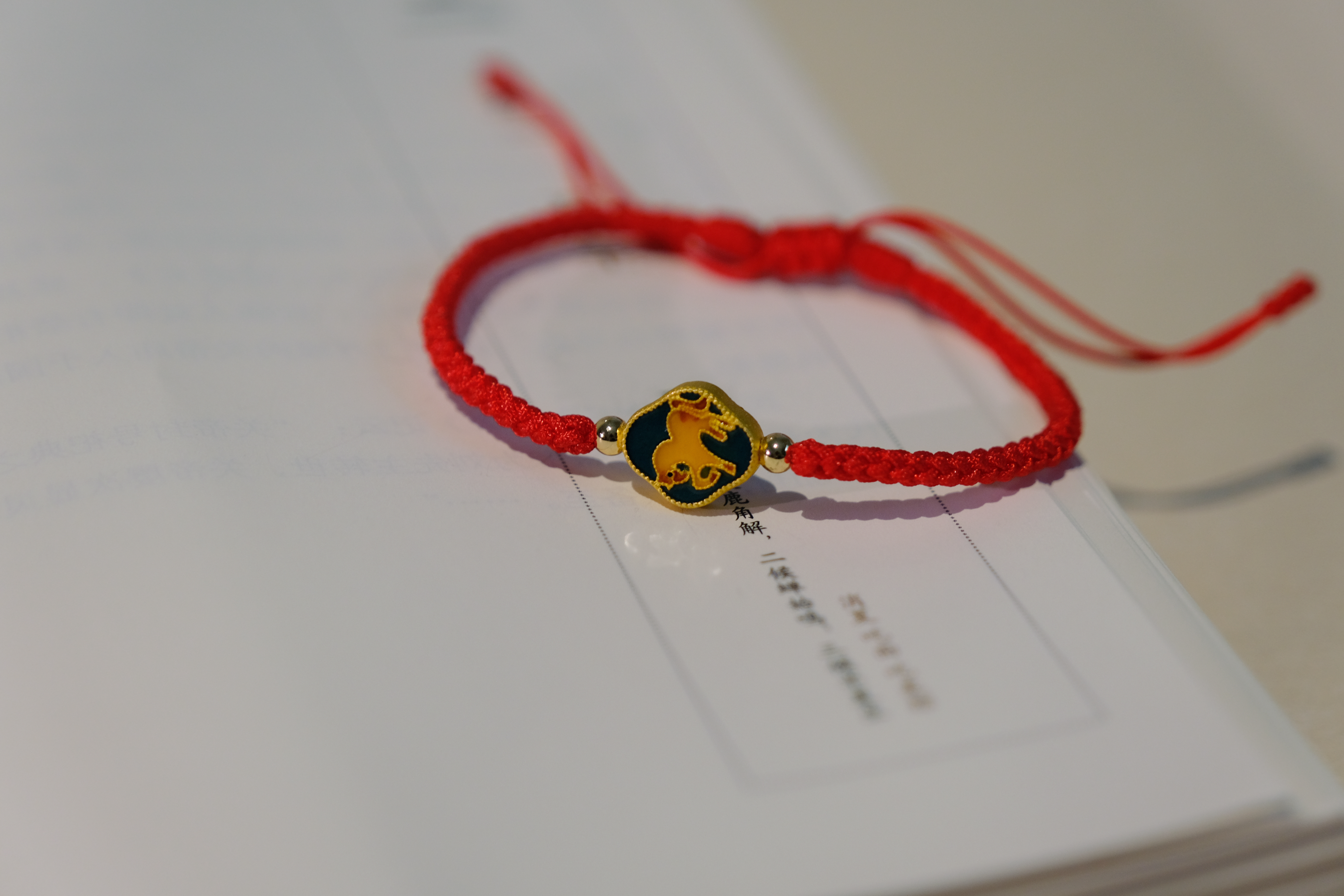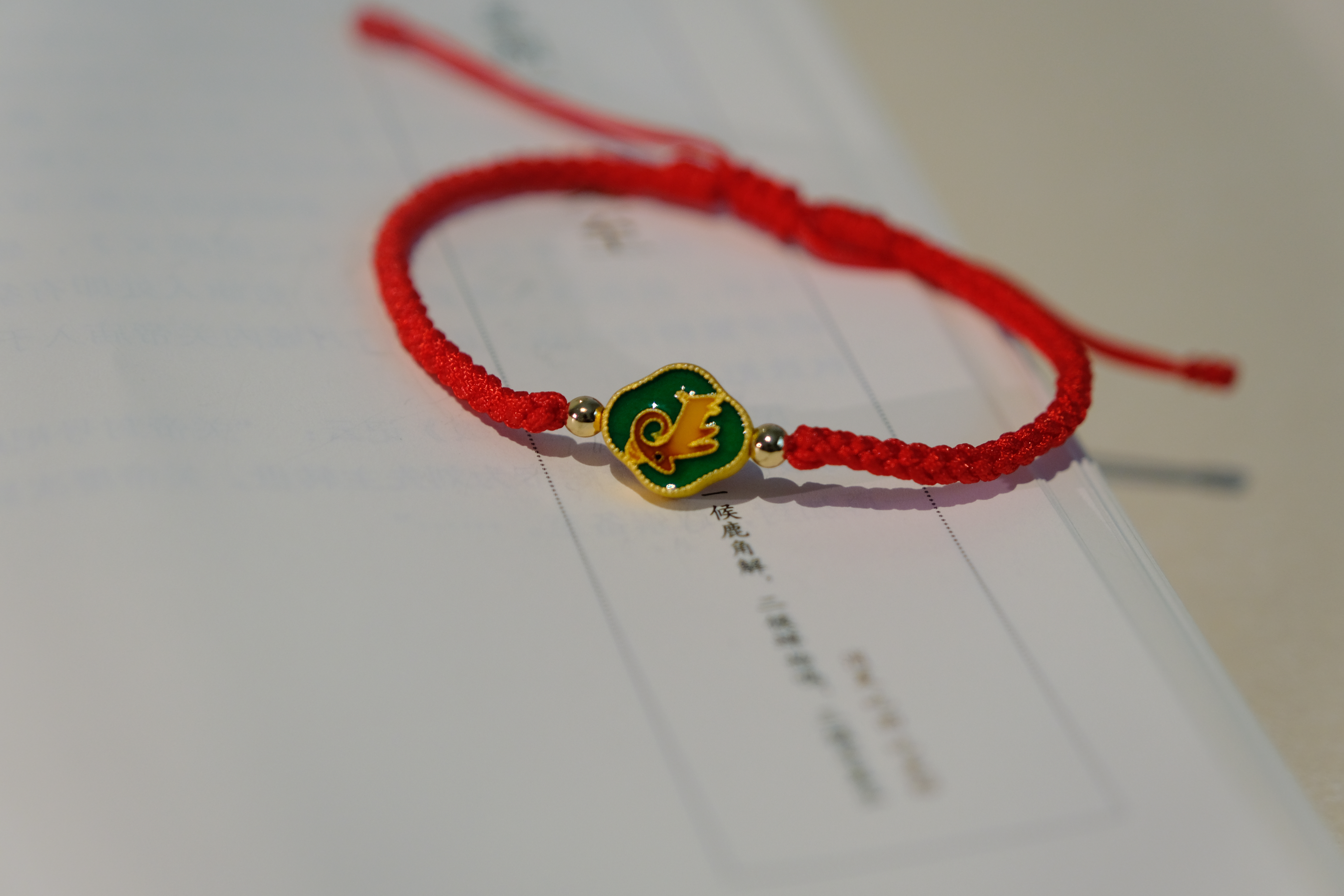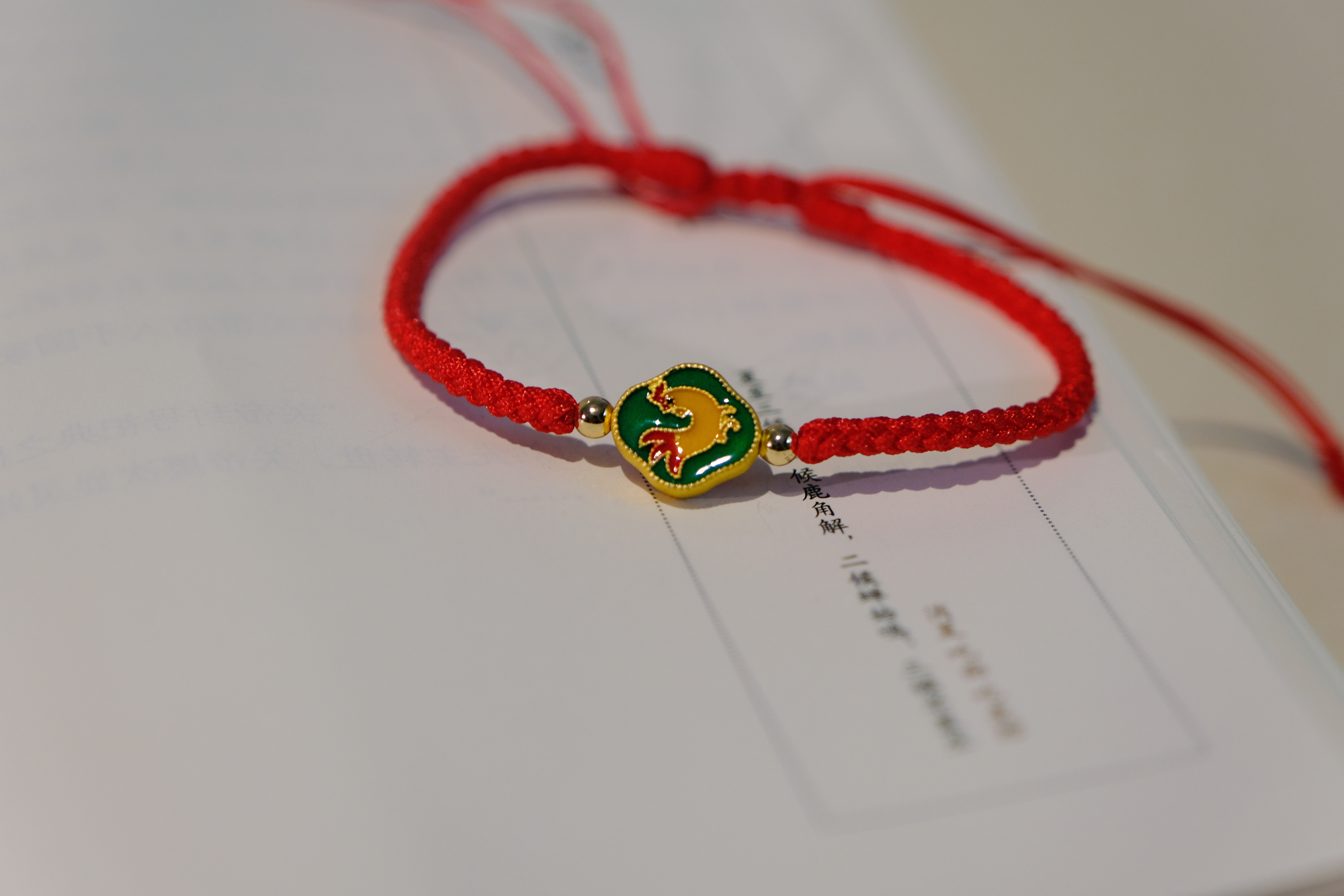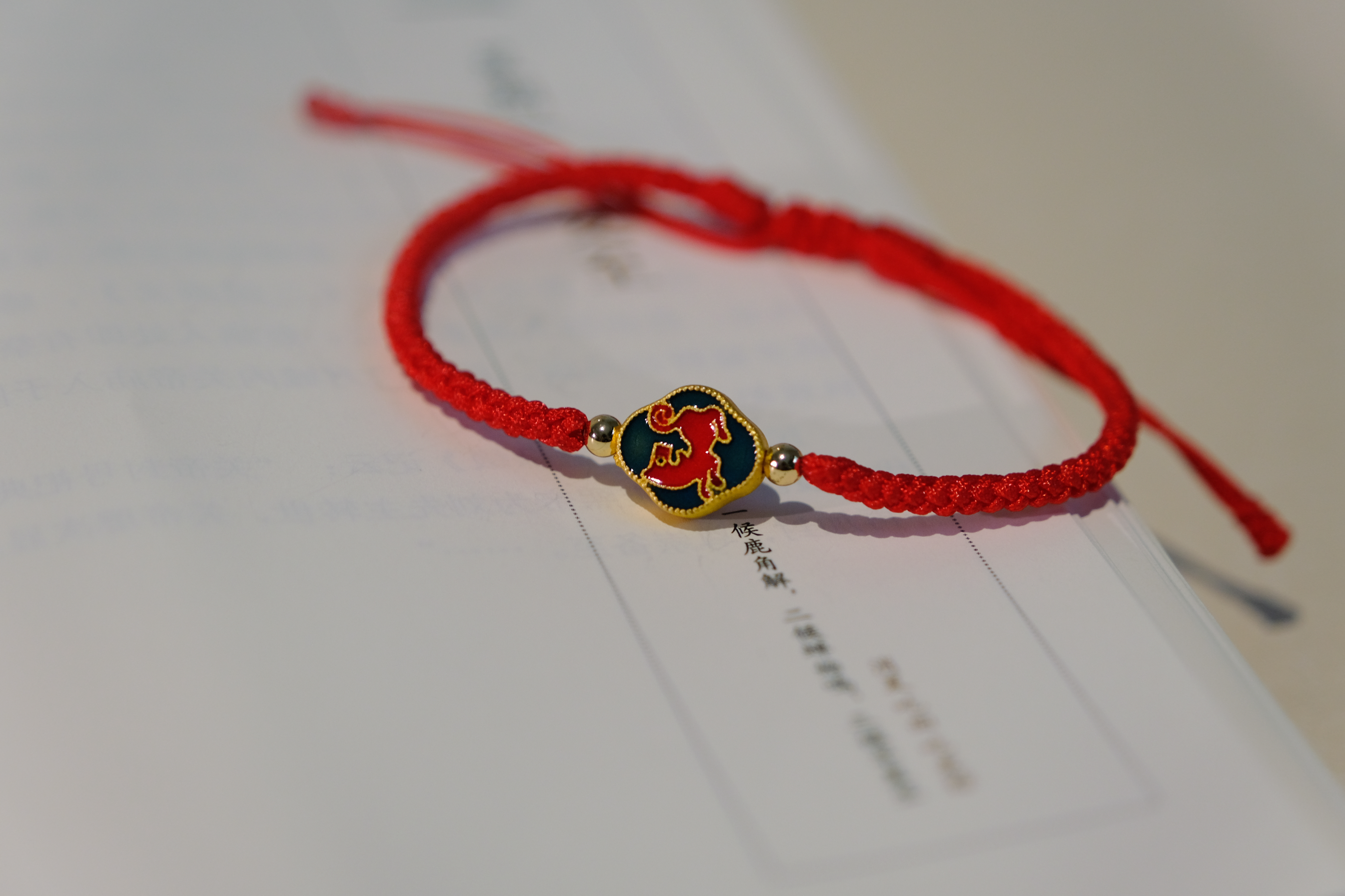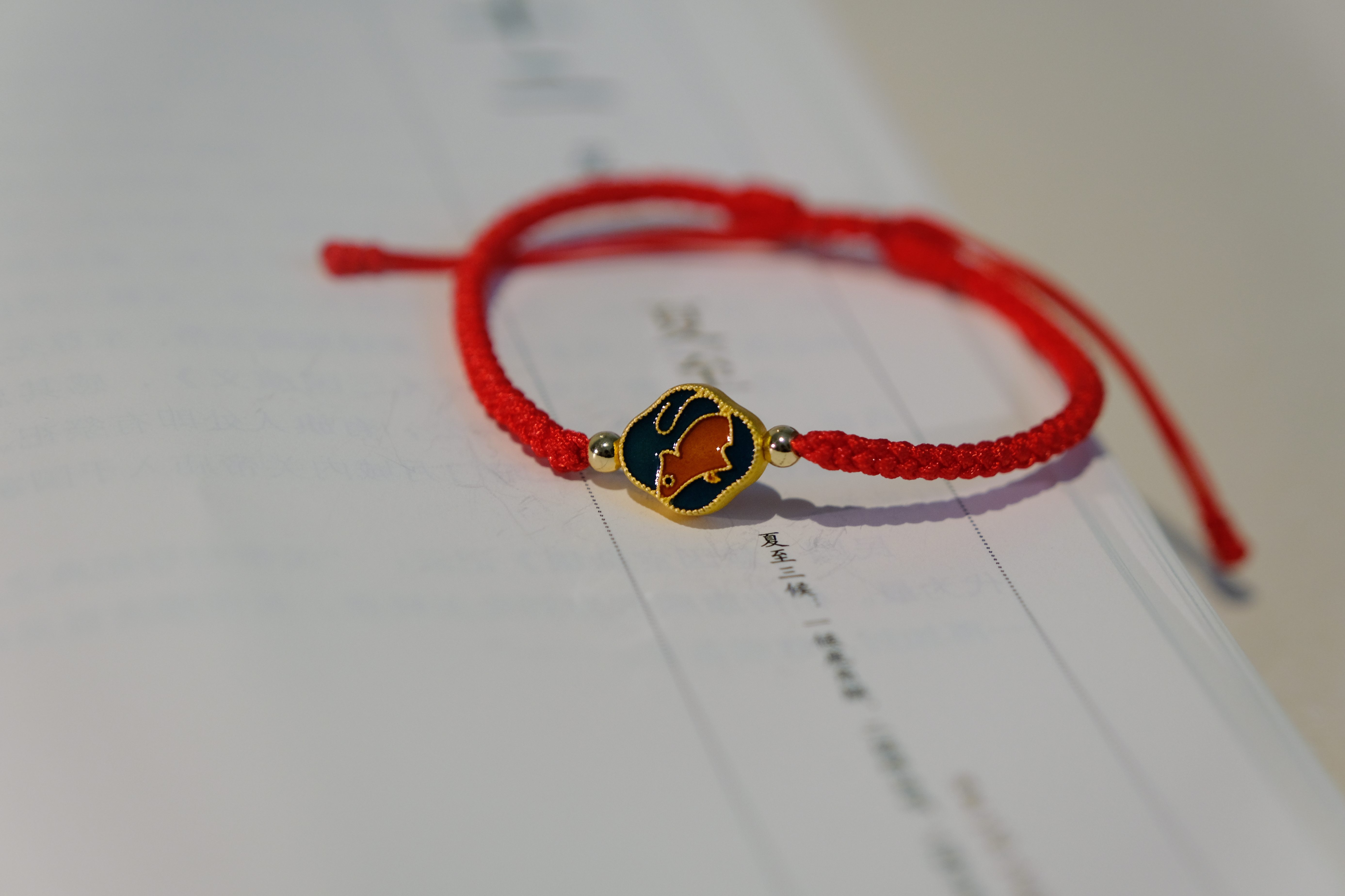材质:铜镀18K金珐琅,进口红绳,进口14k包金配件