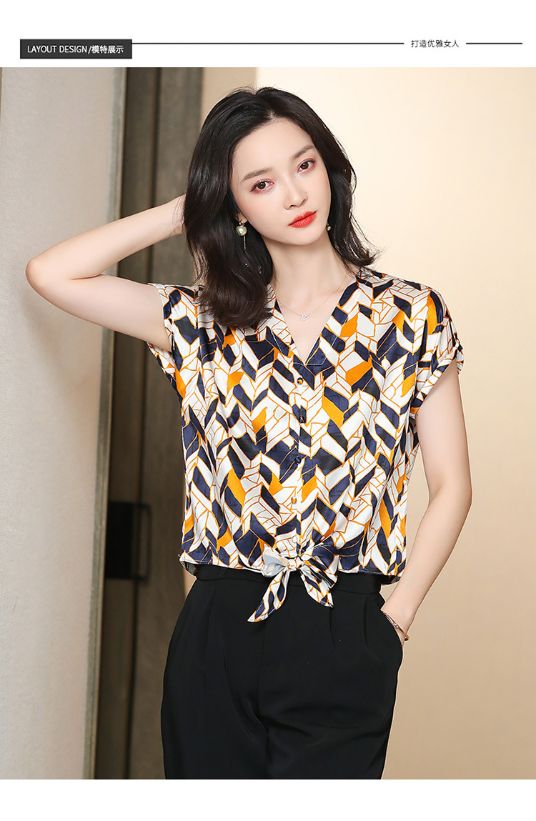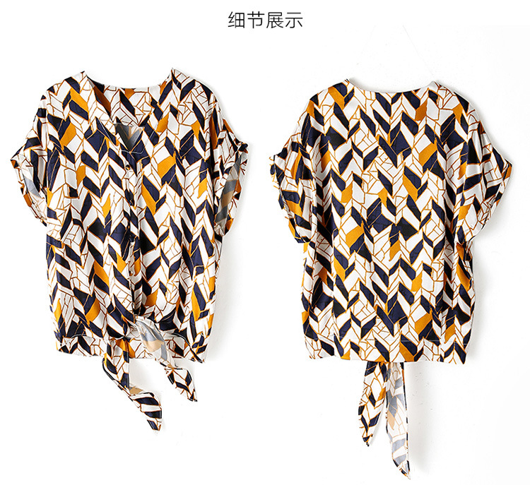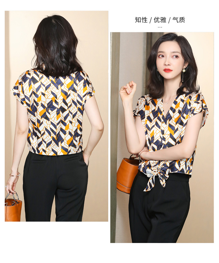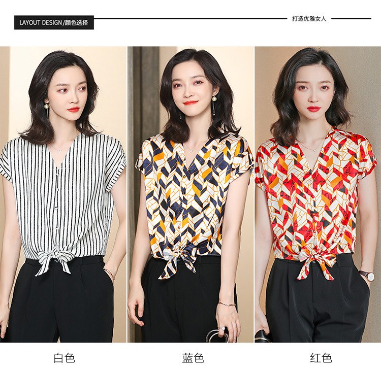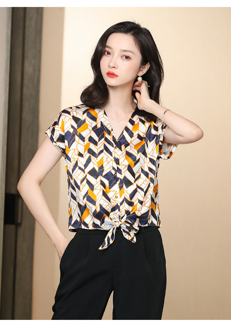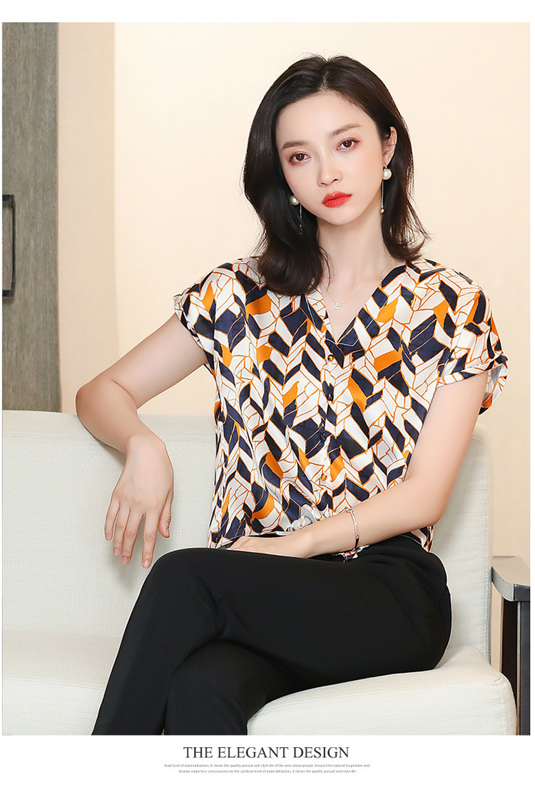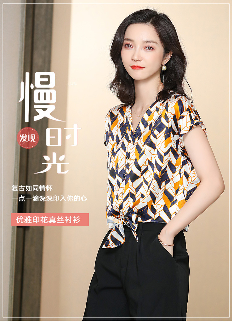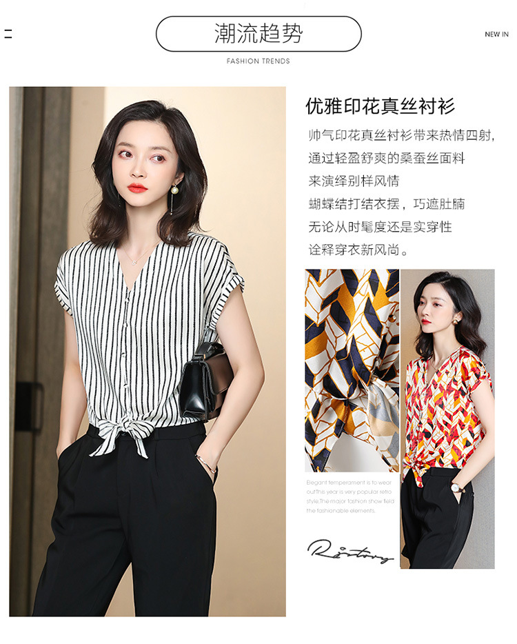 丁摩 真丝衬衫女士新款夏季V领短袖格纹别致设计感小众上衣5ZF-3358