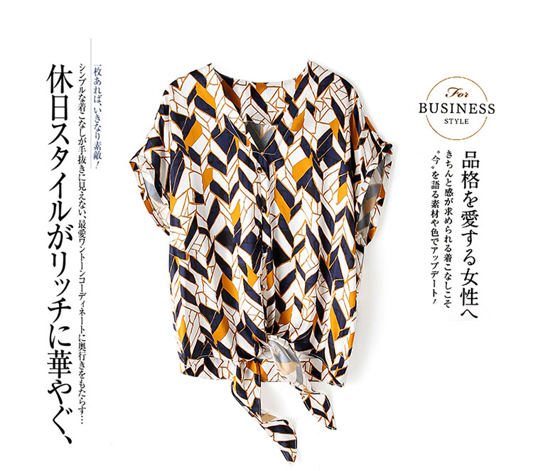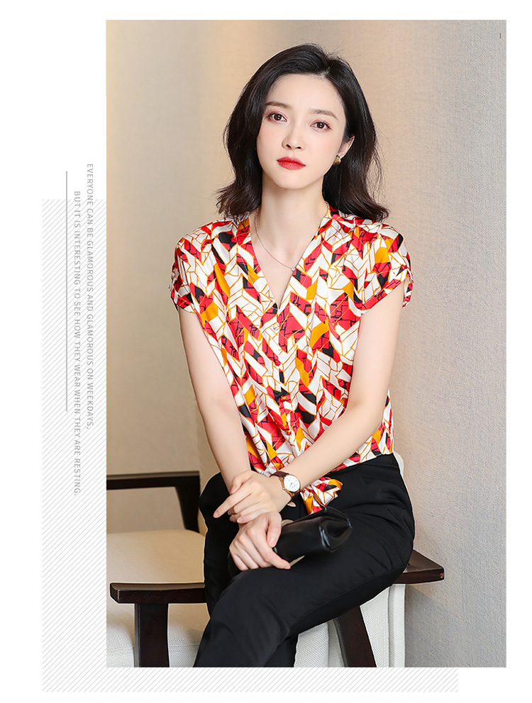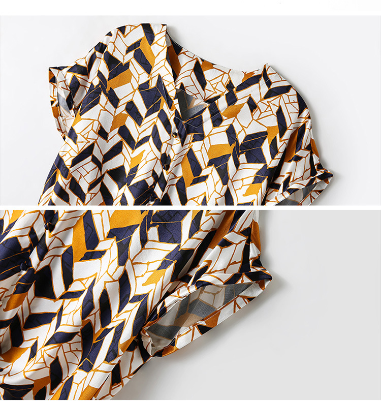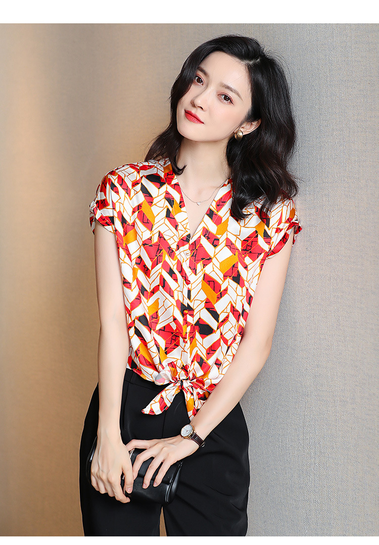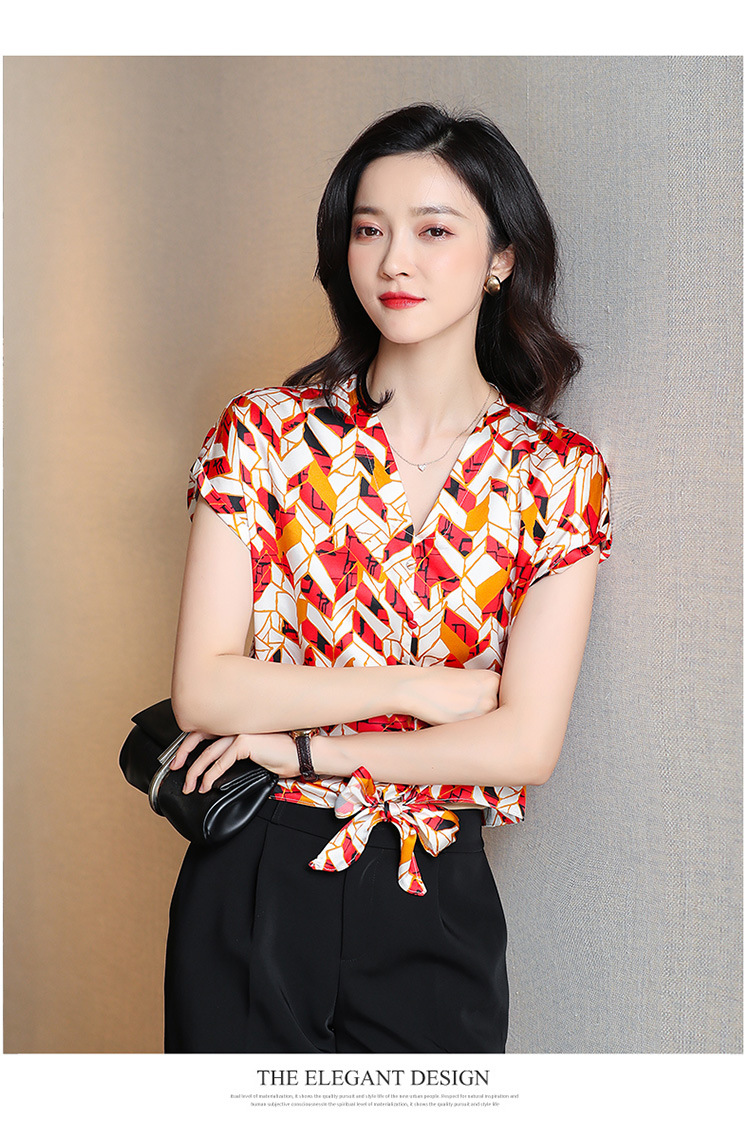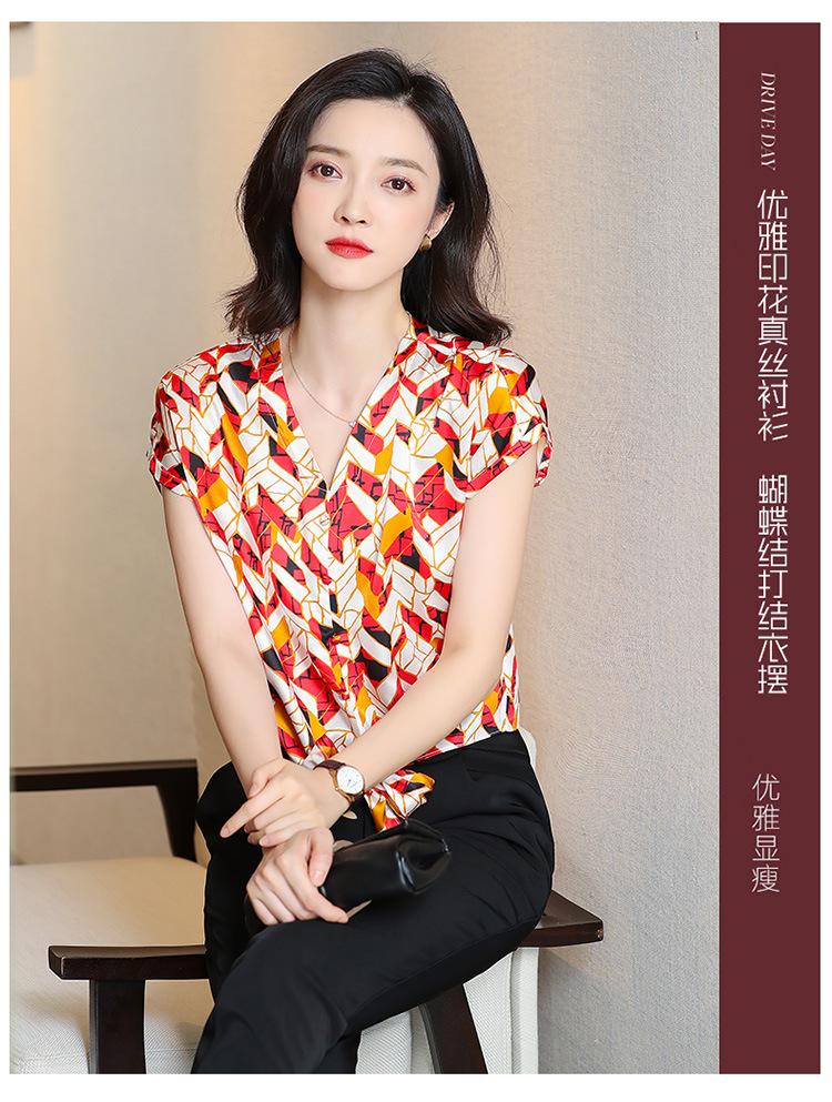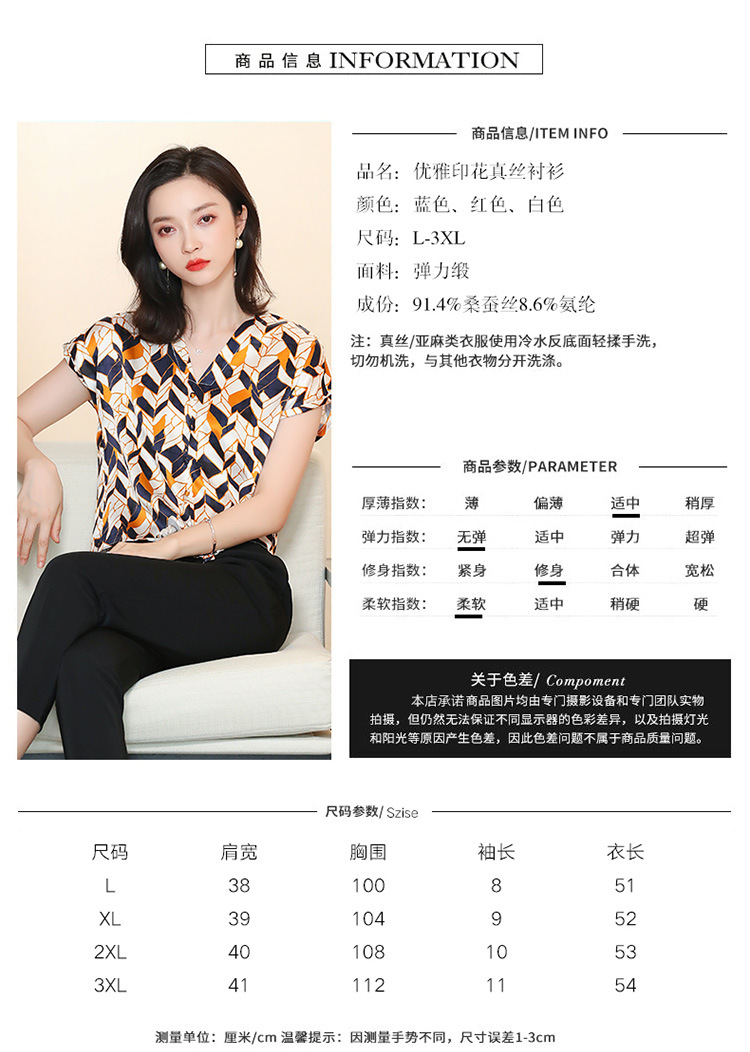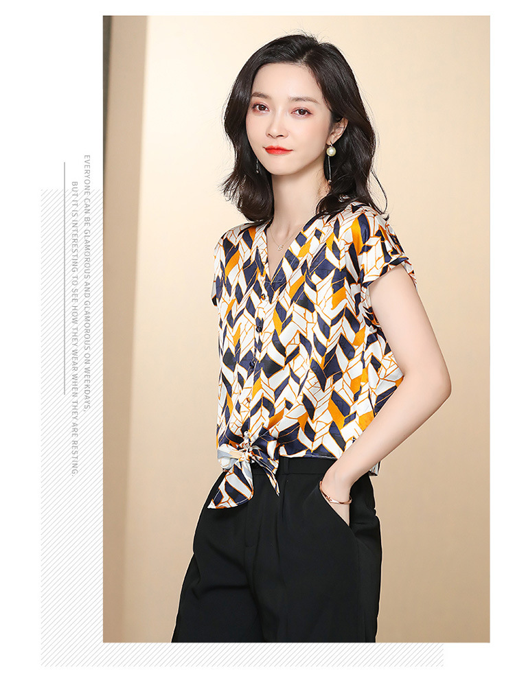 丁摩 真丝衬衫女士新款夏季V领短袖格纹别致设计感小众上衣5ZF-3358