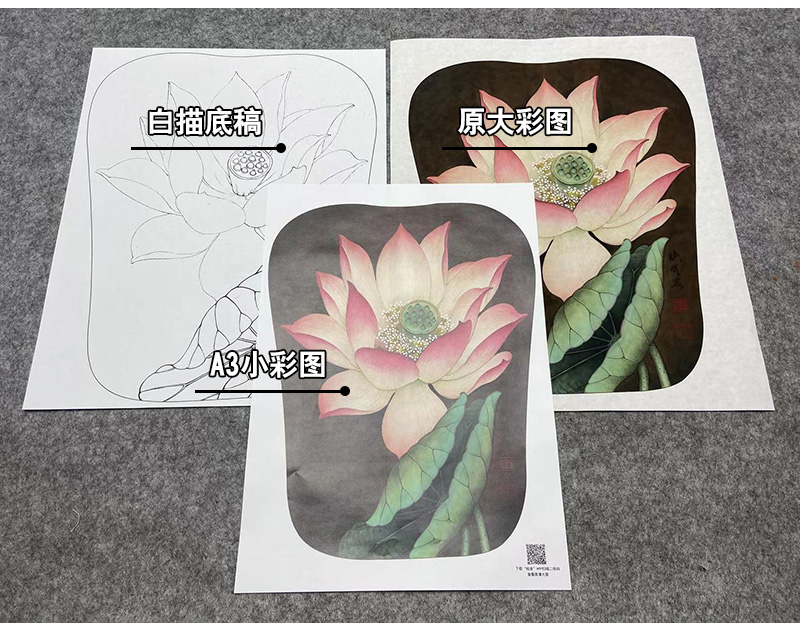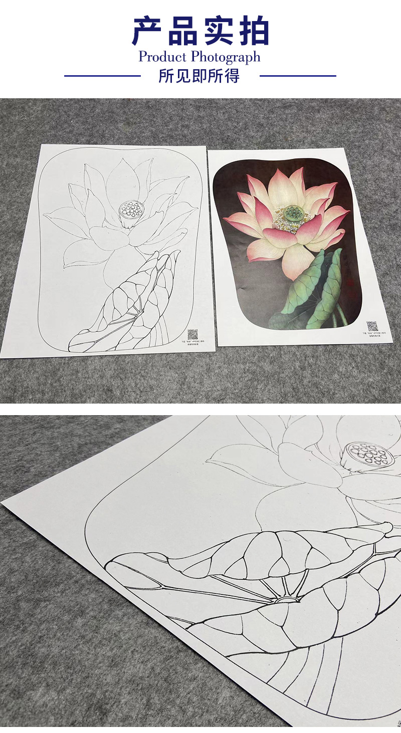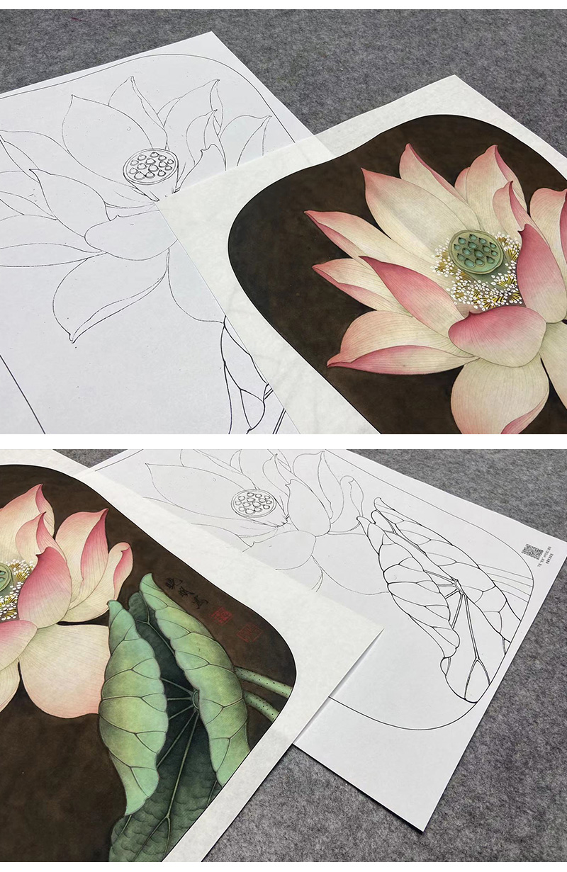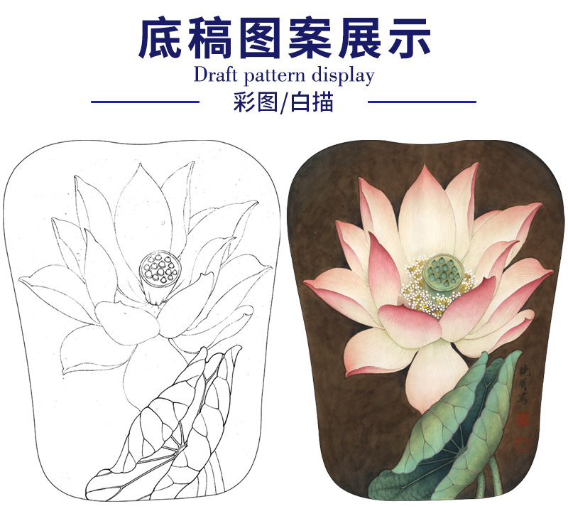 【大彩图】李晓明工笔画白描底稿宫扇《泽艳红芝花》荷花临摹勾线花鸟线稿K077