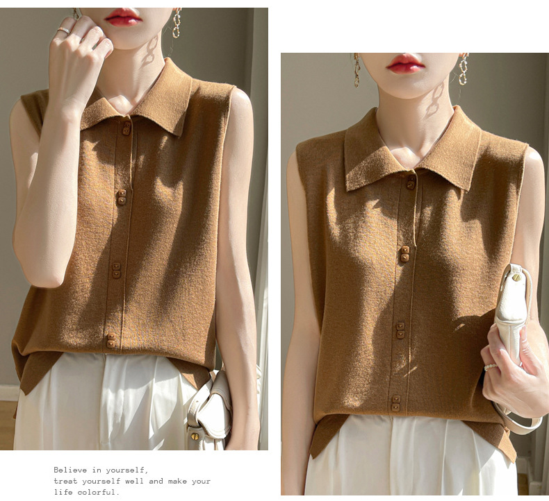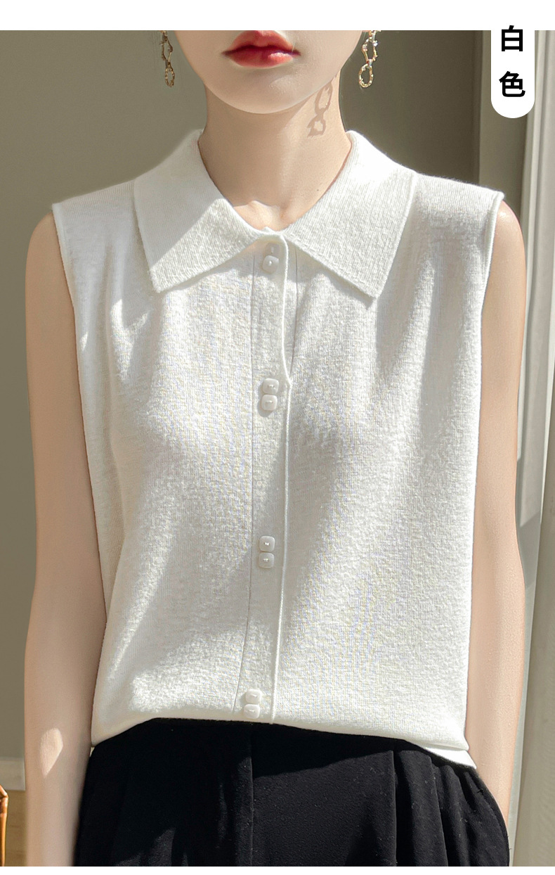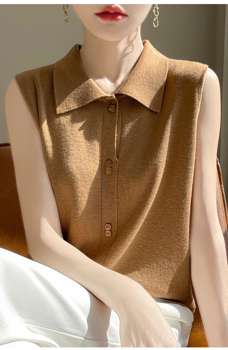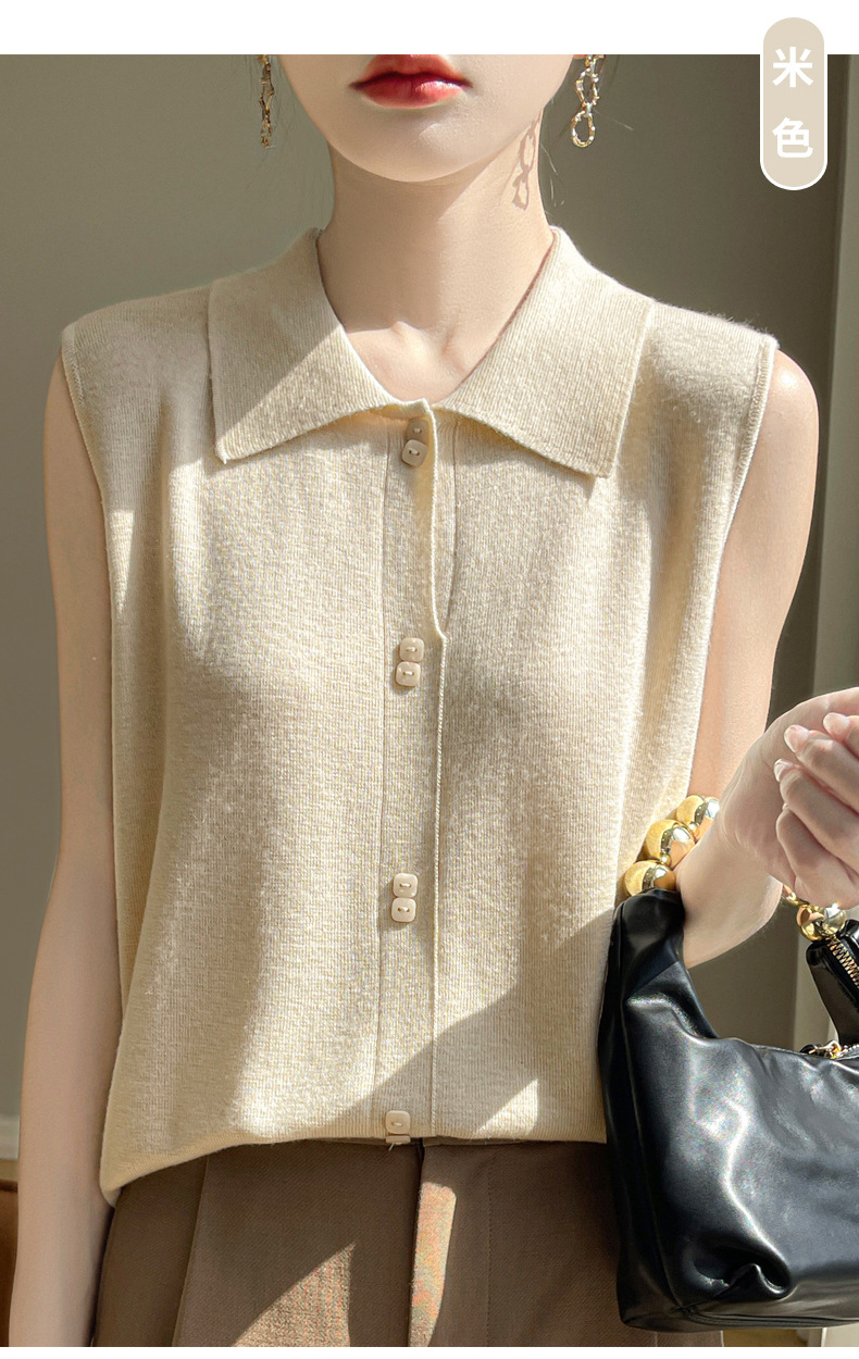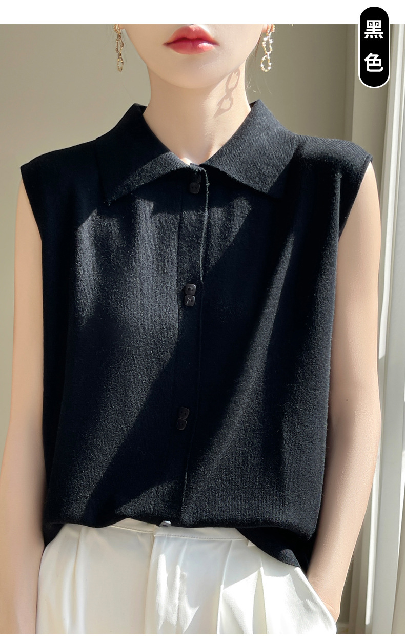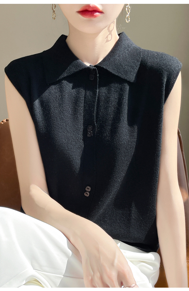 QHJY-JY1086新款POIO领无袖精纺羊毛针织女打底衫纯色翻领内搭叠穿针织背心