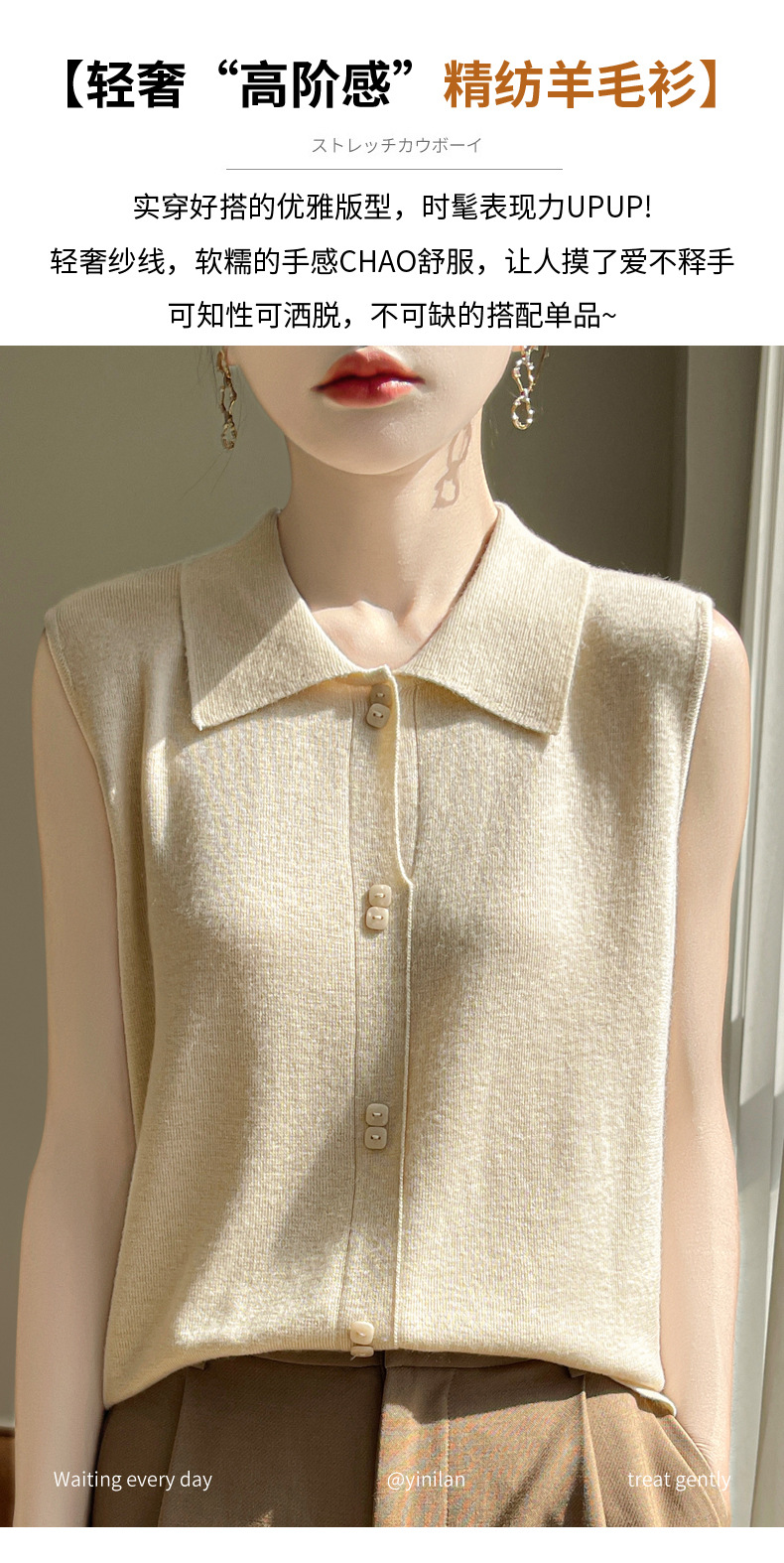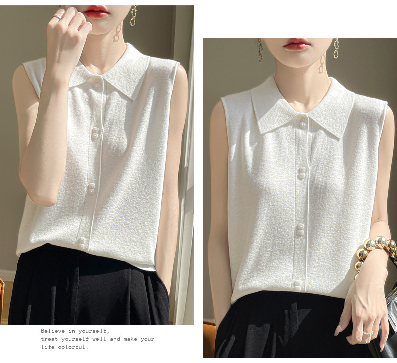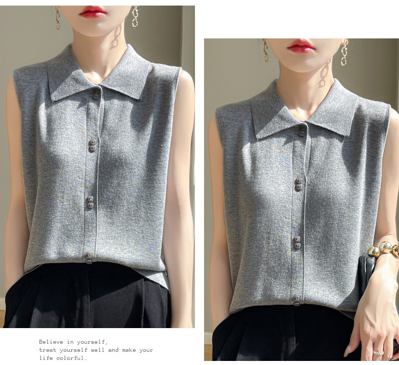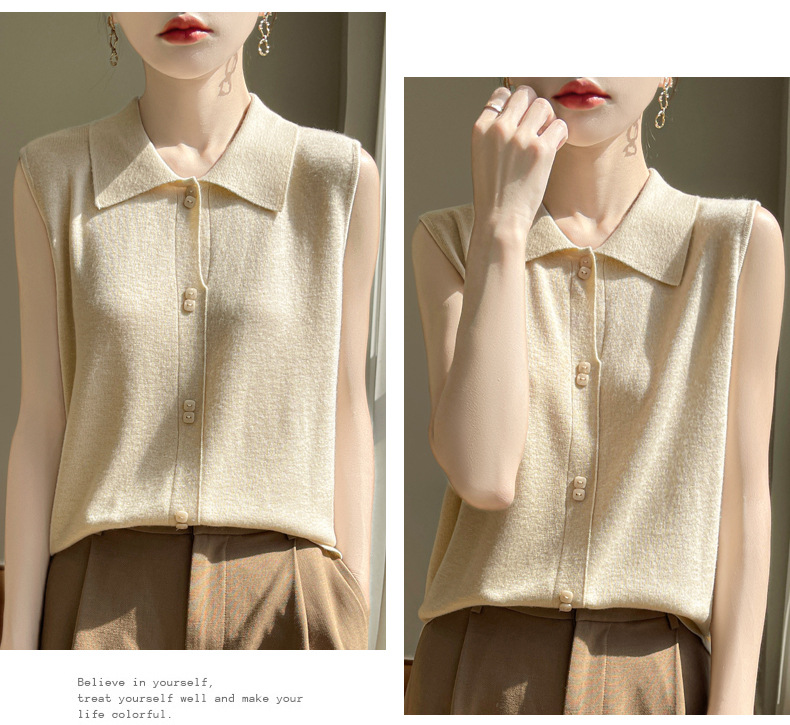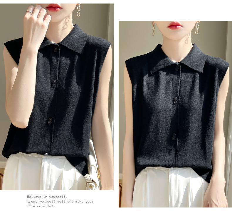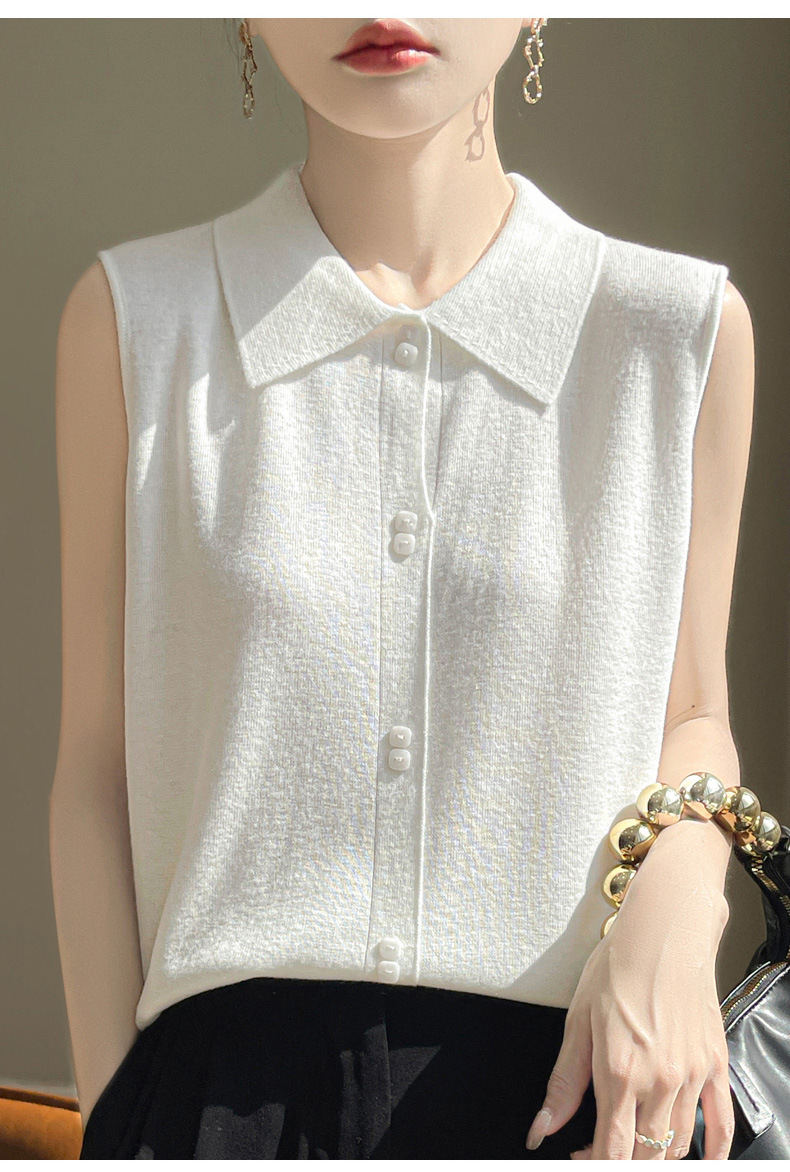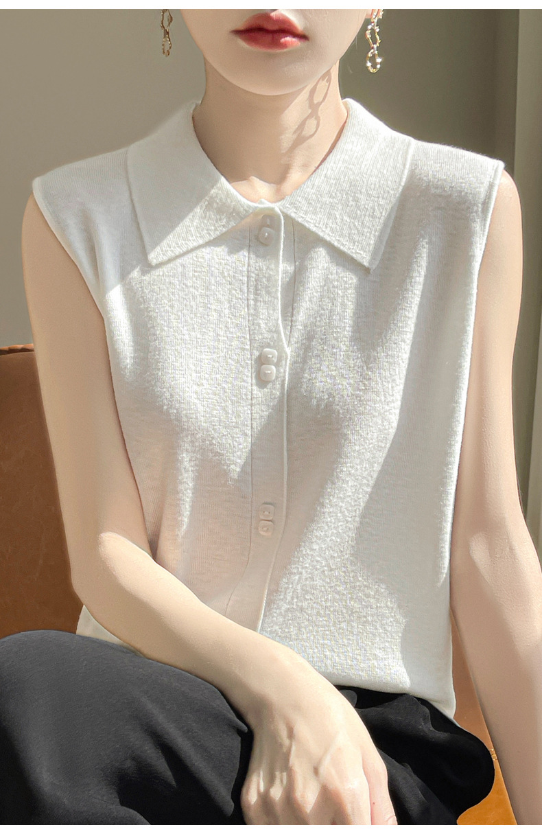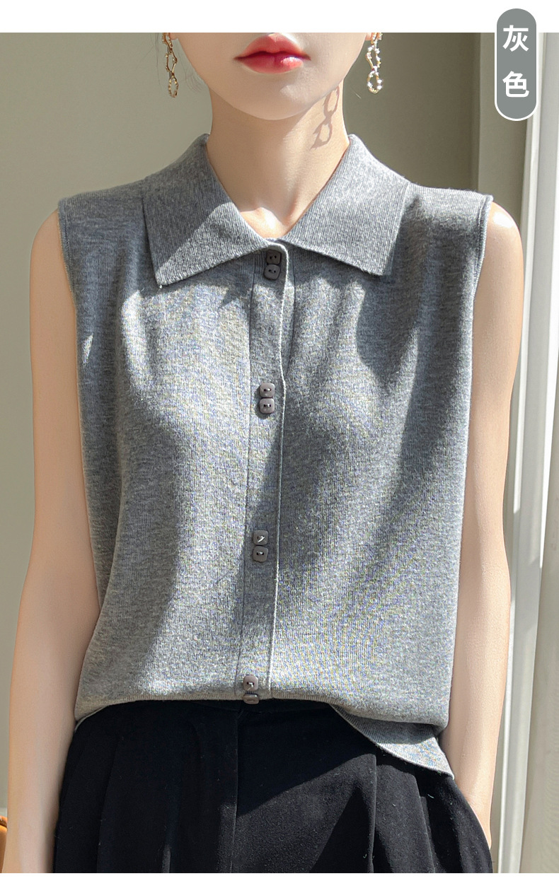 QHJY-JY1086新款POIO领无袖精纺羊毛针织女打底衫纯色翻领内搭叠穿针织背心