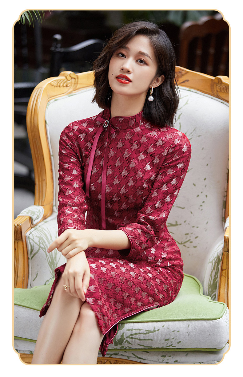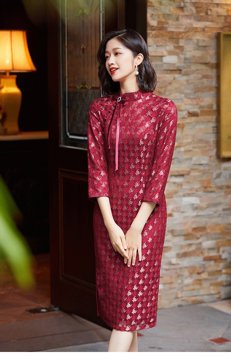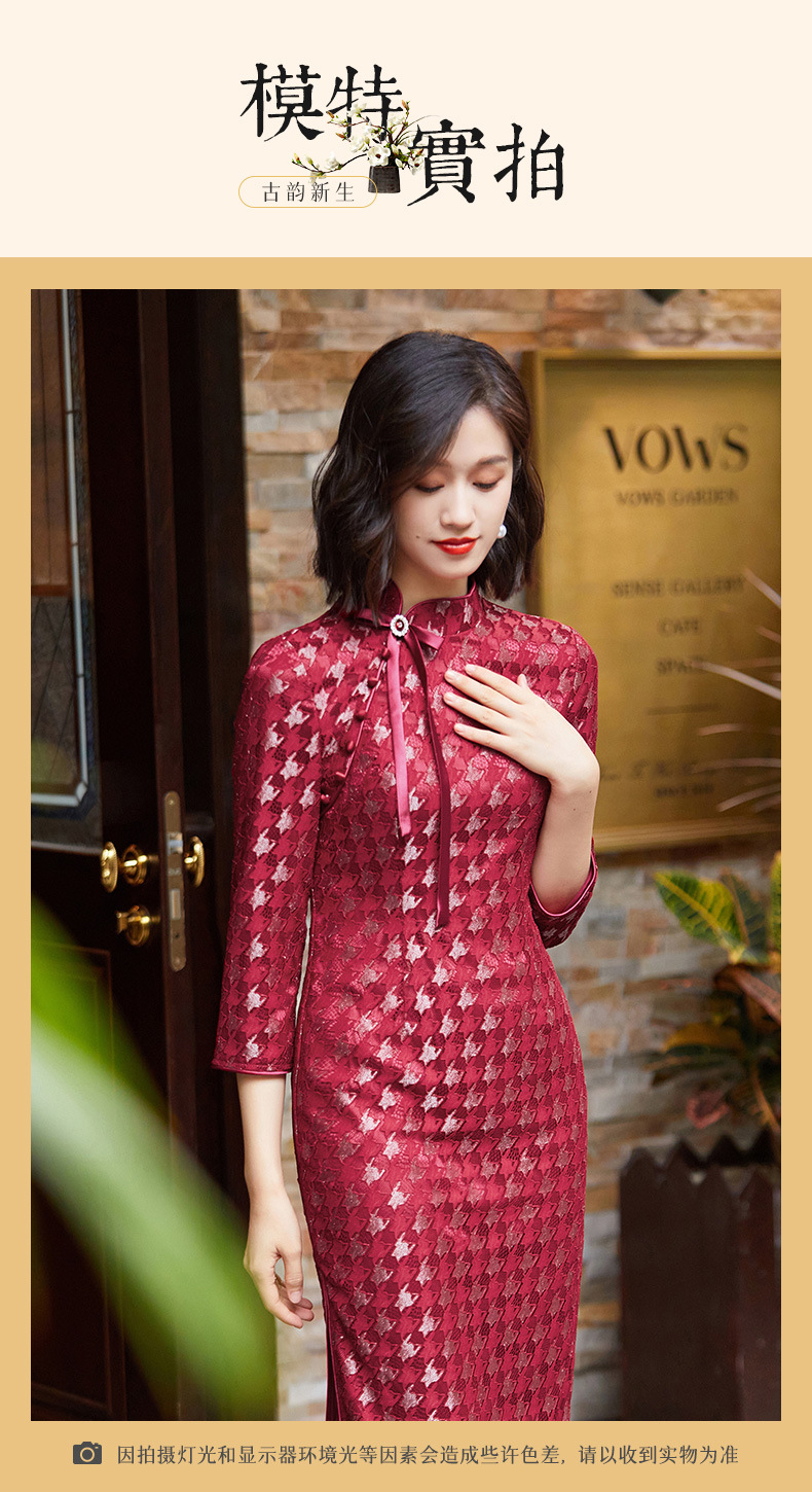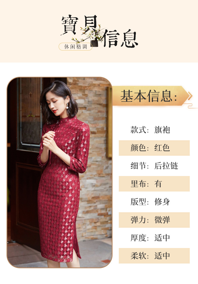 酒红色改良旗袍春装,新款女装中国风蕾丝中长款连衣裙OY-220322