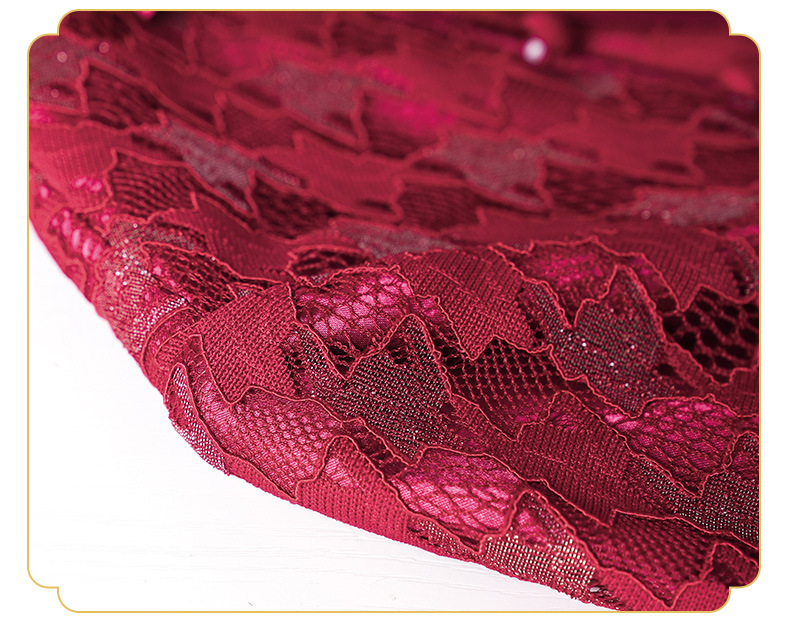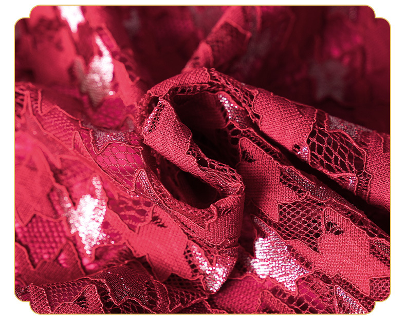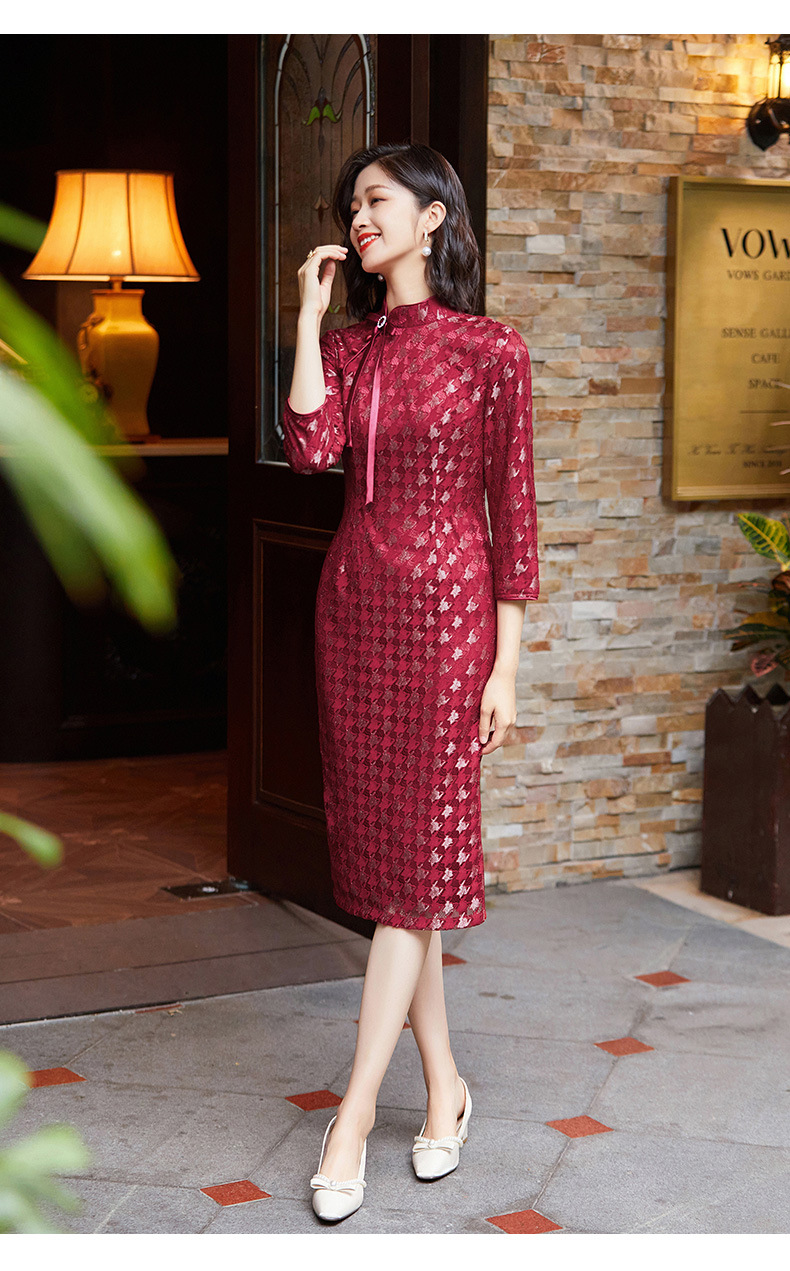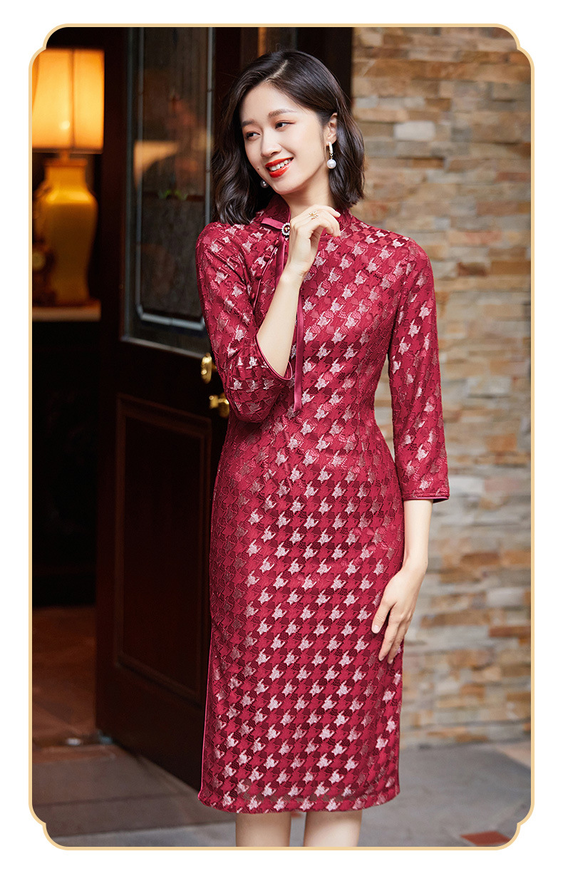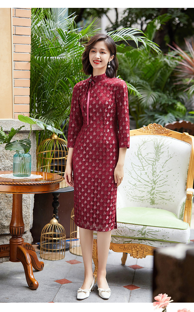 酒红色改良旗袍春装,新款女装中国风蕾丝中长款连衣裙OY-220322