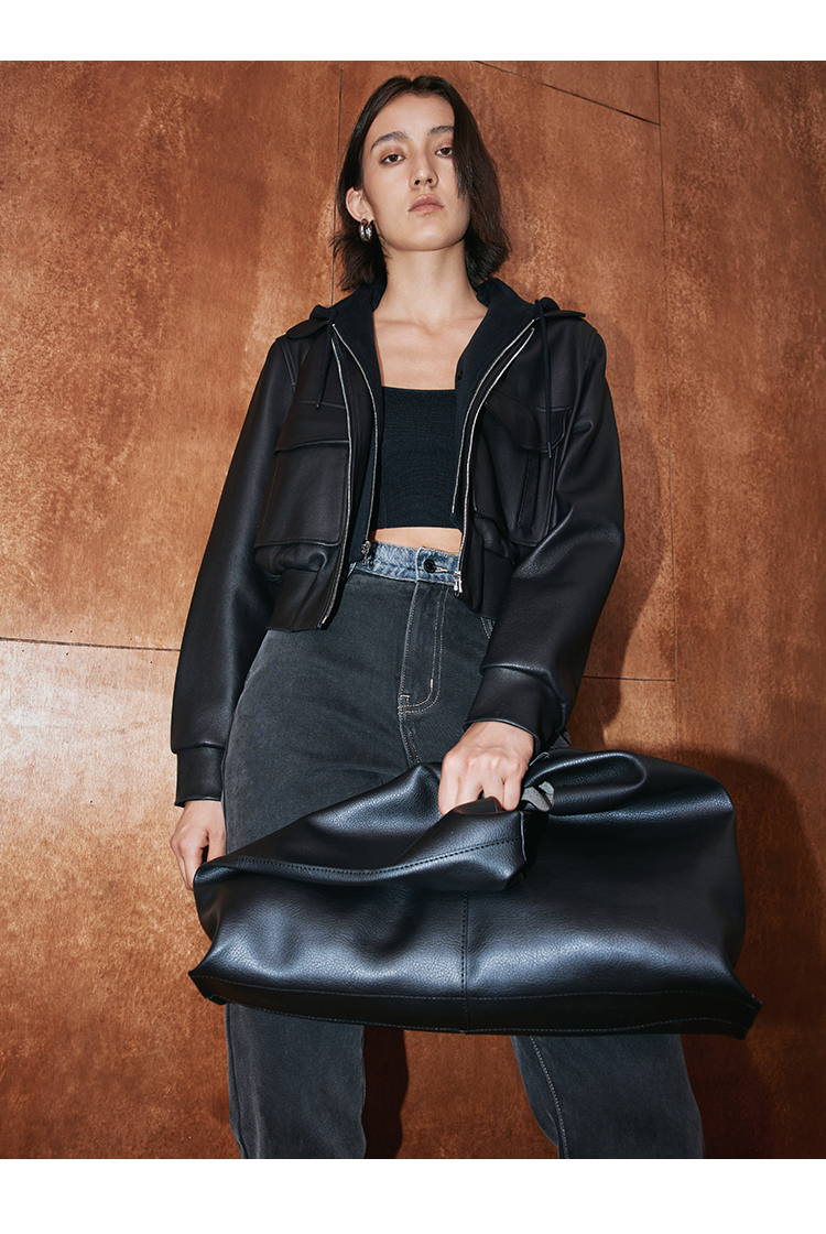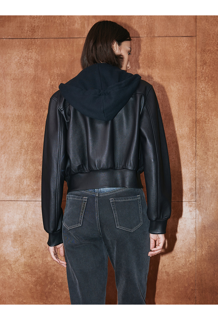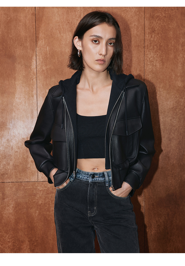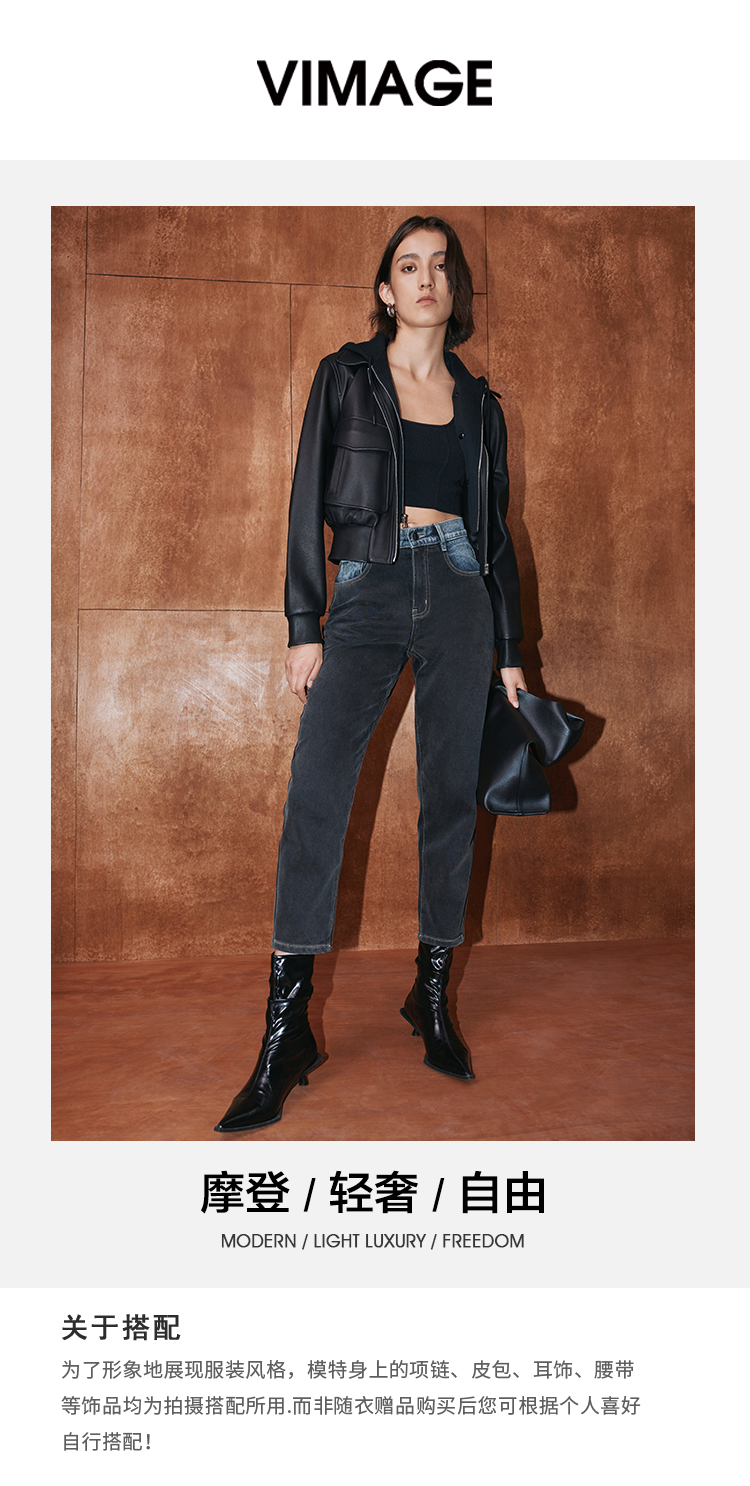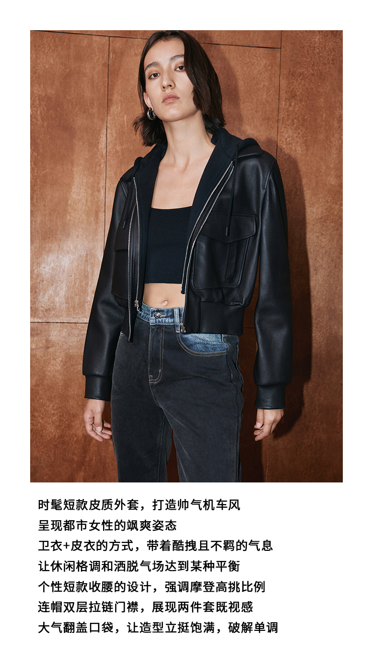 VIMAGE纬漫纪冬季新款个性帅气纯色短款连帽皮衣短外套V2093602