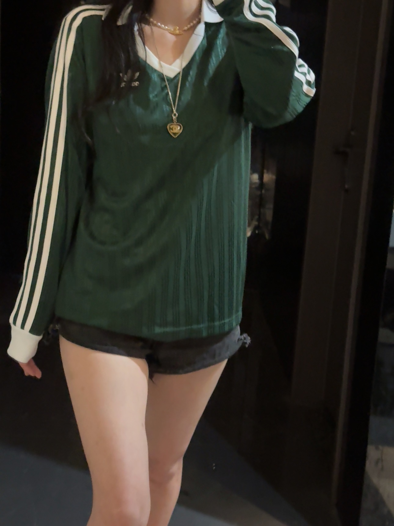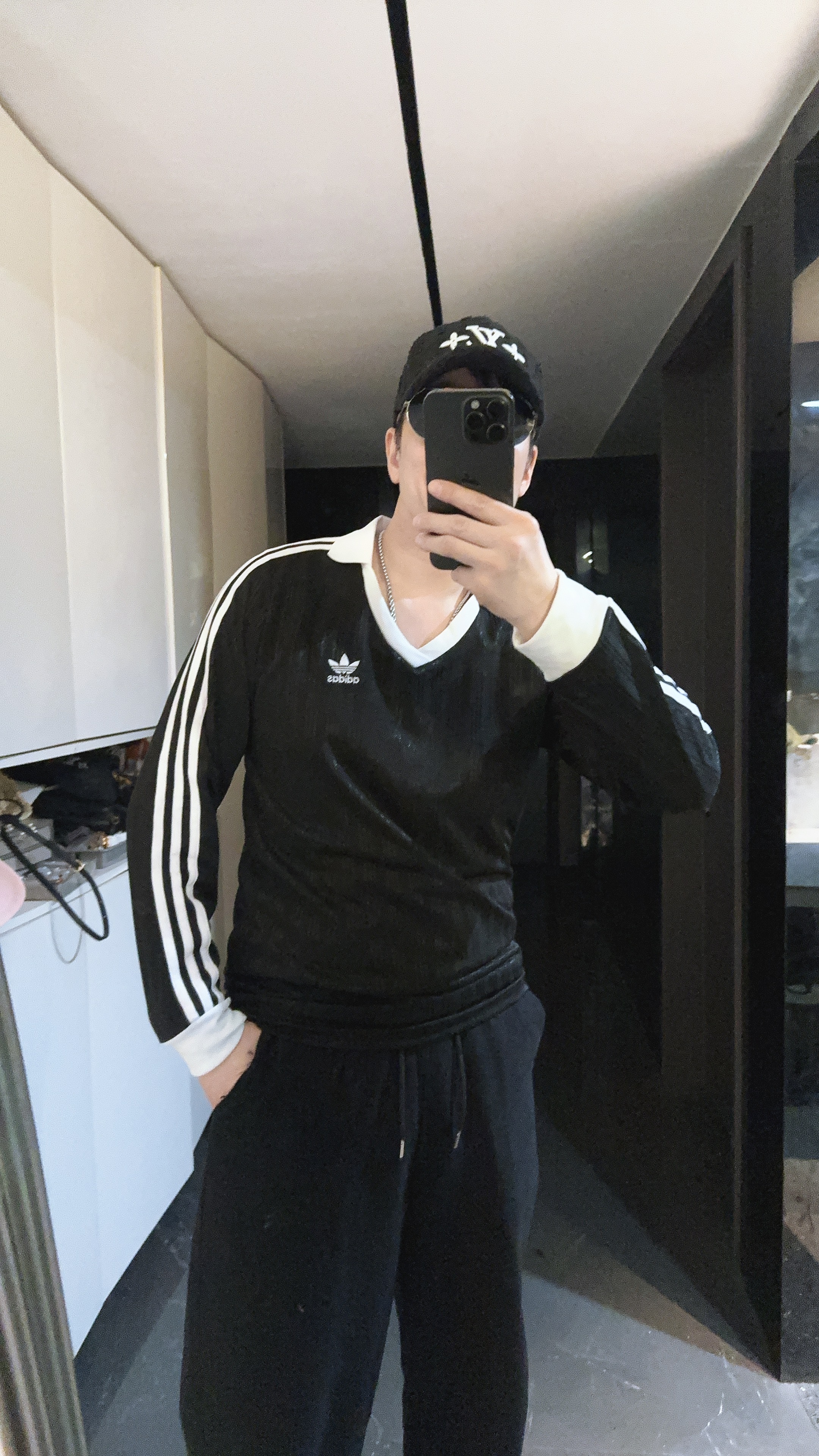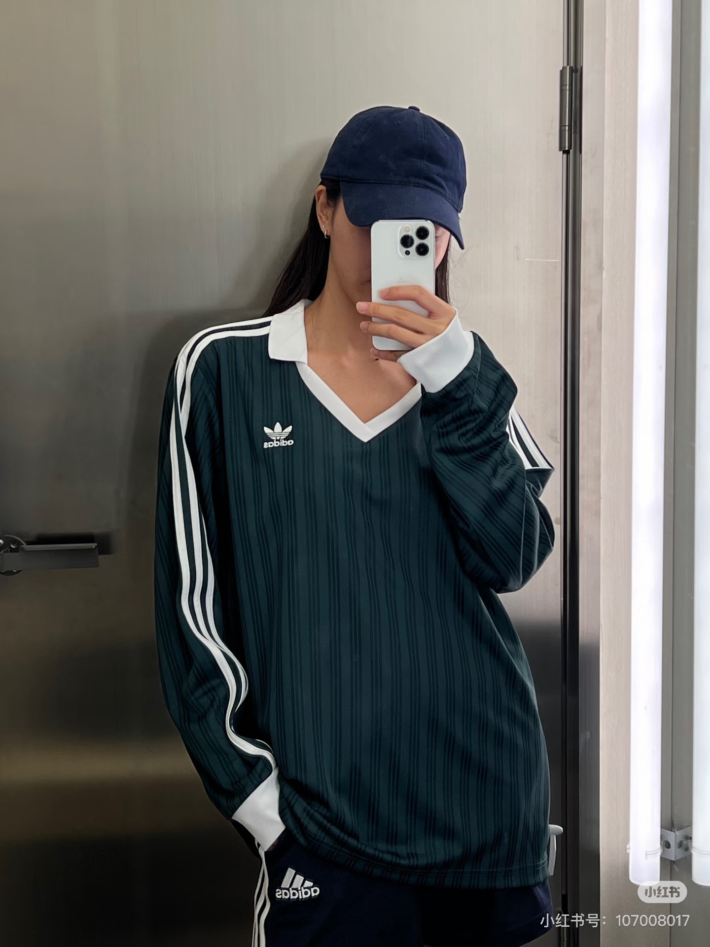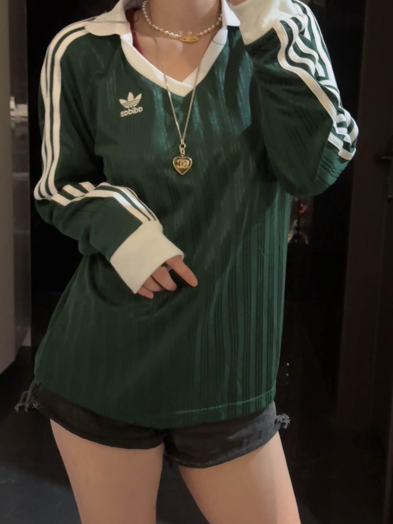 三叶草V领长袖🏈这款三叶草V领长袖,黑色主色调+三条杠,复古运动风满满!冰丝面料超透气,初秋穿刚刚好心宽松版型+翻领V领,修饰颈部线条,休闲又时髦计。日常通勤、运动都能轻松驾驭,搭配短裙或牛仔裤都很出彩!