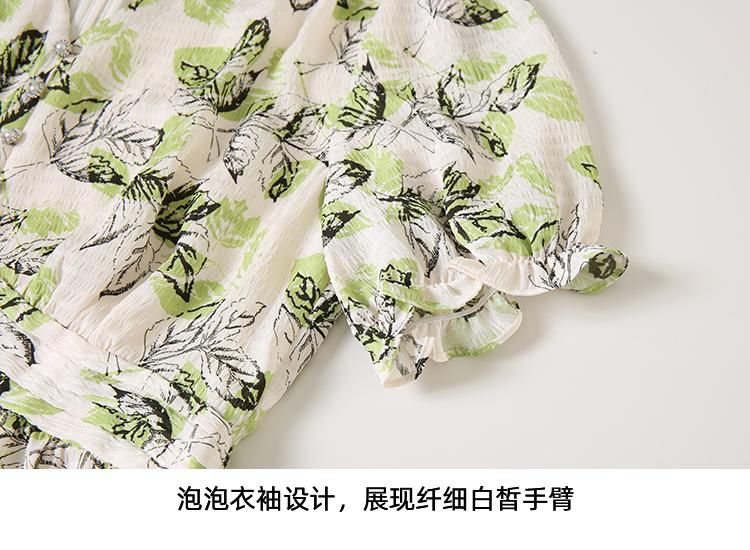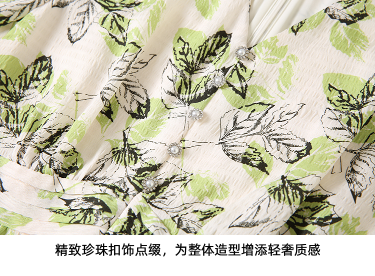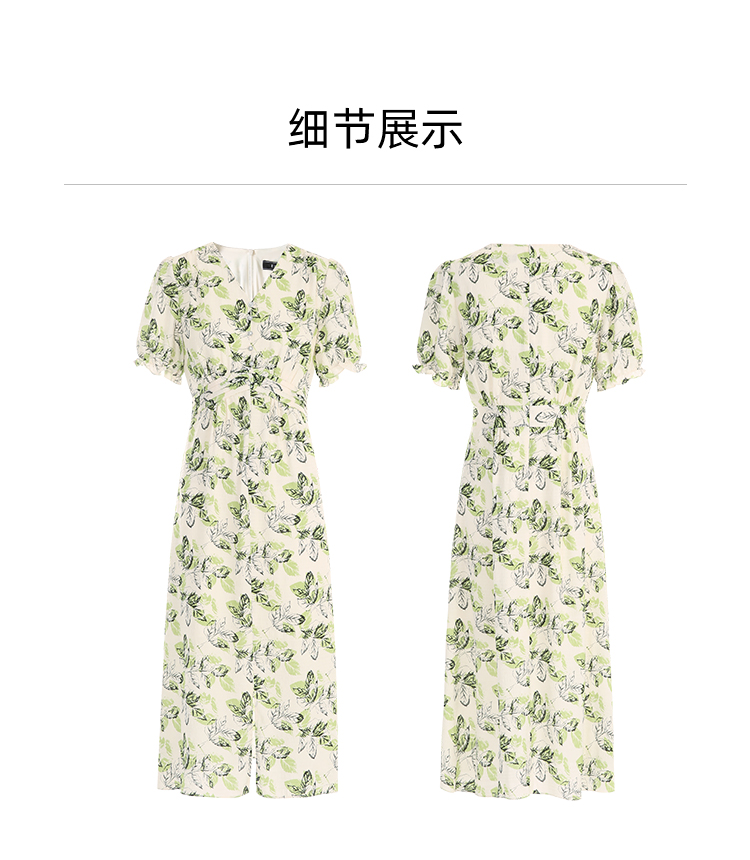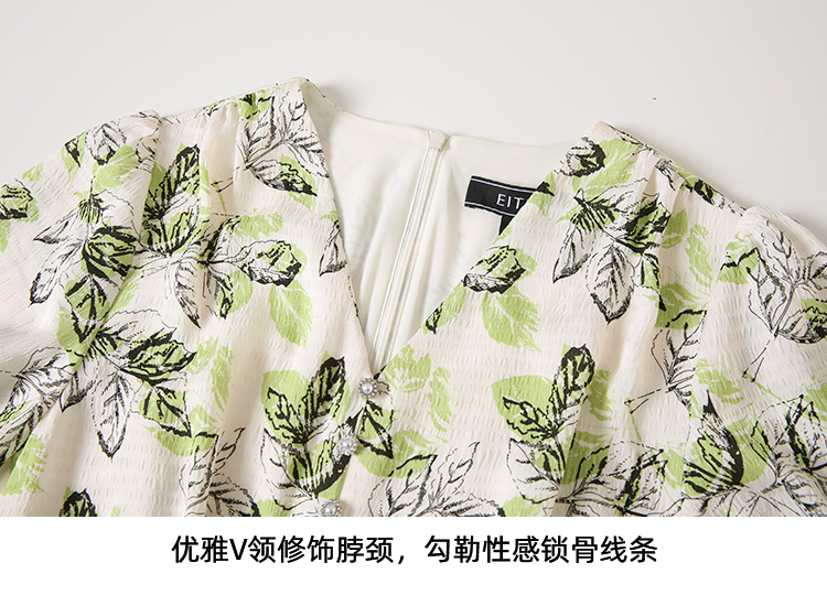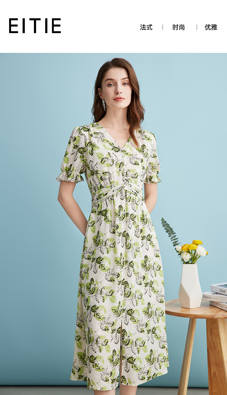 EITIE爱特爱夏季新款夏日清新绿色印花通勤时尚收腰V领连衣裙B2407364