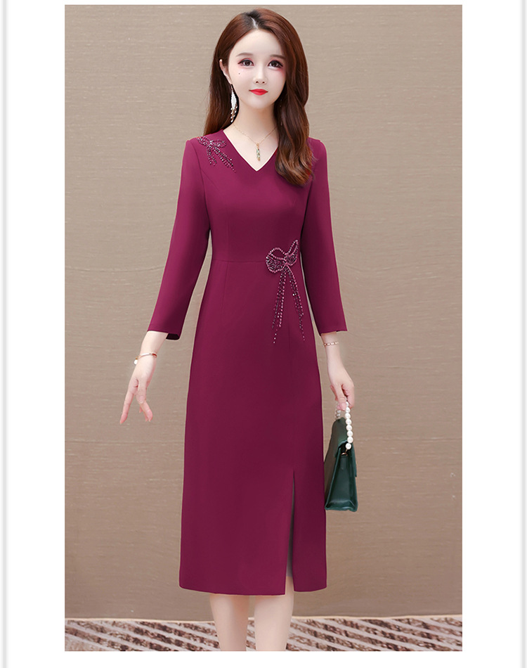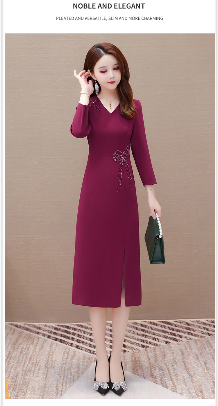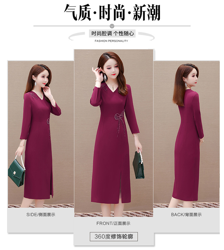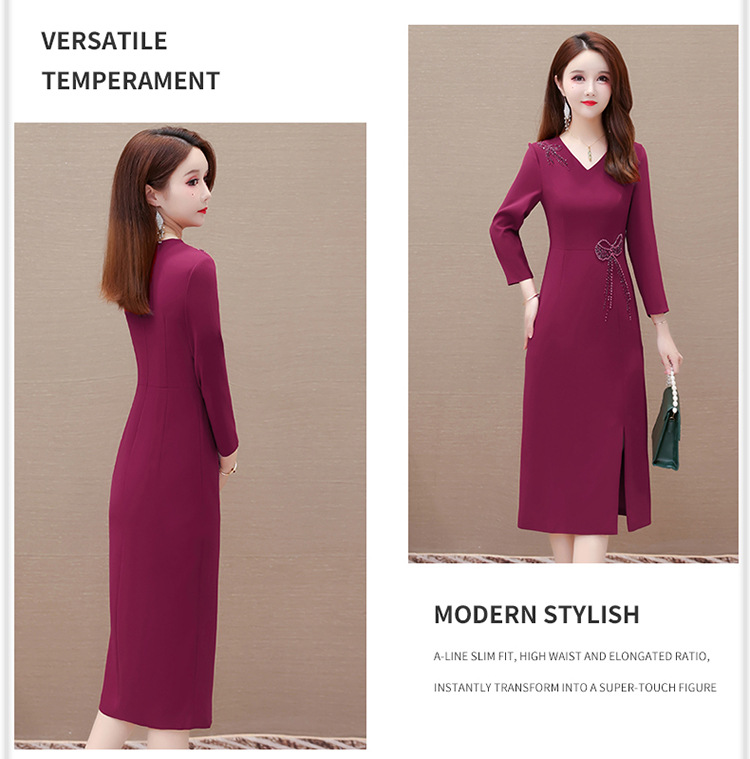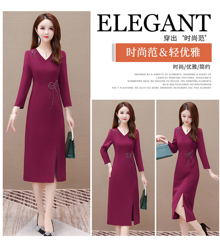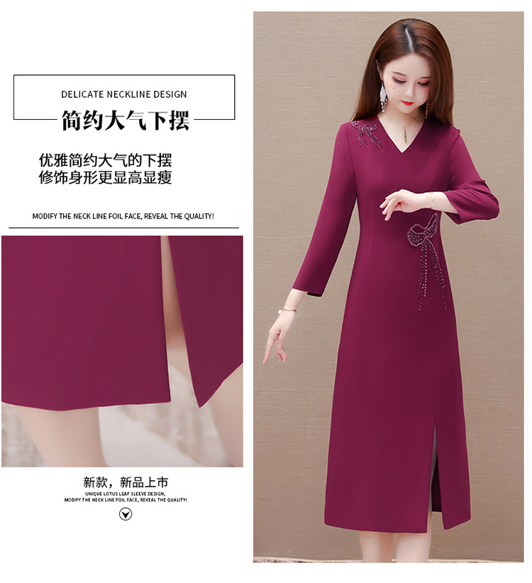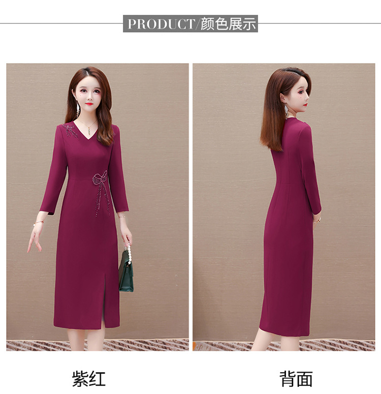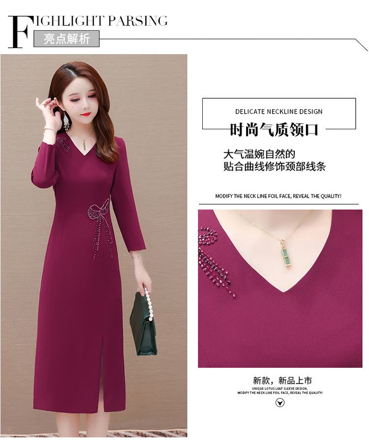 QYM-LRX-JDN8831-1-Y,紫红连衣裙秋季新款钻花中长裙2023年优雅女装中长款开衩A字裙