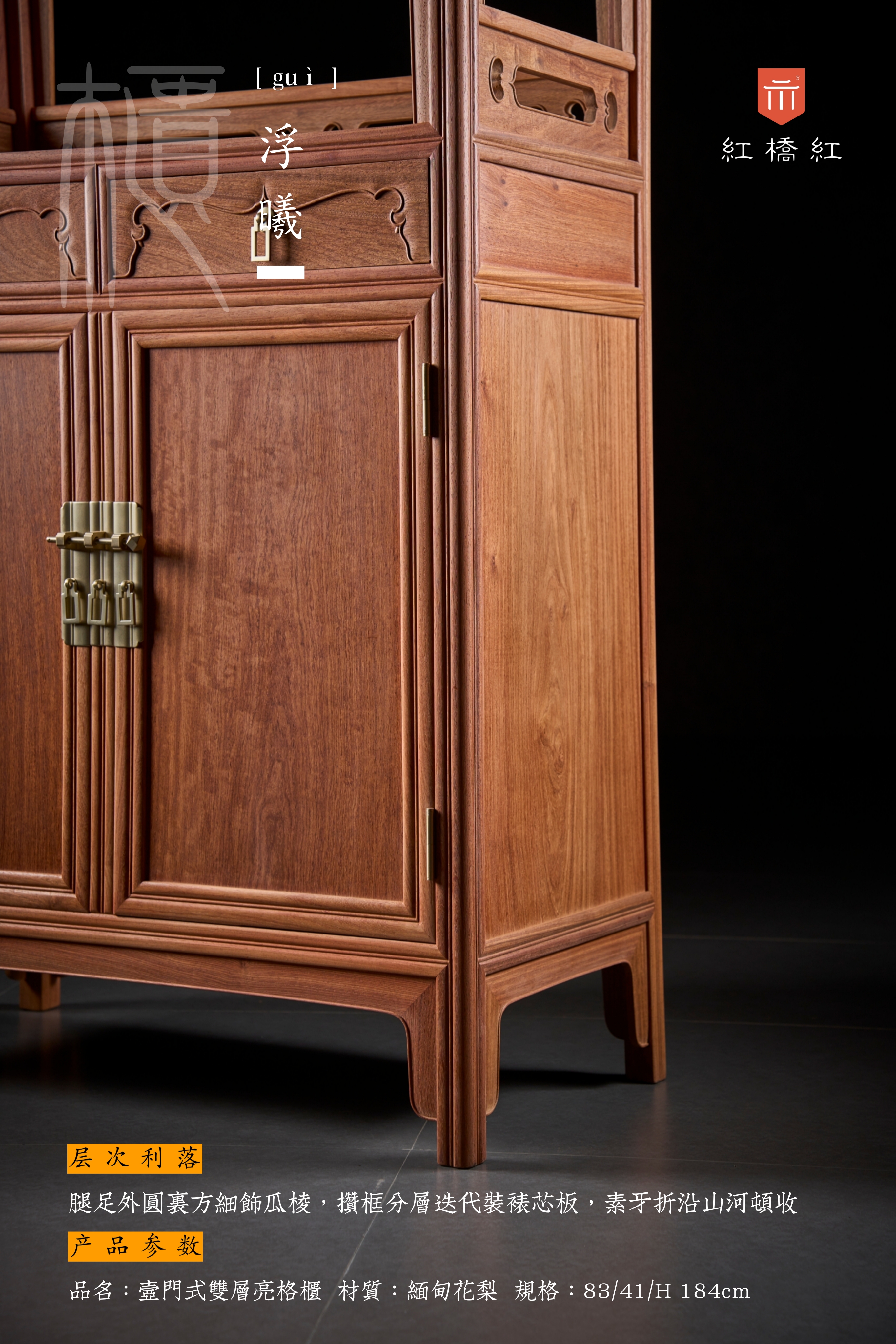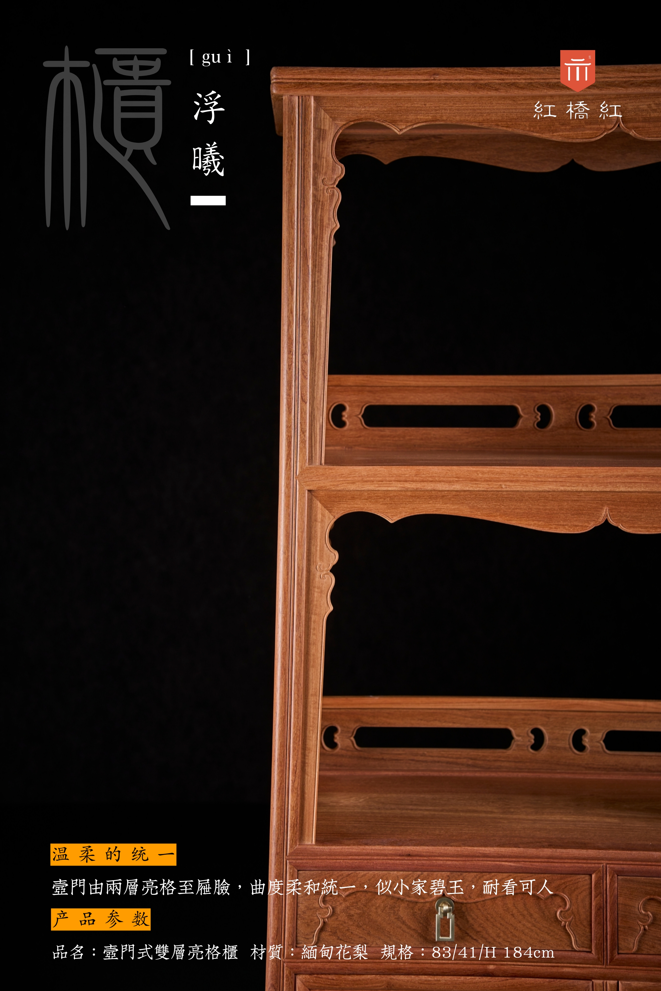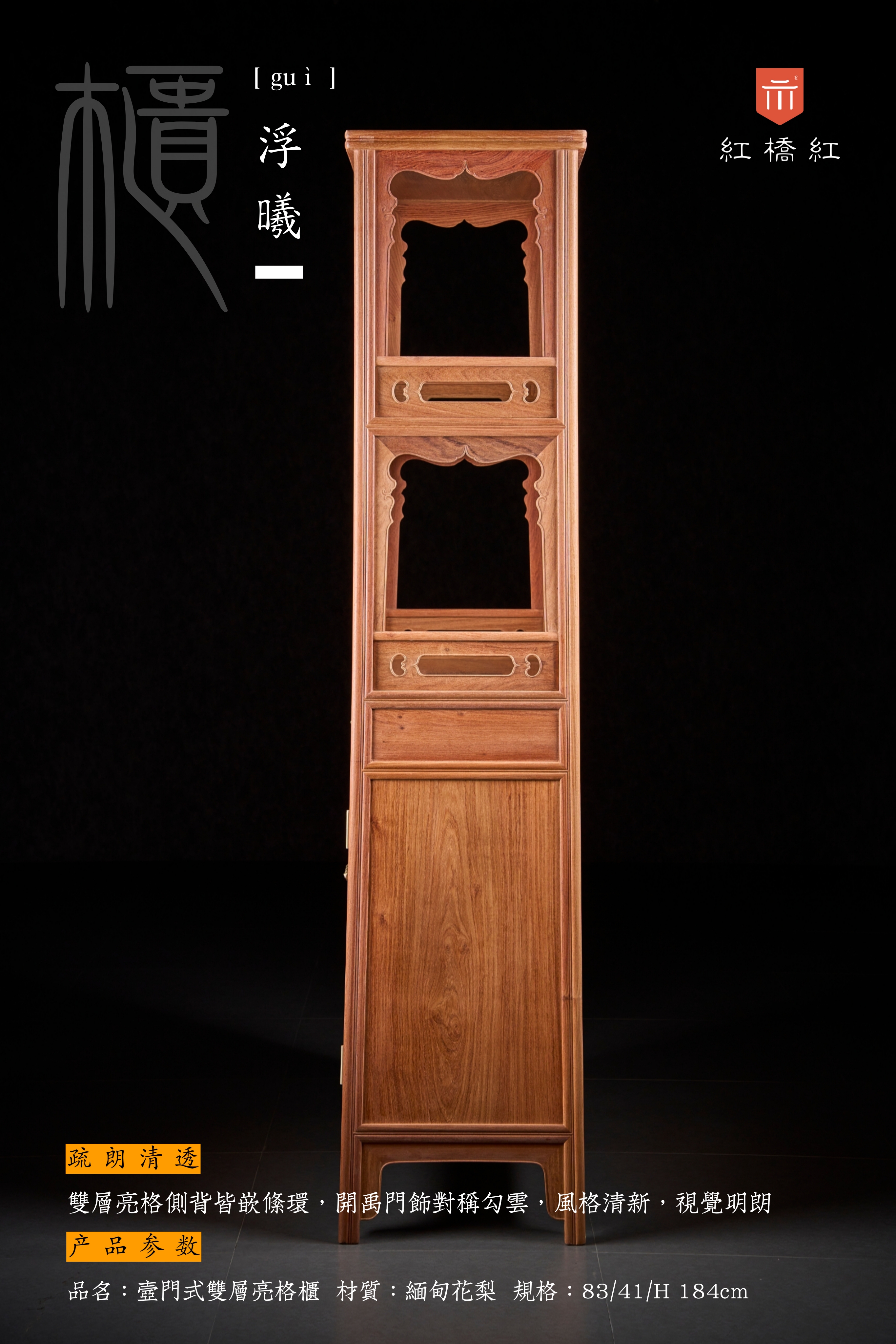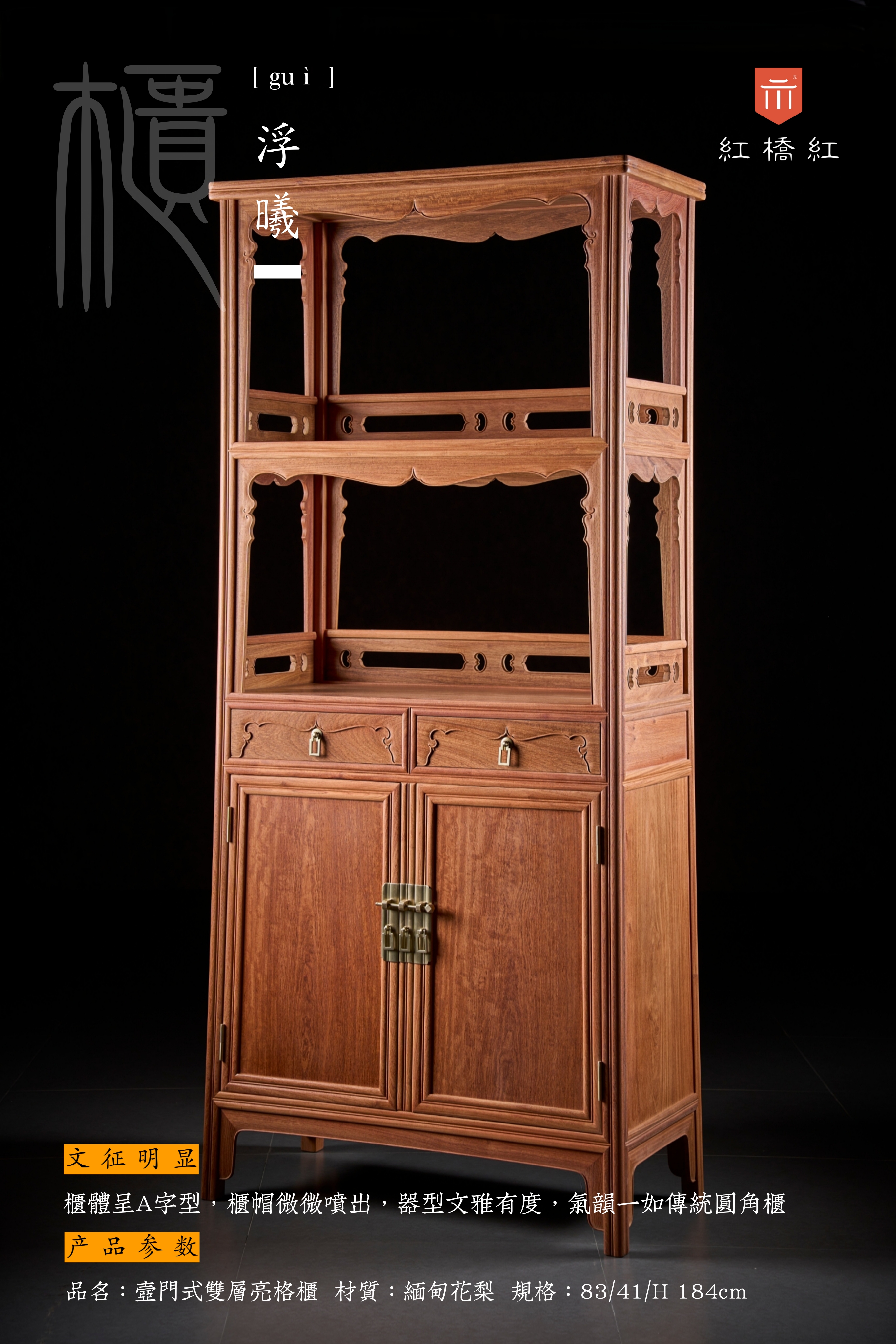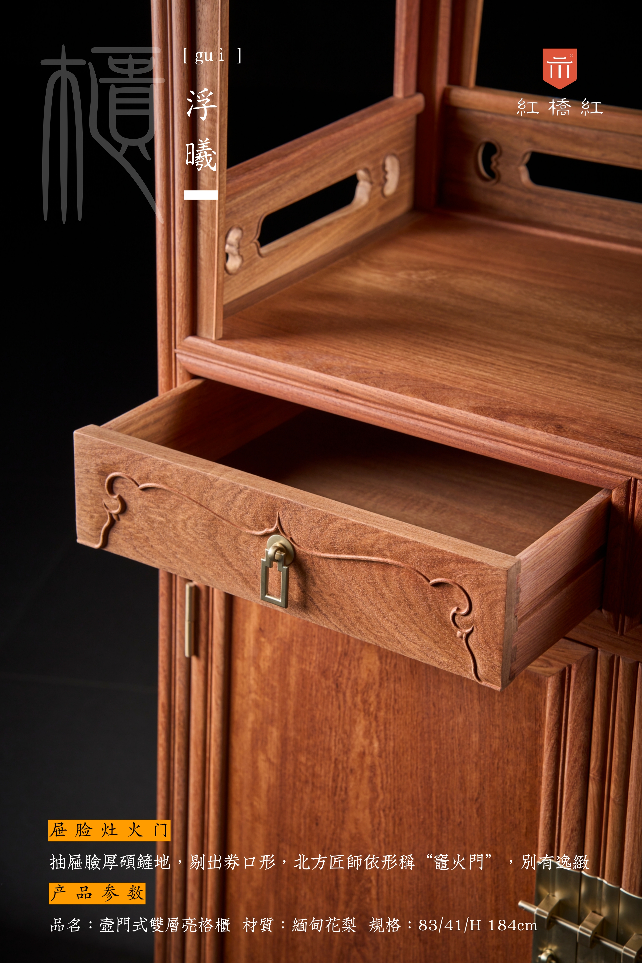整器柜体呈A字型,柜帽微喷出,器型文雅有度,气韵一如传统圆角柜;壸门由两层亮格至屉脸,曲度柔和统一,似小家碧玉,耐看可人;抽屉脸厚硕铲地,剔出券口形,北方匠师依形称“灶火门”,别有逸致。双层亮格侧背皆嵌条环,开禹门饰对称勾云,风格清晰,视觉明朗。茶书皆宜,亮格置雅玩书箱醇酿佳茗,彰精神,柜内大空间存包装杂物,纳实用;层次利落,腿足外圆裹方饰瓜棱,攒框分层迭代装裱芯板,素牙折沿山河顿收;背景强大,表里如一的制器理念,让承载“心头好”的器物本身,也是“心头好”。