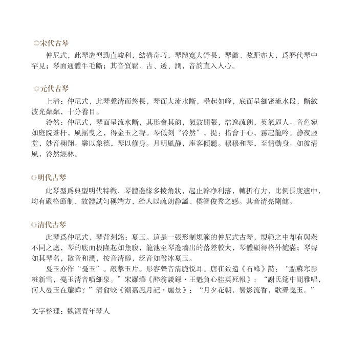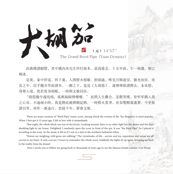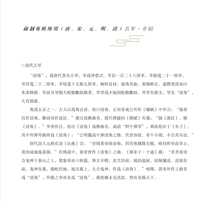 此次使用的唐、宋、元、明、清绝世古琴,让我们可以将不同朝代的古琴音色,通过大师们绝妙的演奏与录音参与创作的理念,将作品完美收录在这张唱片中。