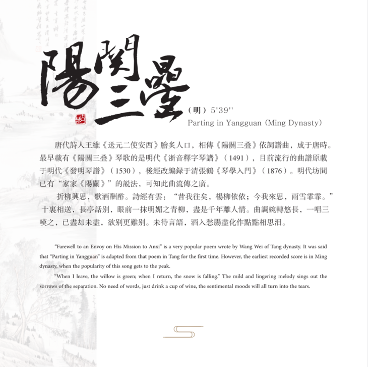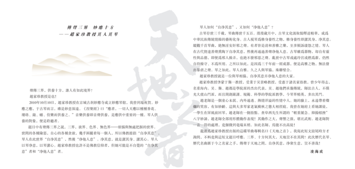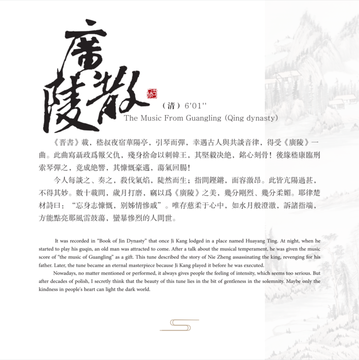 《天地之音》中每一首古琴作品都处理的非常细致,哪怕是最为细枝末节的一个音或是一个抚琴的动作没有一丝多余,高超的技法融于作品,琴人合一,不仅有声响更有动态,旋律活灵活现,用古琴的声音表述出一个独特的“古琴天地”。