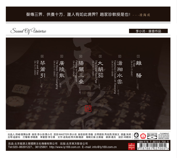 《天地之音》专辑,得到古琴家赵家珍的鼎力支持,著名录音大师李小沛、万小元亲自录制,感谢古琴收藏家马振昌、吴振文提供的唐、宋、元、明、清绝世古琴,让我们可以将不同朝代的古琴音色,通过大师们绝妙的演奏与录音参与创作的理念,将作品完美收录在这张唱片中。