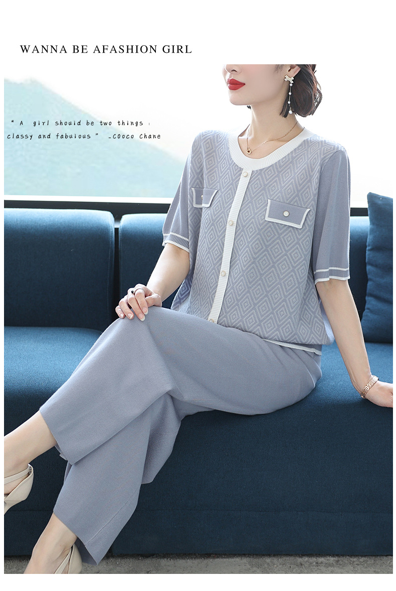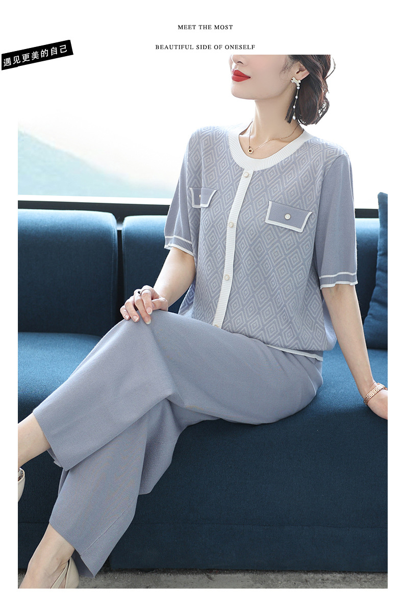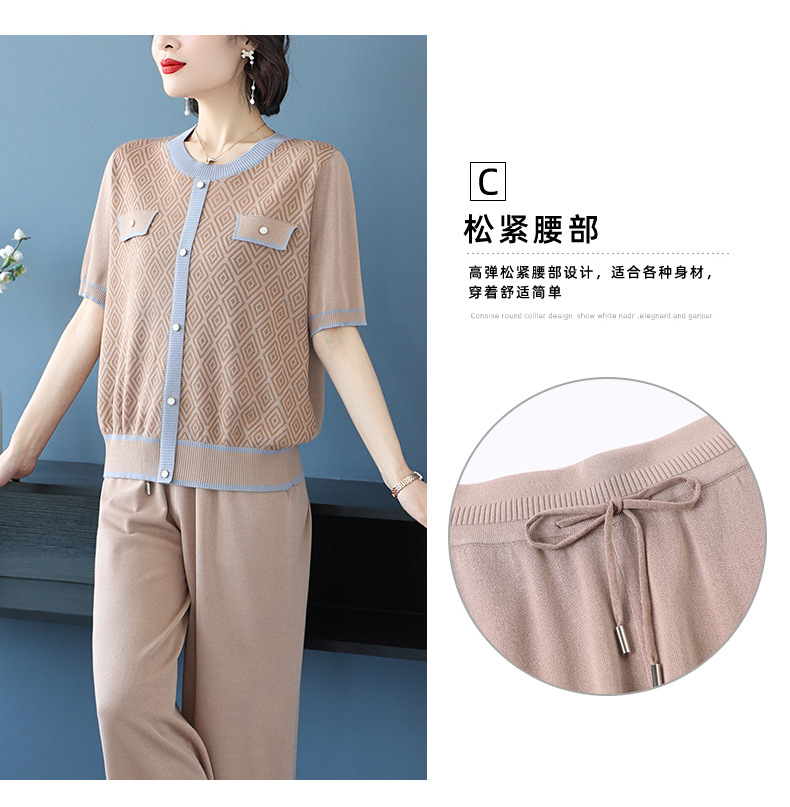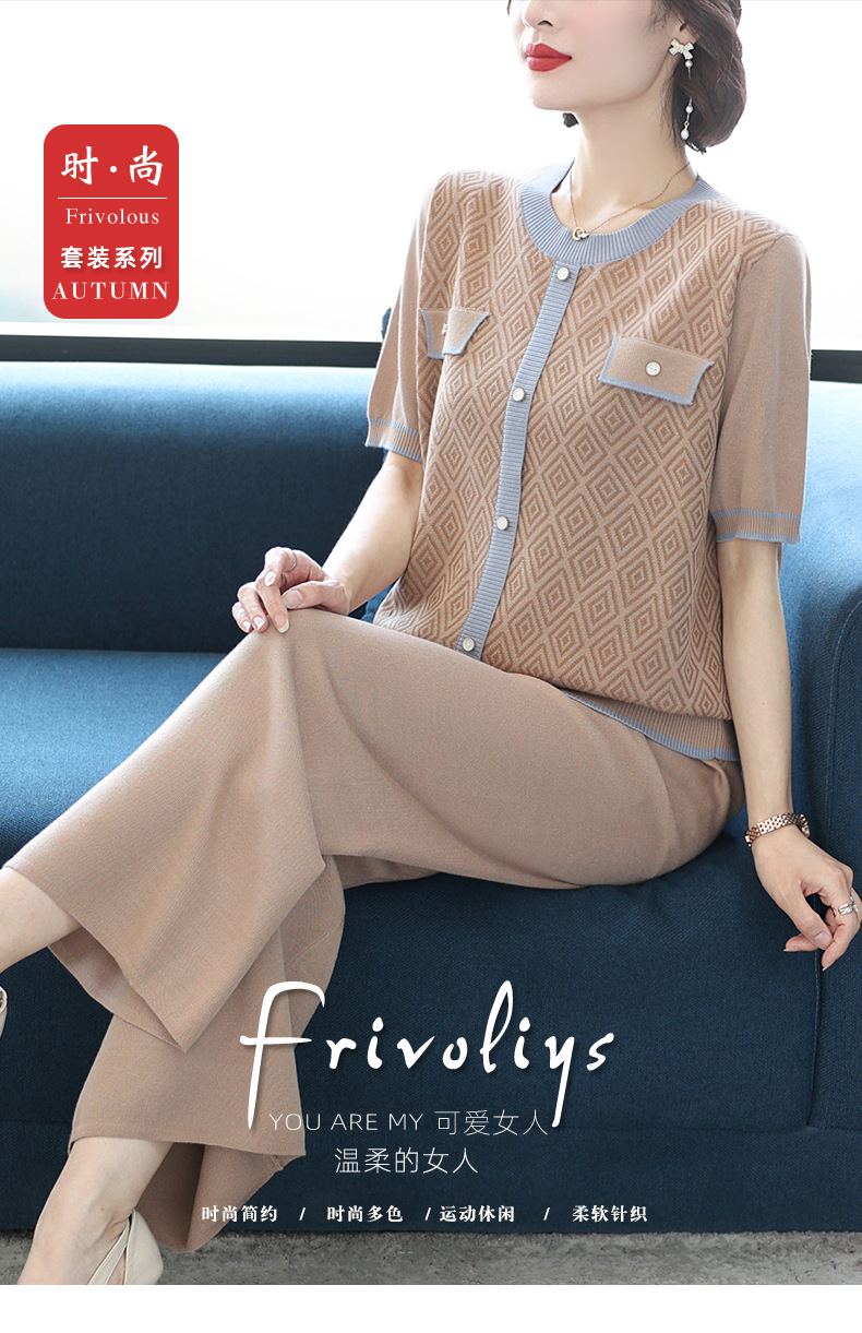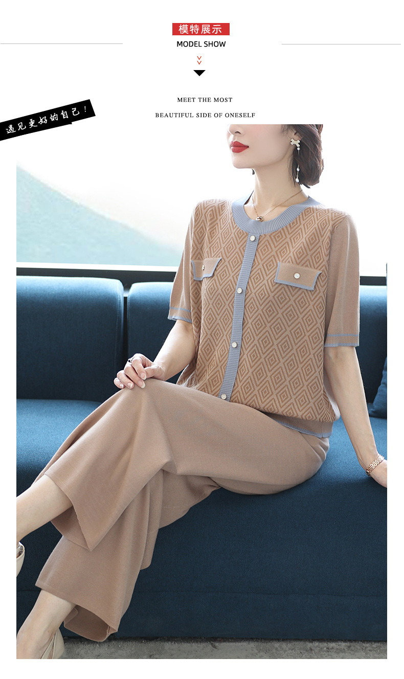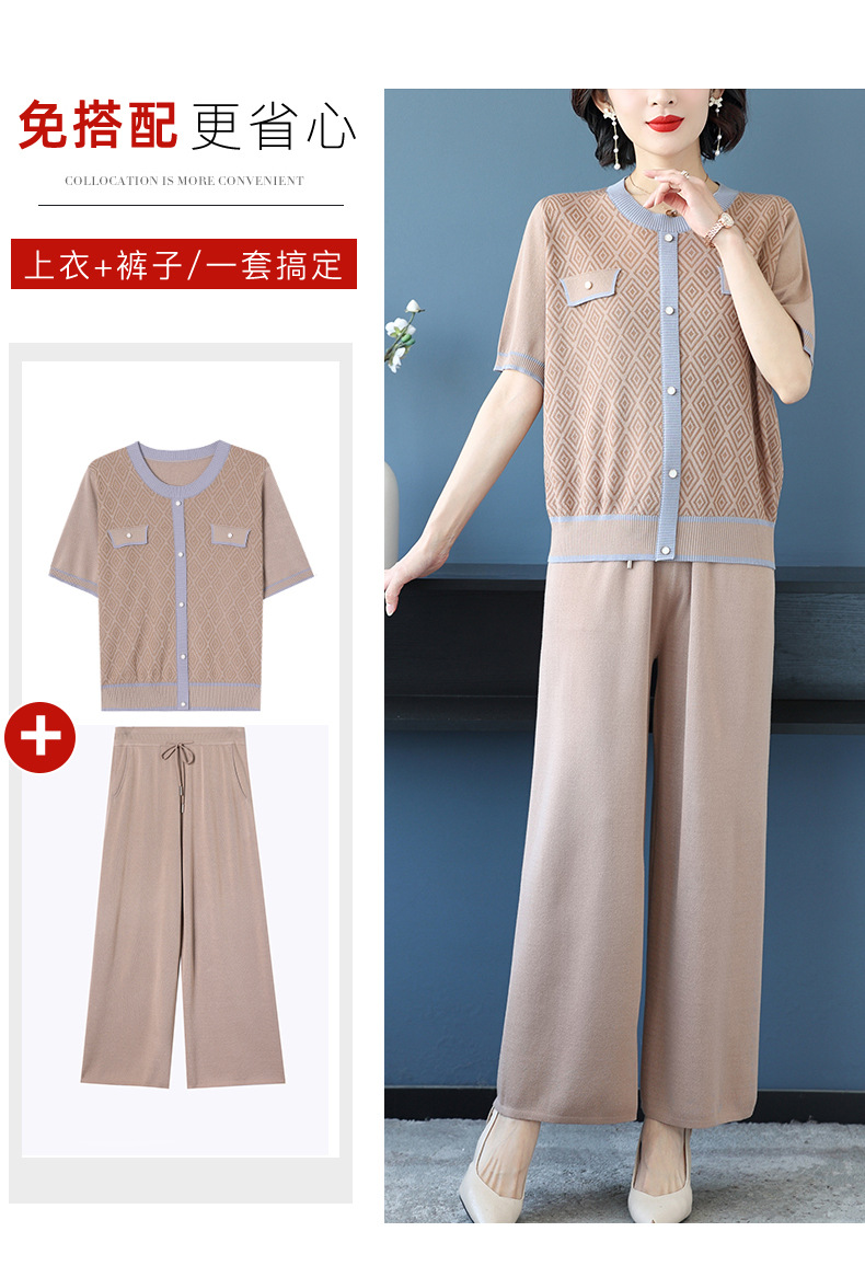 E2256气质女装中年妈妈时尚阔腿裤套装夏季短袖薄款冰丝针织休闲两件套