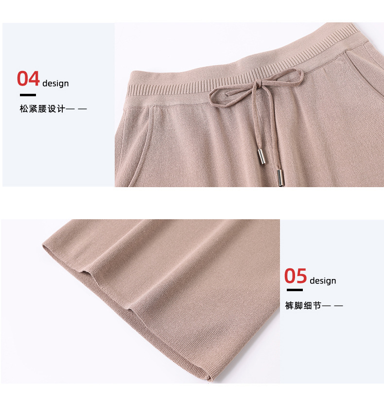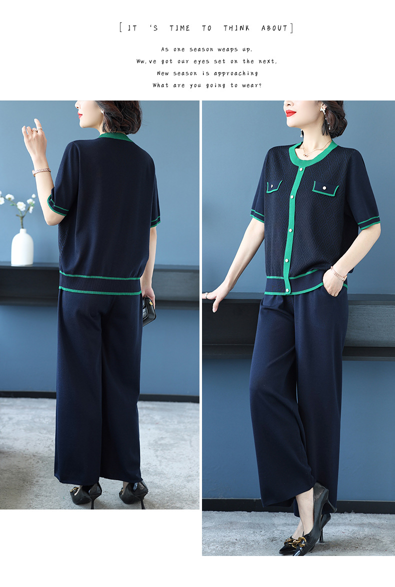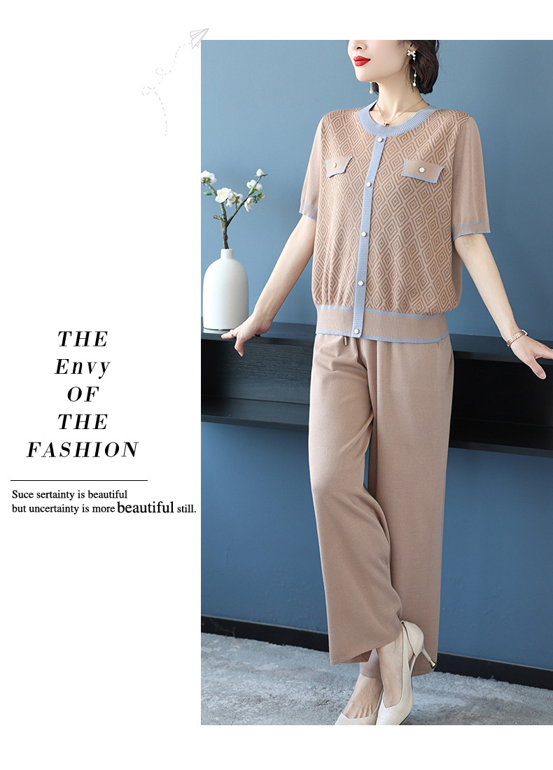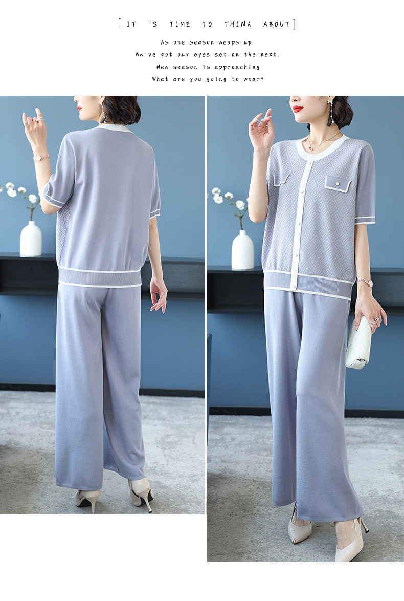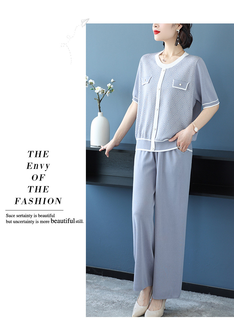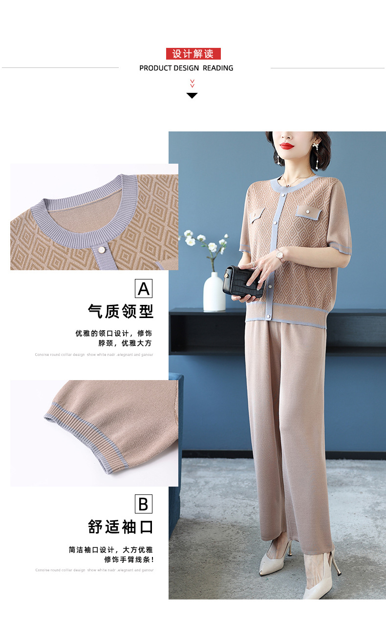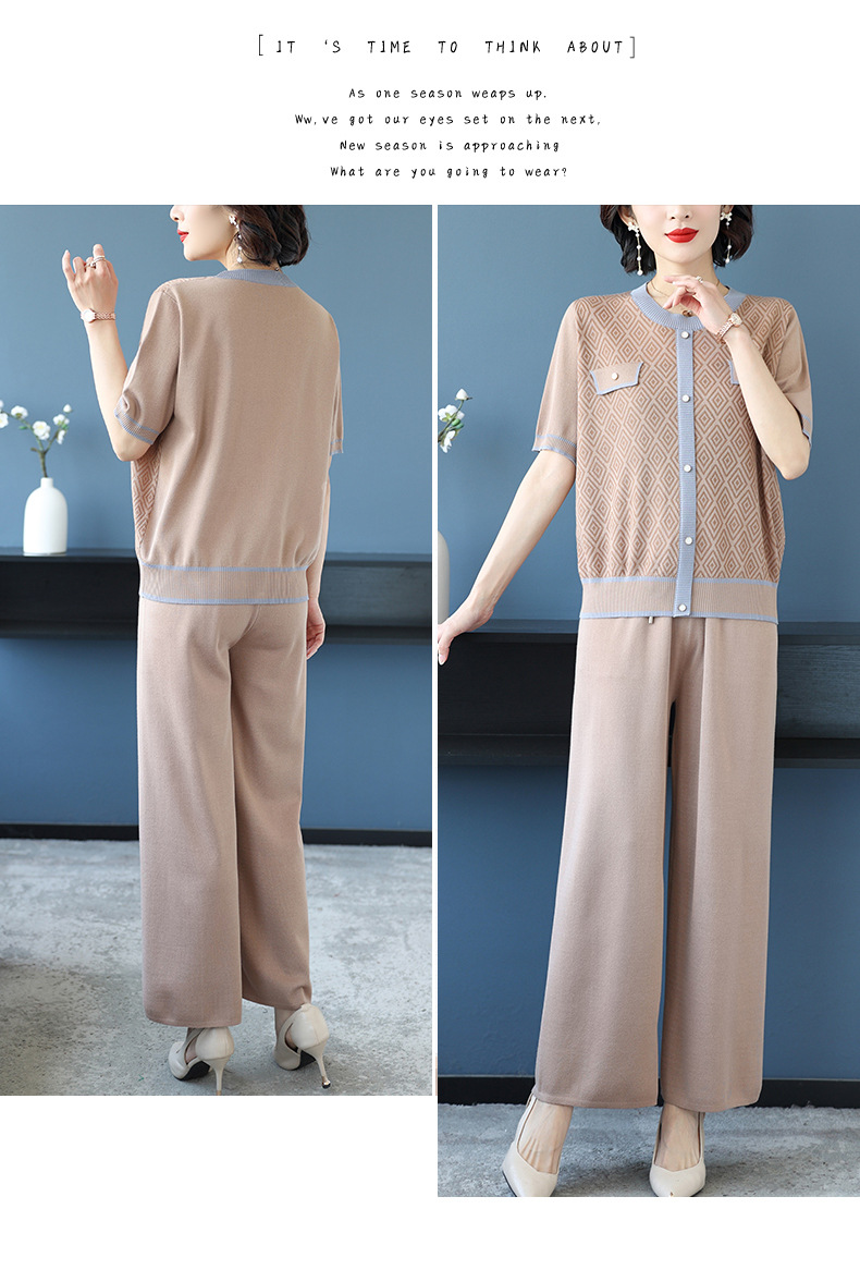 E2256气质女装中年妈妈时尚阔腿裤套装夏季短袖薄款冰丝针织休闲两件套