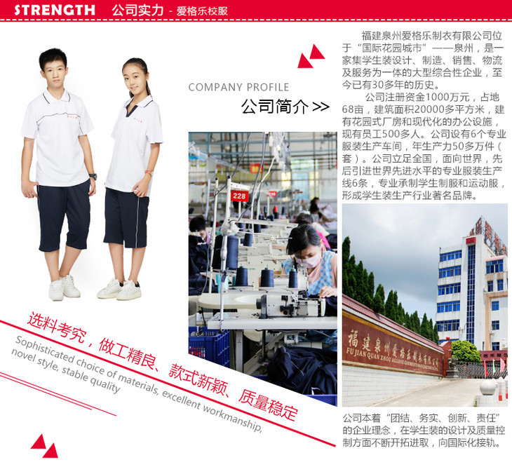 爱格乐制衣有限公司,是集学生服装生产、销售、物流及服务为一体的大型综合性企业。以优质的产品和服务为教育事业贡献力量。
