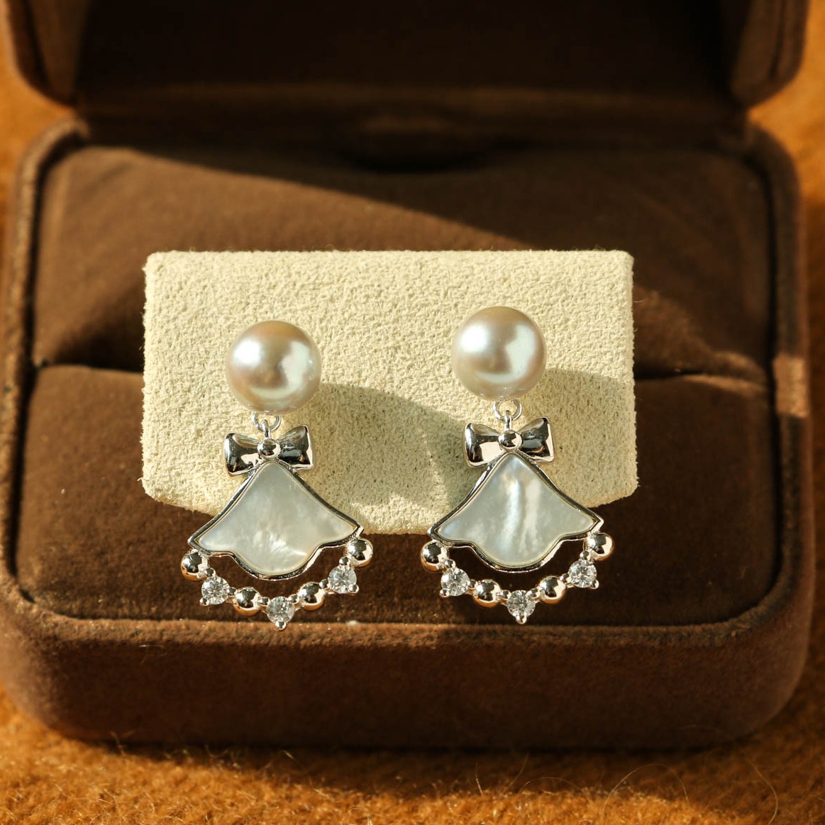 铃铛款,akoya灰珠,纯银配件+贝壳镶嵌,整体佩戴很漂亮的一款。